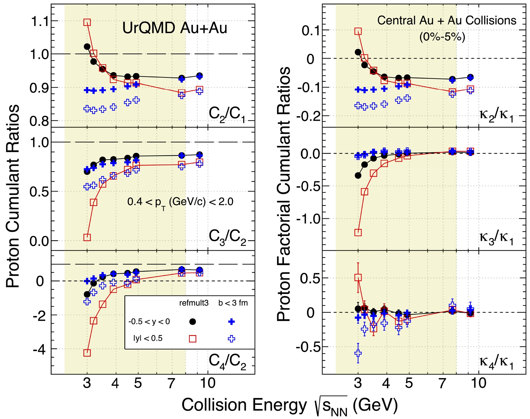 High moments of conserved quantities, such as net-baryon, net-electric charge, and net-strangeness, in heavy-ion collisions are sensitive to fluctuations caused by the quantum chromodynamics critical point (CP). The event-by-event analysis of high moments of the conserved charges has been widely used in experiments to search for the CP, particularly in the RHIC-STAR experiment. To establish a dynamical non-critical baseline, particularly in the high baryon density region, we performed a systematic analysis of the proton multiplicity distributions from Au+Au collisions at\begin{document}$ 3 \leq \sqrt{s_{NN}} \leq 9.2 $\end{document} GeV. The beam energy, centrality, and rapidity width dependence of proton (factorial) cumulants, up to the \begin{document}$ 4^{\rm th} $\end{document} order, were extracted from the calculations of a hadronic transport model called the ultra-relativistic quantum molecular dynamics (UrQMD) model. In addition, the effects of the initial volume fluctuation are discussed. These results will be important for the physics analysis of the RHIC Beam Energy Scan (BES) data, particularly for the fixed-target data and experimental data from future CBM experiments at FAIR.