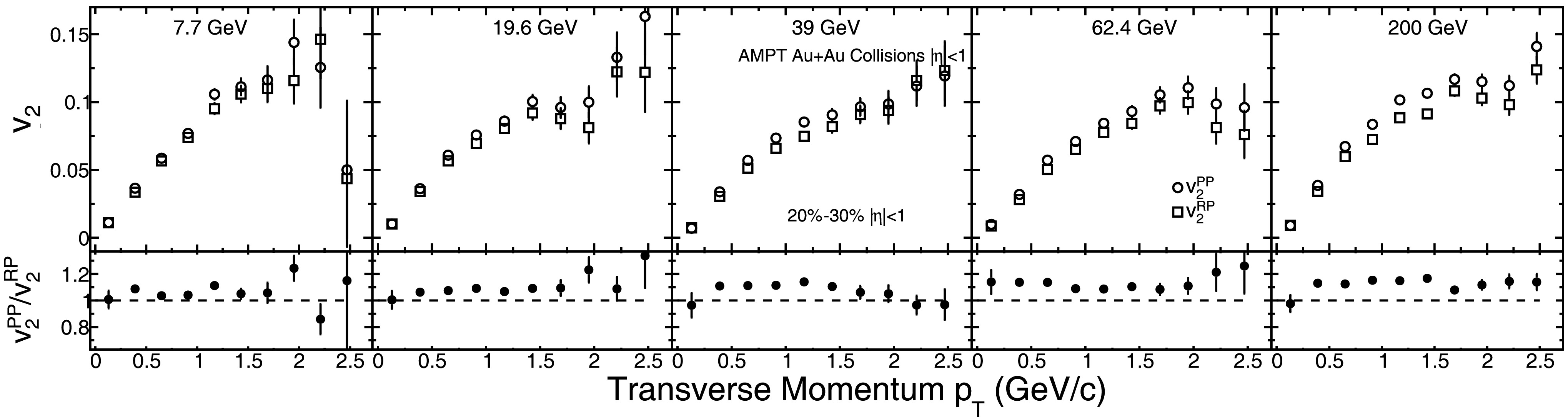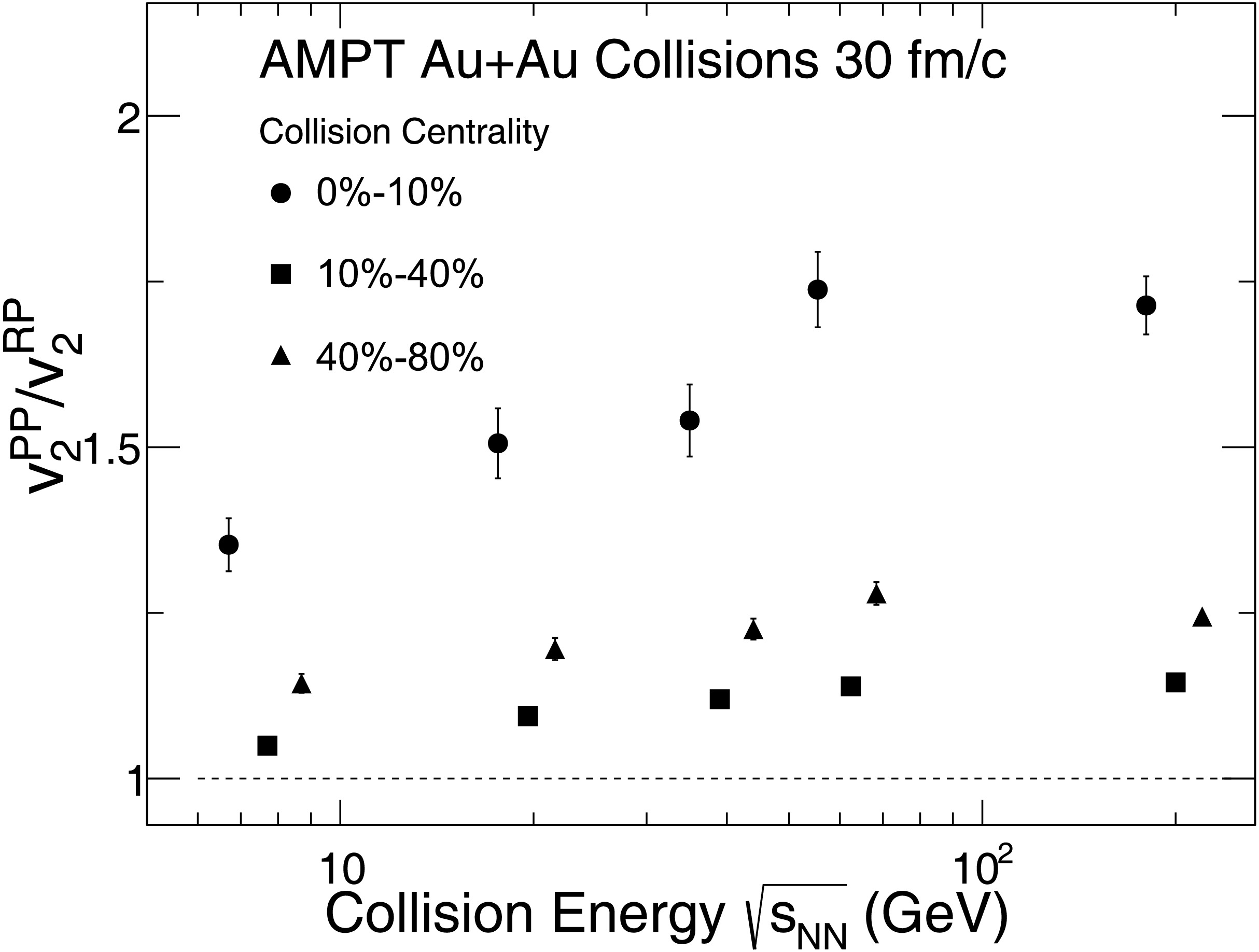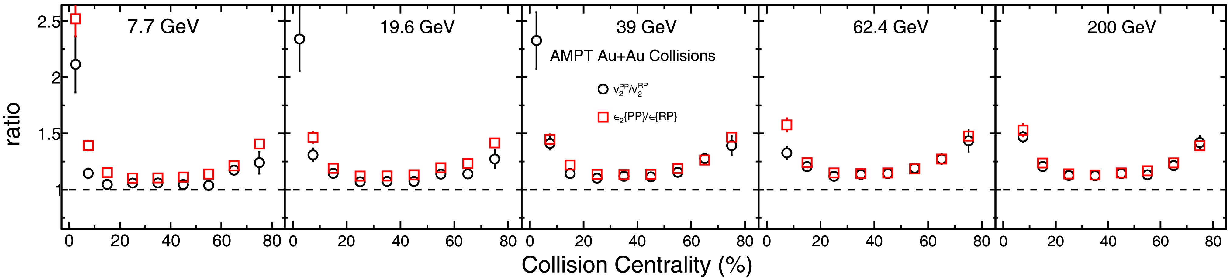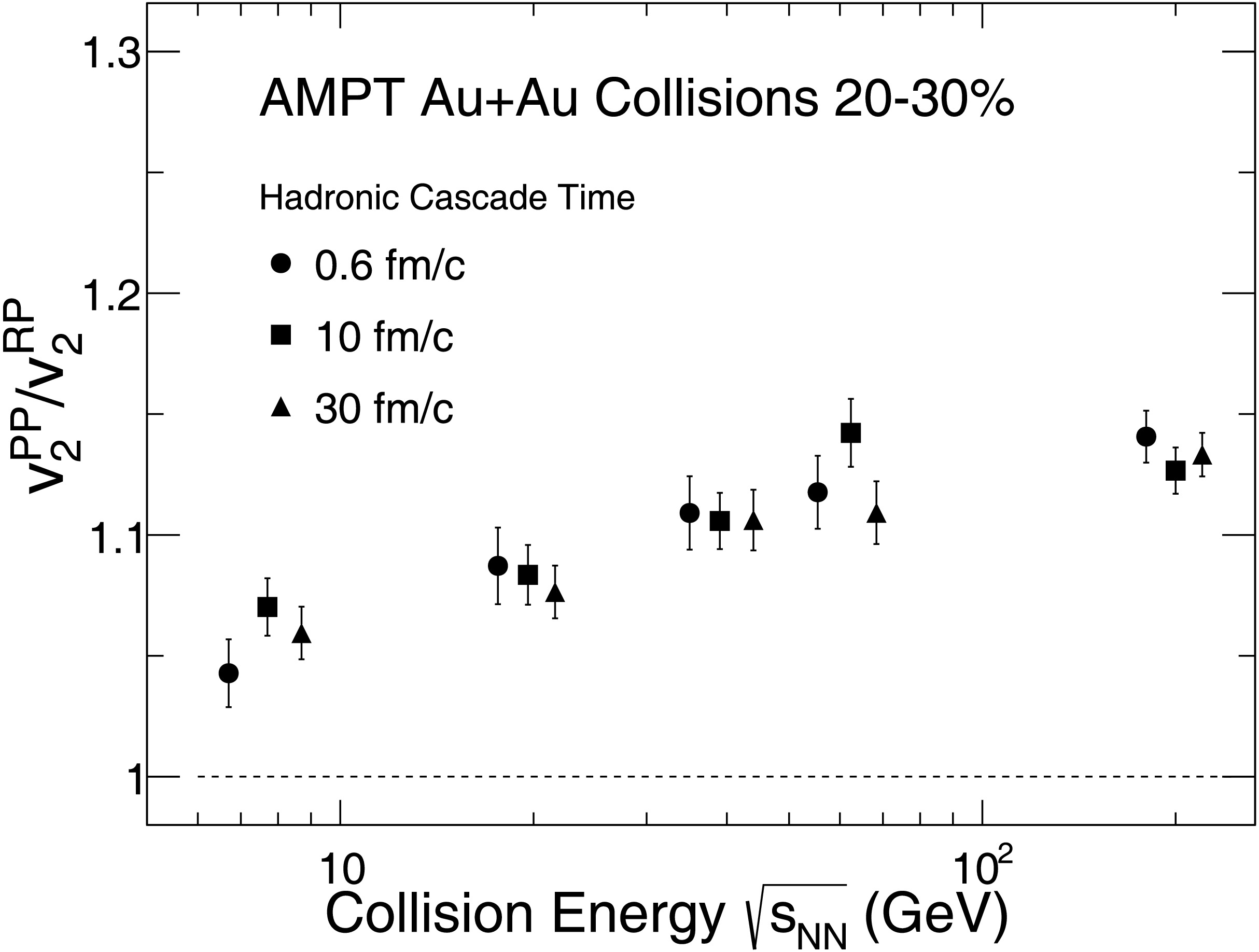 We present a systematic study of the elliptic flow\begin{document}$ v_2 $\end{document} relative to the participant plane (PP) and reaction plane (RP) in Au+Au collisions at \begin{document}$ \sqrt{s_{NN}} = 7.7 $\end{document} −200 GeV using the AMPT model (string melting version). The ratio \begin{document}$ v_{2}^{\text{PP}} $\end{document} /\begin{document}$ v_{2}^{\text{RP}} $\end{document} is investigated under different hadronic cascade times (0.6 fm/c, 10 fm/c, and the maximum evolution time) and across various collision centralities. The results show that, at a fixed collision energy, the ratio exhibits negligible sensitivity to the duration of the hadronic rescattering stage, indicating that hadronic interactions have a minimal effect on the relative difference generated by initial-state fluctuations. However, a strong energy dependence is observed: the ratio increases with beam energy and saturates above \begin{document}$ \sqrt{s_{NN}} \approx 62.4 $\end{document} GeV, a trend that persists across all centralities. These findings highlight the dominant role of the partonic phase in converting initial-state geometry fluctuations into final-state momentum anisotropy. Conversely, at lower energies, the reduced partonic interaction strength limits the efficiency of this conversion, weakening the system’s ability to preserve the initial geometric information. Our results suggest that the conversion of initial geometric fluctuations into final momentum anisotropy requires sufficient partonic interactions.