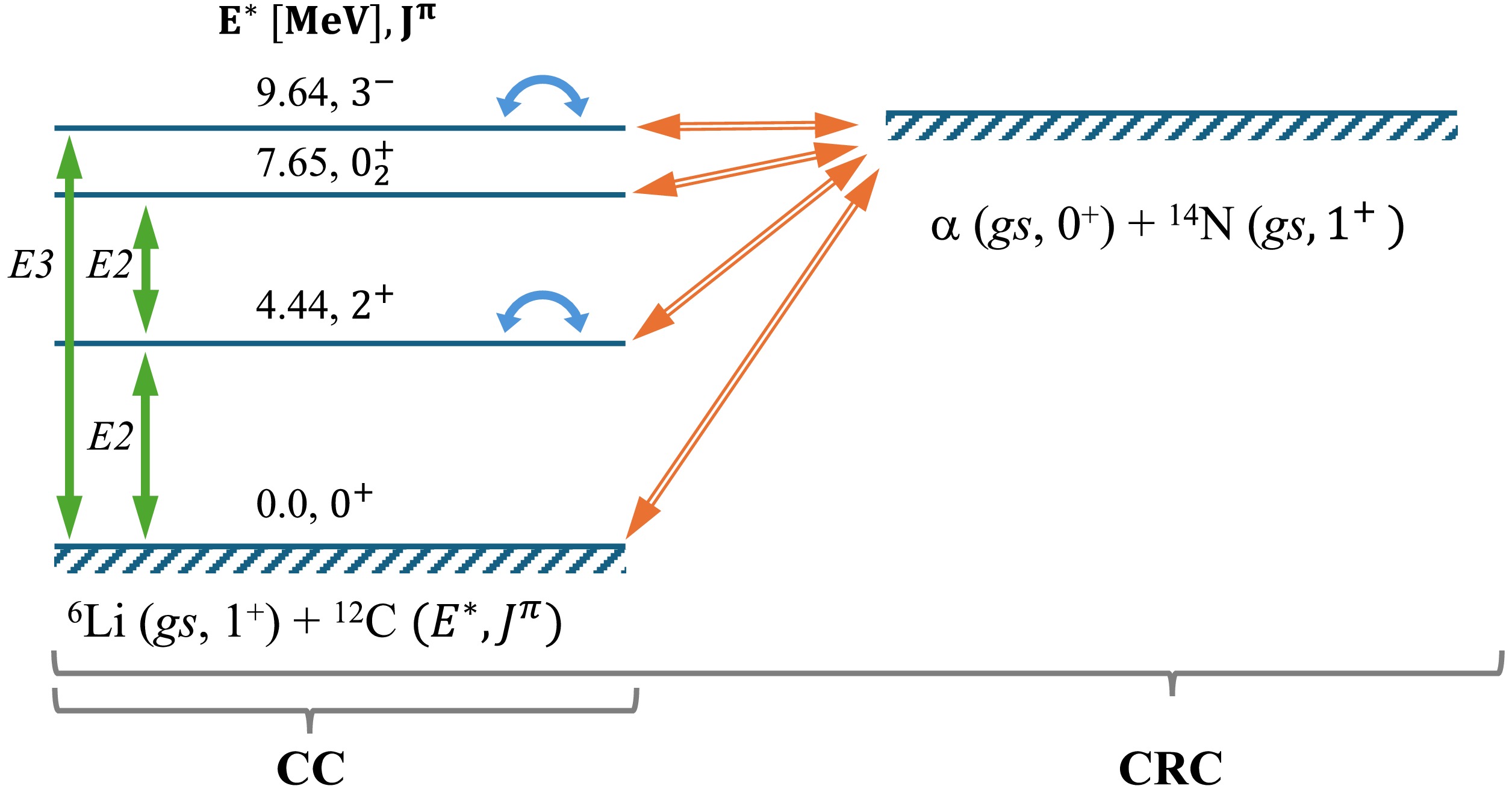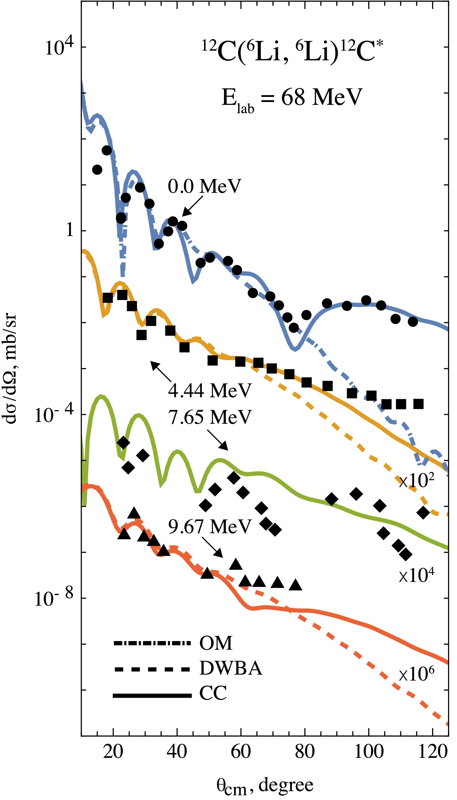 This study presents a combined experimental and theoretical investigation of the 6Li + 12C nuclear reaction at a laboratory energy of 68 MeV. The reaction products are identified via the standard\begin{document}$ \Delta E $\end{document} –E technique. Angular distributions are constructed for the elastic, inelastic, and deuteron transfer channels by detecting emitted particles – 6Li and α. Elastic and inelastic scattering of 6Li off 12C are analyzed using the optical model and coupled channels approaches, with the interaction described by a double-folding potential. This potential is calculated based on the three-body wave function of 6Li. Pronounced coupled-channel effects that modify the potential and allow accurate reproduction of the experimental cross sections are observed. The resulting polarized potentials provide a more precise description of the initial-state interaction for further reaction modeling. The deuteron transfer channel, 12C(6Li, α)14N, is studied using the coupled reaction channels method. The coupling between the transfer and elastic channels is implemented using the three-body wave function of 6Li. As an alternative, a regular wave function constructed with a phenomenological Woods–Saxon potential is also employed. Comparison between the calculated differential cross sections and experimental data reveals a more complex and nuanced reaction mechanism, which supports the cluster structure of 6Li.
