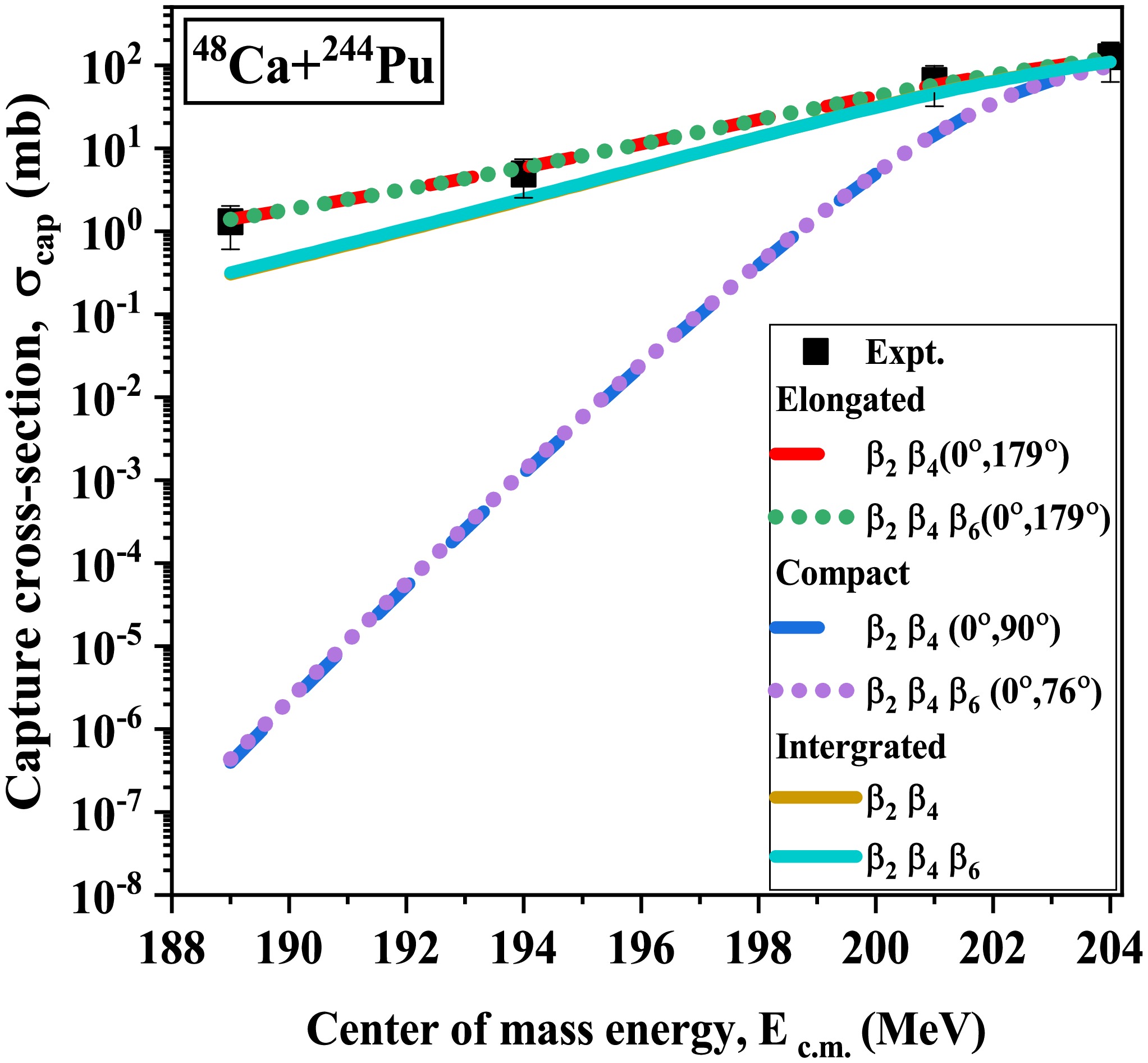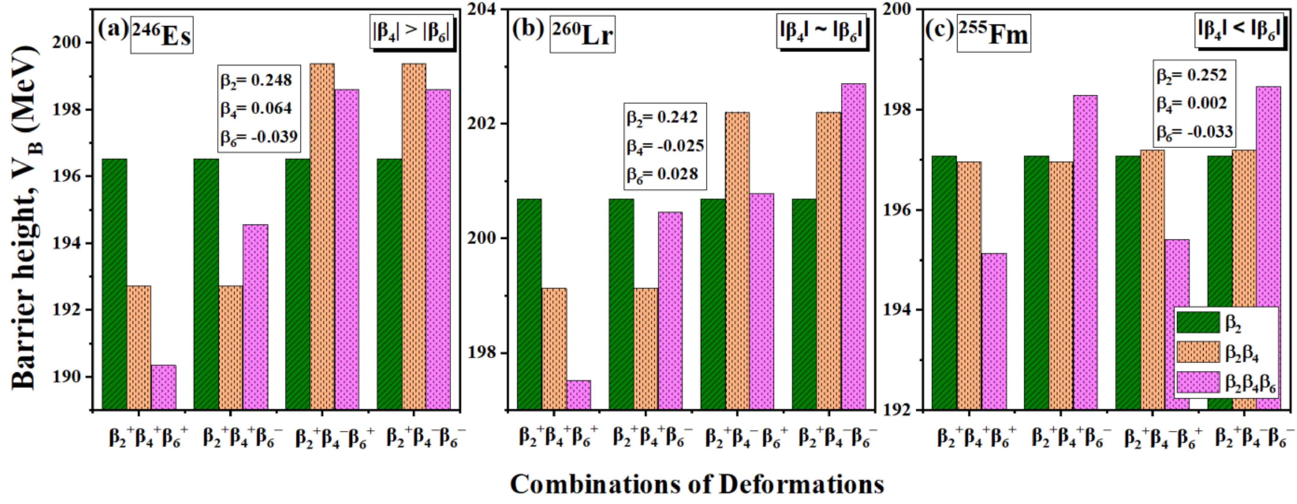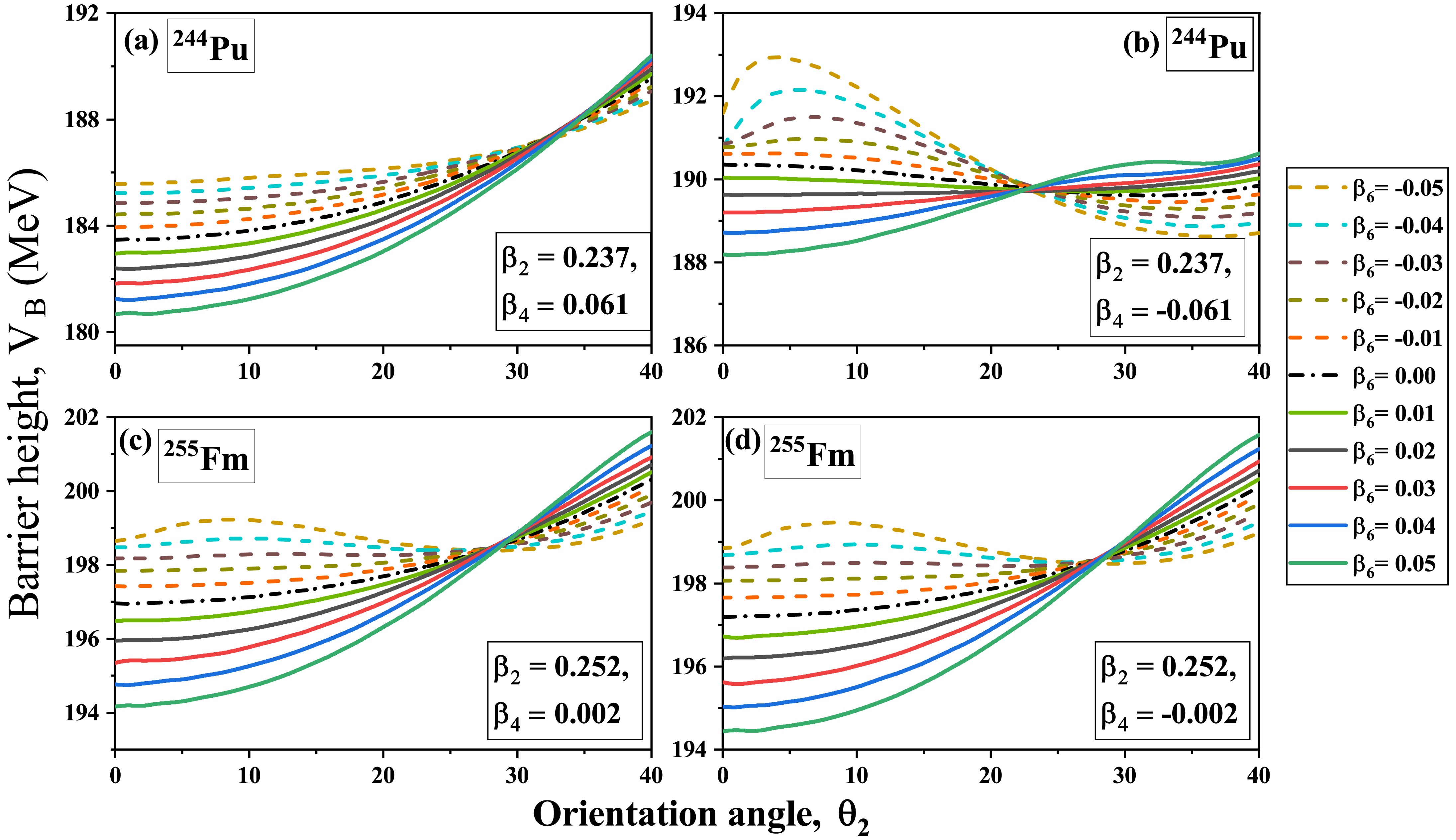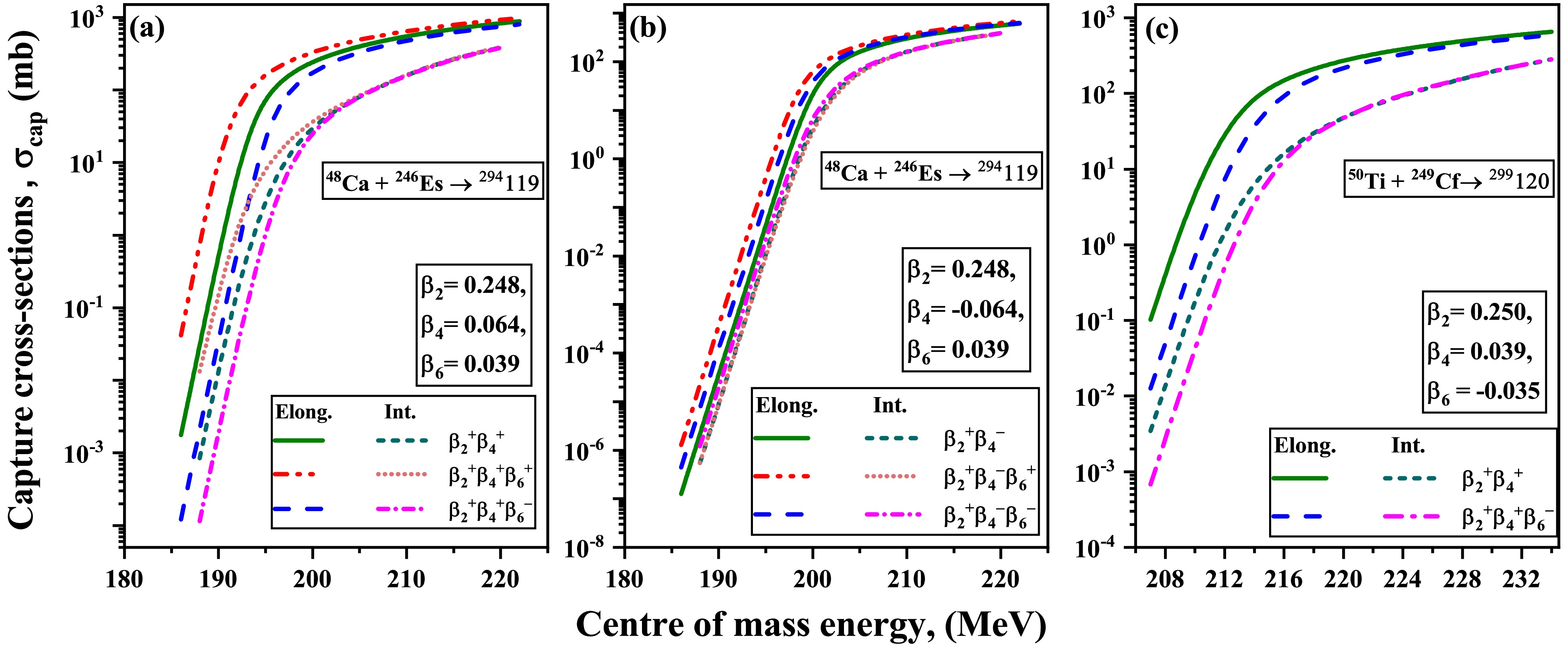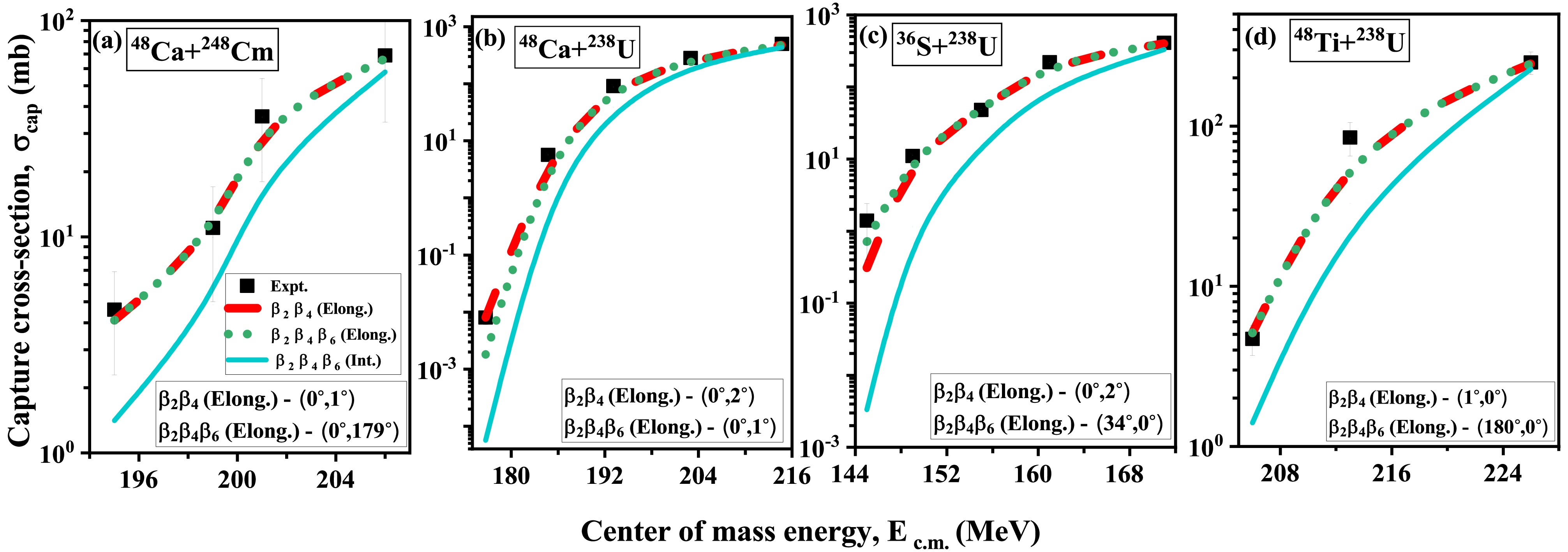 This study examines the impact of higher-order deformations up to hexacontatetrapole (\begin{document}$ \beta_6 $\end{document} ) deformation on the synthesis of superheavy nuclei (SHN) through heavy-ion induced fusion reactions. The main objective of the study is to examine the impact of modified nuclear shapes that result from the collective influence of deformations (up to \begin{document}$ \beta_6 $\end{document} ) on the barrier characteristics \begin{document}$ V_B $\end{document} and \begin{document}$ R_B $\end{document} and overall dynamics of nuclear reactions leading to the synthesis of SHN. The analysis takes into account both spherical+deformed and deformed+deformed projectile-target (P-T) combinations that lead to the synthesis of SHN. Furthermore, the analysis examines the influence of the sign (\begin{document}$ \pm $\end{document} ) and magnitude of \begin{document}$ \beta_6 $\end{document} on the barrier characteristics and overall reaction dynamics. This analysis is performed by utilizing 48Ca, 36S, and 48Ti induced reactions with \begin{document}$ \beta_6 $\end{document} -deformed actinide targets. The compact and elongated orientations, influenced by the sign and magnitude of \begin{document}$ \beta_2 $\end{document} , \begin{document}$ \beta_4 $\end{document} , and \begin{document}$ \beta_6 $\end{document} deformations, respectively, introduce further modifications in the reaction dynamics.The calculated capture cross-sections (\begin{document}$ \sigma_{\mathrm{cap}} $\end{document} ) result in better agreement with the experimental data for the case which incorporates \begin{document}$ \beta_6 $\end{document} along with \begin{document}$ \beta_2 $\end{document} and \begin{document}$ \beta_4 $\end{document} deformations than for the \begin{document}$ \beta_2\beta_4 $\end{document} deformations due to modified barrier characteristics, particularly at near-barrier energies. The findings underscore the importance and impact of incorporating deformations (up to \begin{document}$ \beta_6 $\end{document} ) and their corresponding orientations to achieve a thorough understanding of the dynamics of heavy-ion induced reactions pertaining to the superheavy mass region.