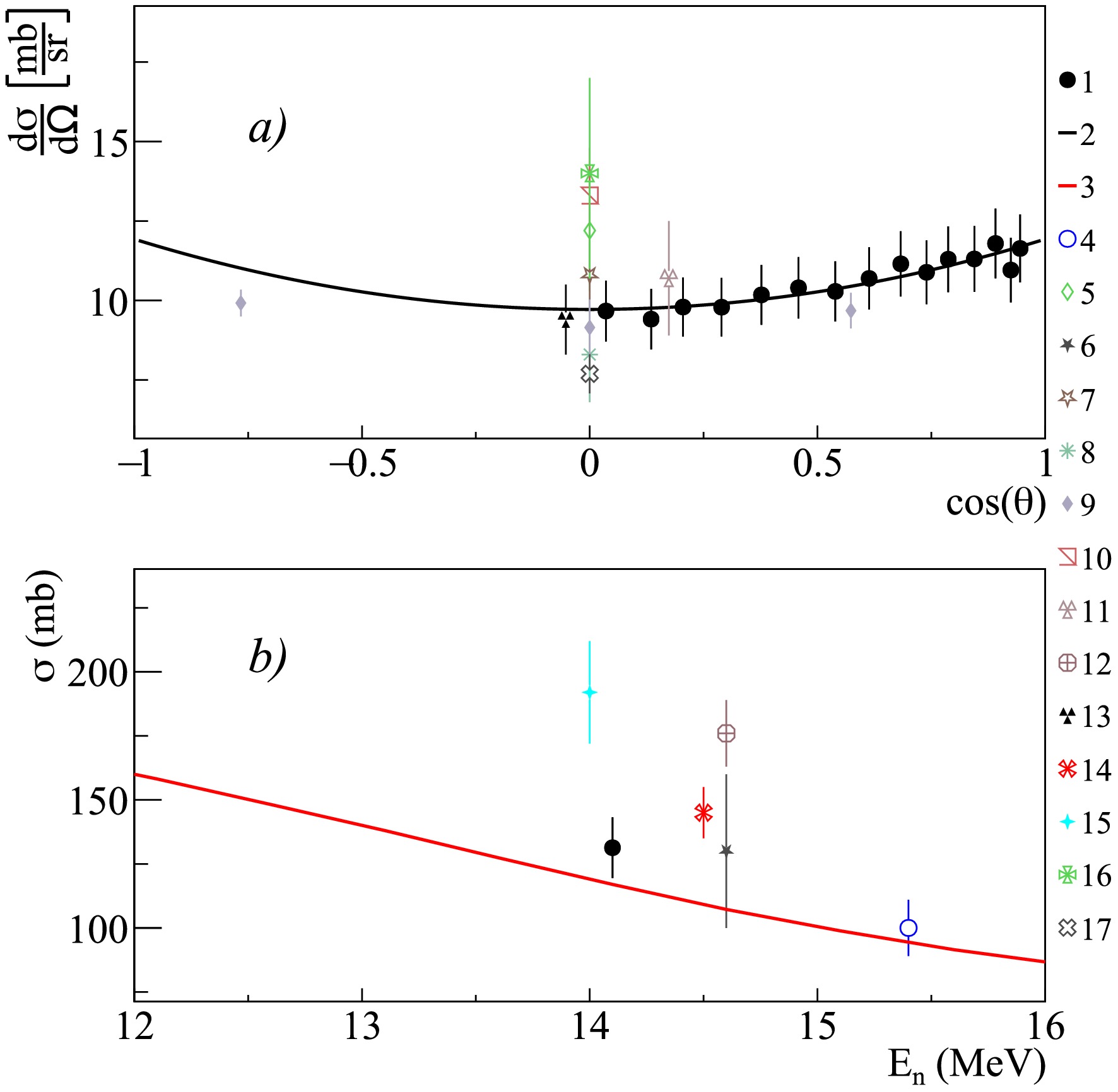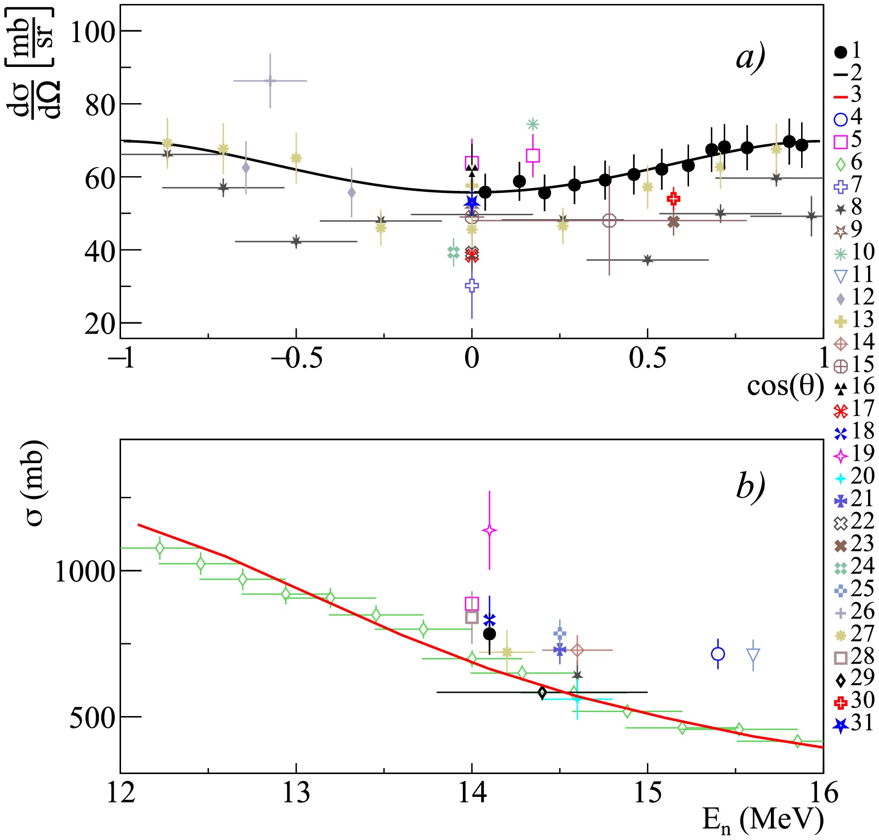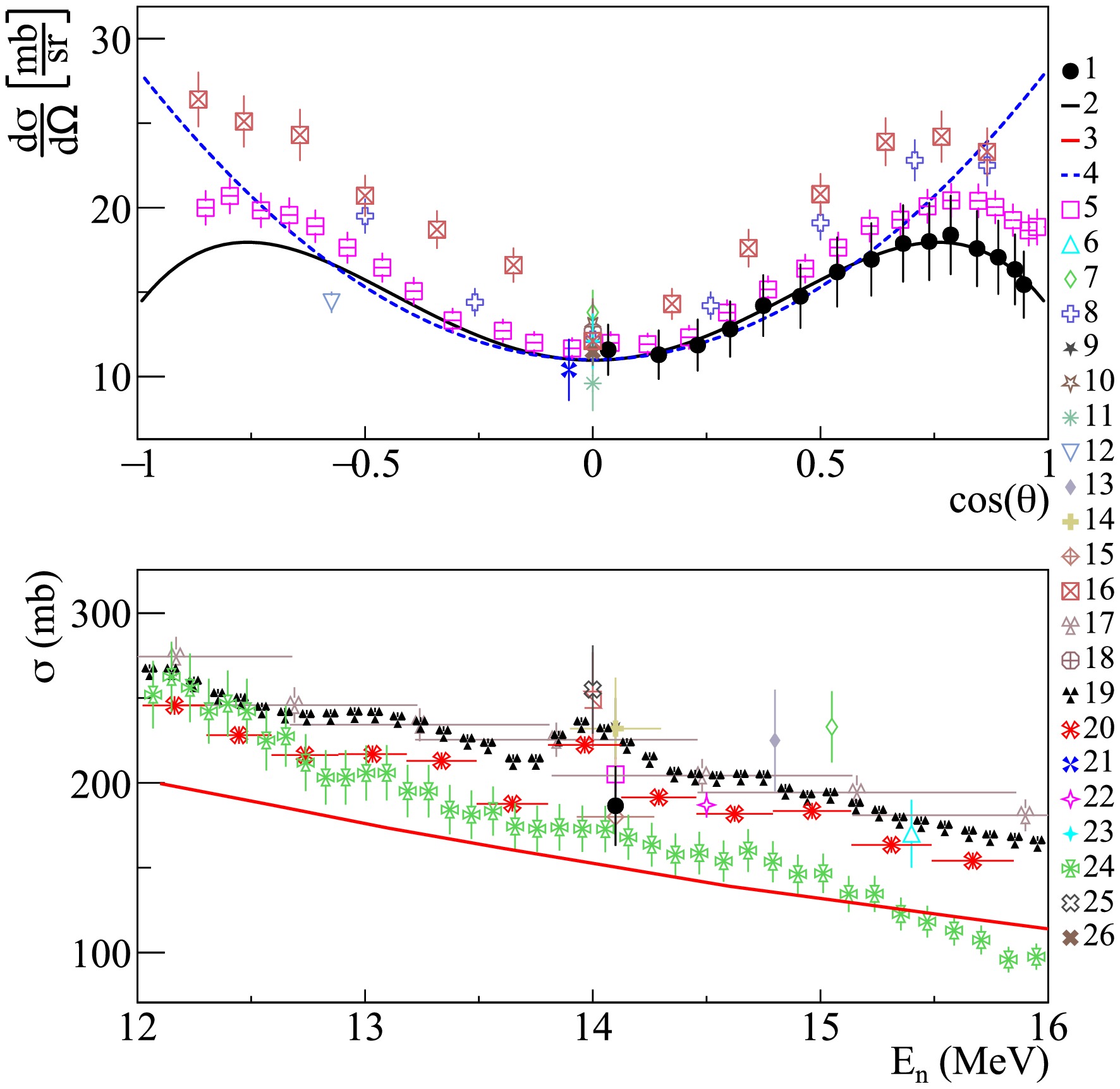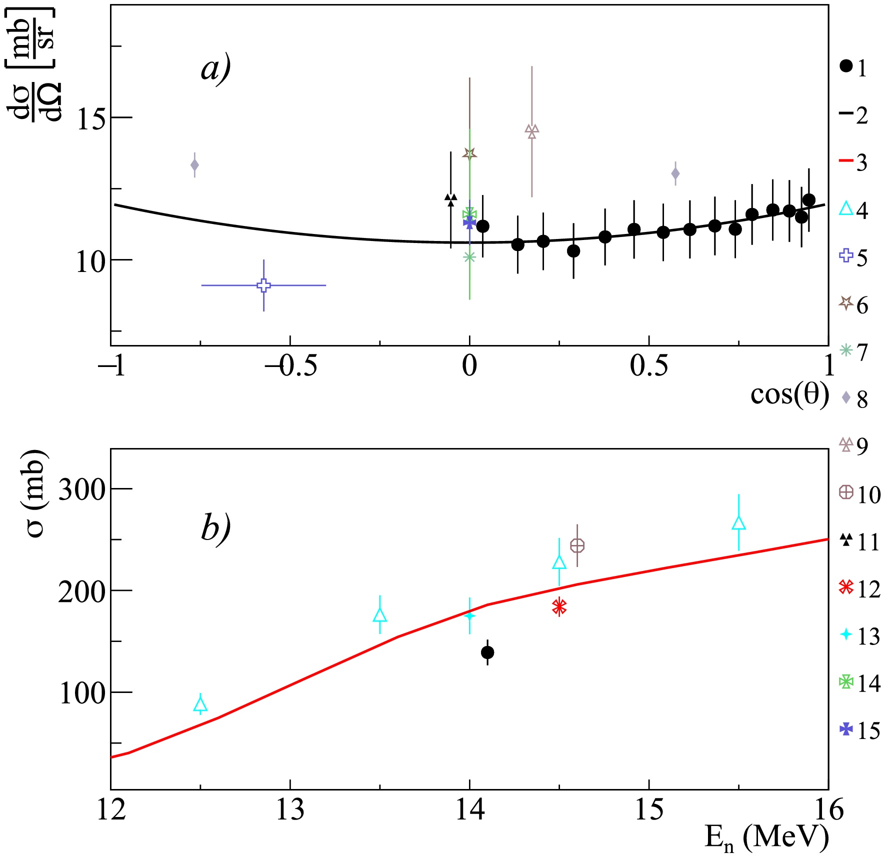 In this work, differential cross sections of\begin{document}$ \gamma $\end{document} -ray emission produced in nuclear reactions induced by 14.1 MeV neutrons are measured for the 4.439 MeV line from carbon, as well as for 10 individual \begin{document}$ \gamma $\end{document} -ray lines from aluminum, 6 from silicon, 8 from calcium, 16 from titanium, 6 from chromium, and 14 from iron. The measurements were conducted using the tagged neutron method with four LaBr3(Ce) scintillation detectors positioned at angles of 25°, 45°, 60°, and 70° relative to the generator target – sample center axis. A neutron generator that can produce 16 separate beams of tagged neutrons was employed, which combined with the detector system, enabled the determination of differential cross-sections for 64 distinct angle values in the range of 17° to 89°. To simplify data visualization, the angular distributions were divided into 5° intervals, with weighted mean values of the angle and differential cross-section calculated for each interval. Corrections for multiple neutron scattering and attenuation, \begin{document}$ \gamma $\end{document} -ray attenuation, and total detection efficiency computed using GEANT4 were accounted for in the cross-section calculations. Additional measurements were performed to validate the correction calculations. The total \begin{document}$ \gamma $\end{document} -ray emission cross-sections were obtained by approximating the angular distributions with even-order Legendre polynomial expansions up to the 6th degree, followed by integration over the full solid angle. The total systematic error for the obtained data was estimated as 9.1%.
