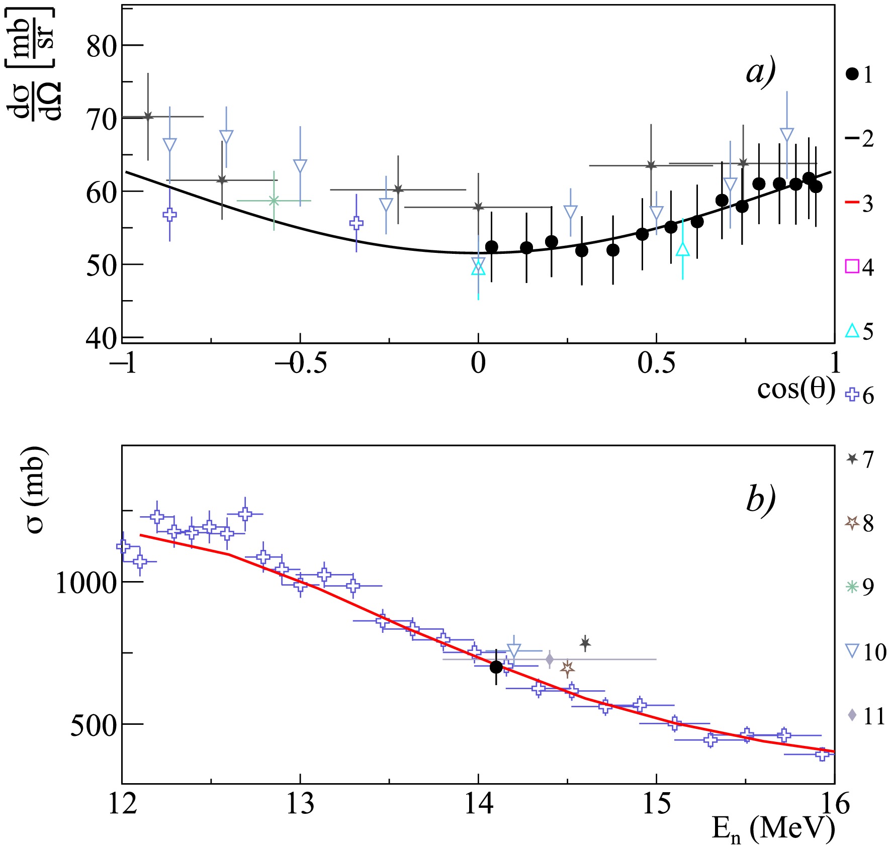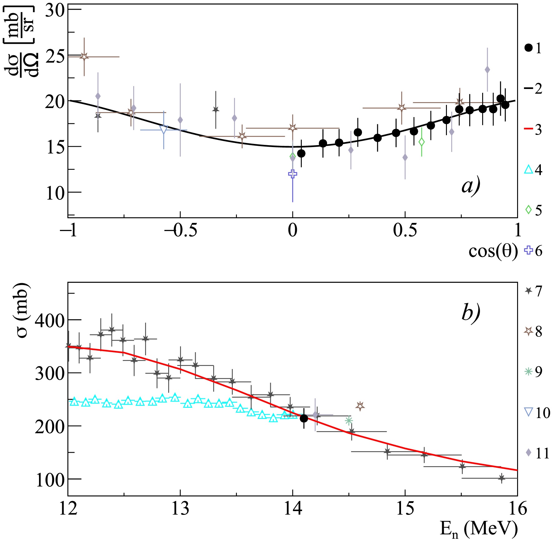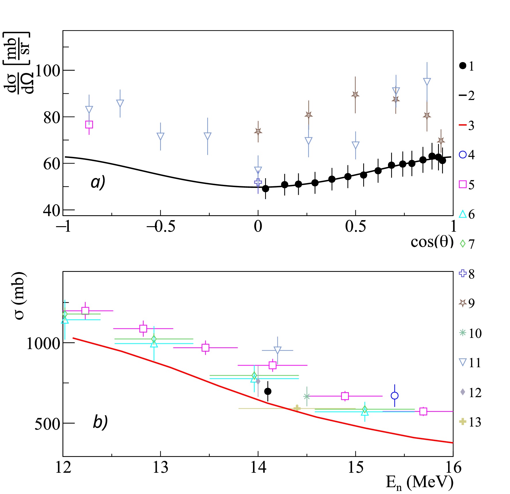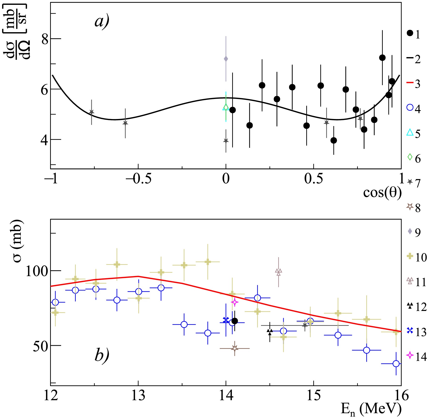 In this work, differential cross sections of\begin{document}$ \gamma $\end{document} -ray emission produced in nuclear reactions induced by 14.1 MeV neutrons are measured for the 4.439 MeV line from carbon, as well as for 10 individual \begin{document}$ \gamma $\end{document} -ray lines from aluminum, 6 from silicon, 8 from calcium, 16 from titanium, 6 from chromium, and 14 from iron. The measurements were conducted using the tagged neutron method with four LaBr3(Ce) scintillation detectors positioned at angles of 25°, 45°, 60°, and 70° relative to the generator target – sample center axis. A neutron generator that can produce 16 separate beams of tagged neutrons was employed, which combined with the detector system, enabled the determination of differential cross-sections for 64 distinct angle values in the range of 17° to 89°. To simplify data visualization, the angular distributions were divided into 5° intervals, with weighted mean values of the angle and differential cross-section calculated for each interval. Corrections for multiple neutron scattering and attenuation, \begin{document}$ \gamma $\end{document} -ray attenuation, and total detection efficiency computed using GEANT4 were accounted for in the cross-section calculations. Additional measurements were performed to validate the correction calculations. The total \begin{document}$ \gamma $\end{document} -ray emission cross-sections were obtained by approximating the angular distributions with even-order Legendre polynomial expansions up to the 6th degree, followed by integration over the full solid angle. The total systematic error for the obtained data was estimated as 9.1%.