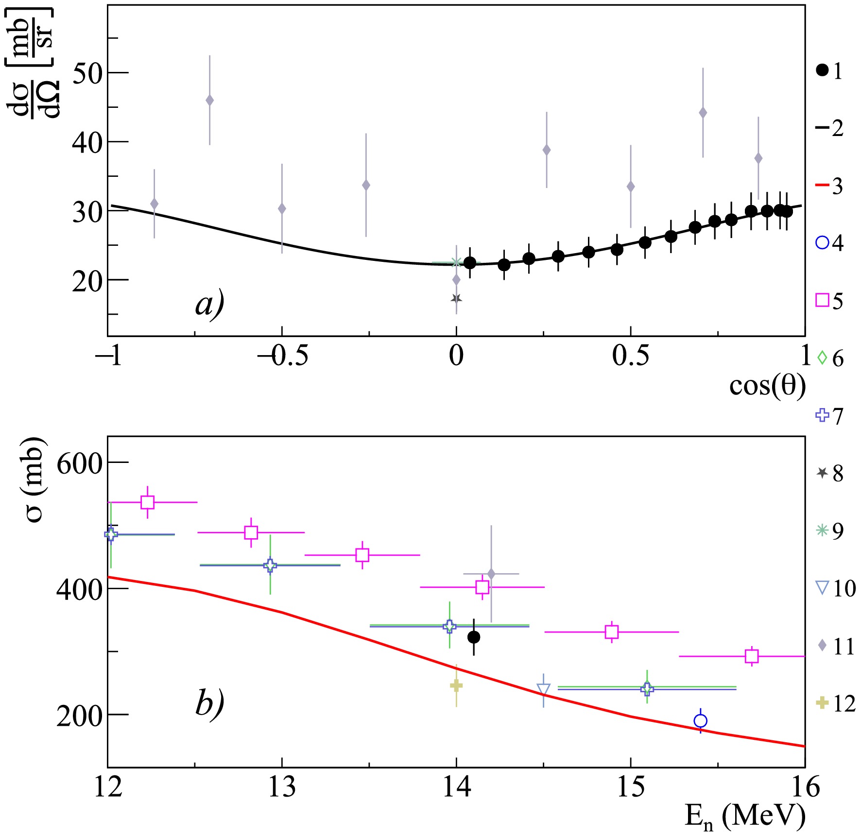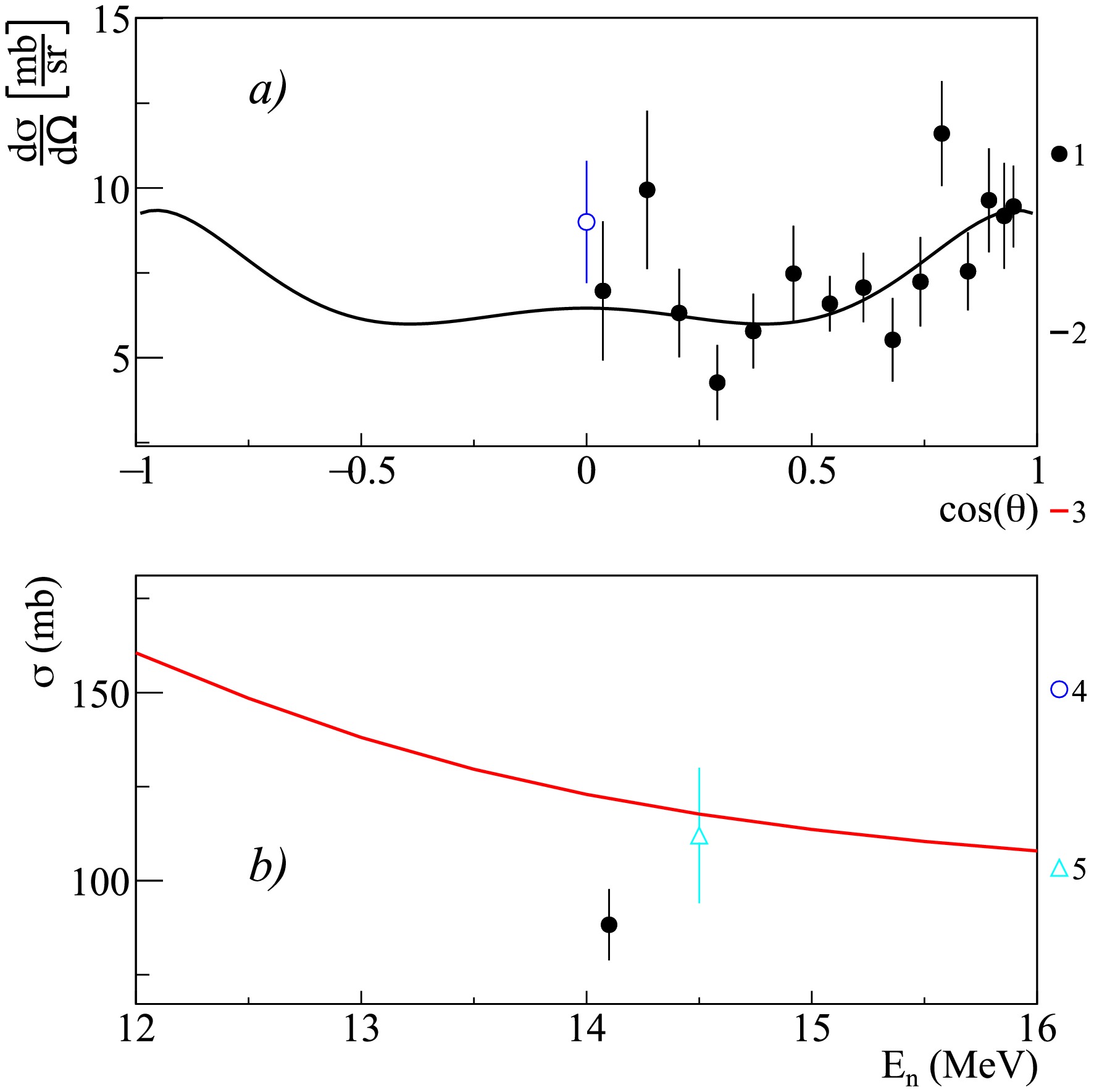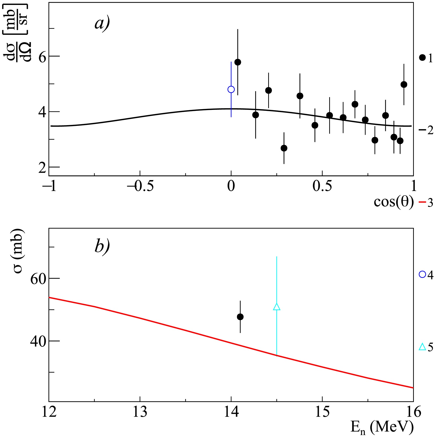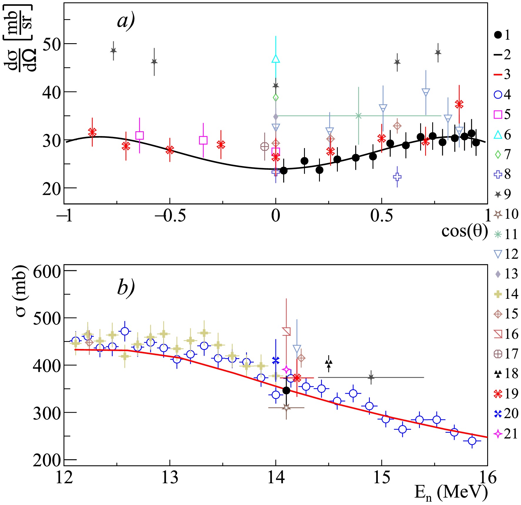 In this work, differential cross sections of\begin{document}$ \gamma $\end{document} -ray emission produced in nuclear reactions induced by 14.1 MeV neutrons are measured for the 4.439 MeV line from carbon, as well as for 10 individual \begin{document}$ \gamma $\end{document} -ray lines from aluminum, 6 from silicon, 8 from calcium, 16 from titanium, 6 from chromium, and 14 from iron. The measurements were conducted using the tagged neutron method with four LaBr3(Ce) scintillation detectors positioned at angles of 25°, 45°, 60°, and 70° relative to the generator target – sample center axis. A neutron generator that can produce 16 separate beams of tagged neutrons was employed, which combined with the detector system, enabled the determination of differential cross-sections for 64 distinct angle values in the range of 17° to 89°. To simplify data visualization, the angular distributions were divided into 5° intervals, with weighted mean values of the angle and differential cross-section calculated for each interval. Corrections for multiple neutron scattering and attenuation, \begin{document}$ \gamma $\end{document} -ray attenuation, and total detection efficiency computed using GEANT4 were accounted for in the cross-section calculations. Additional measurements were performed to validate the correction calculations. The total \begin{document}$ \gamma $\end{document} -ray emission cross-sections were obtained by approximating the angular distributions with even-order Legendre polynomial expansions up to the 6th degree, followed by integration over the full solid angle. The total systematic error for the obtained data was estimated as 9.1%.