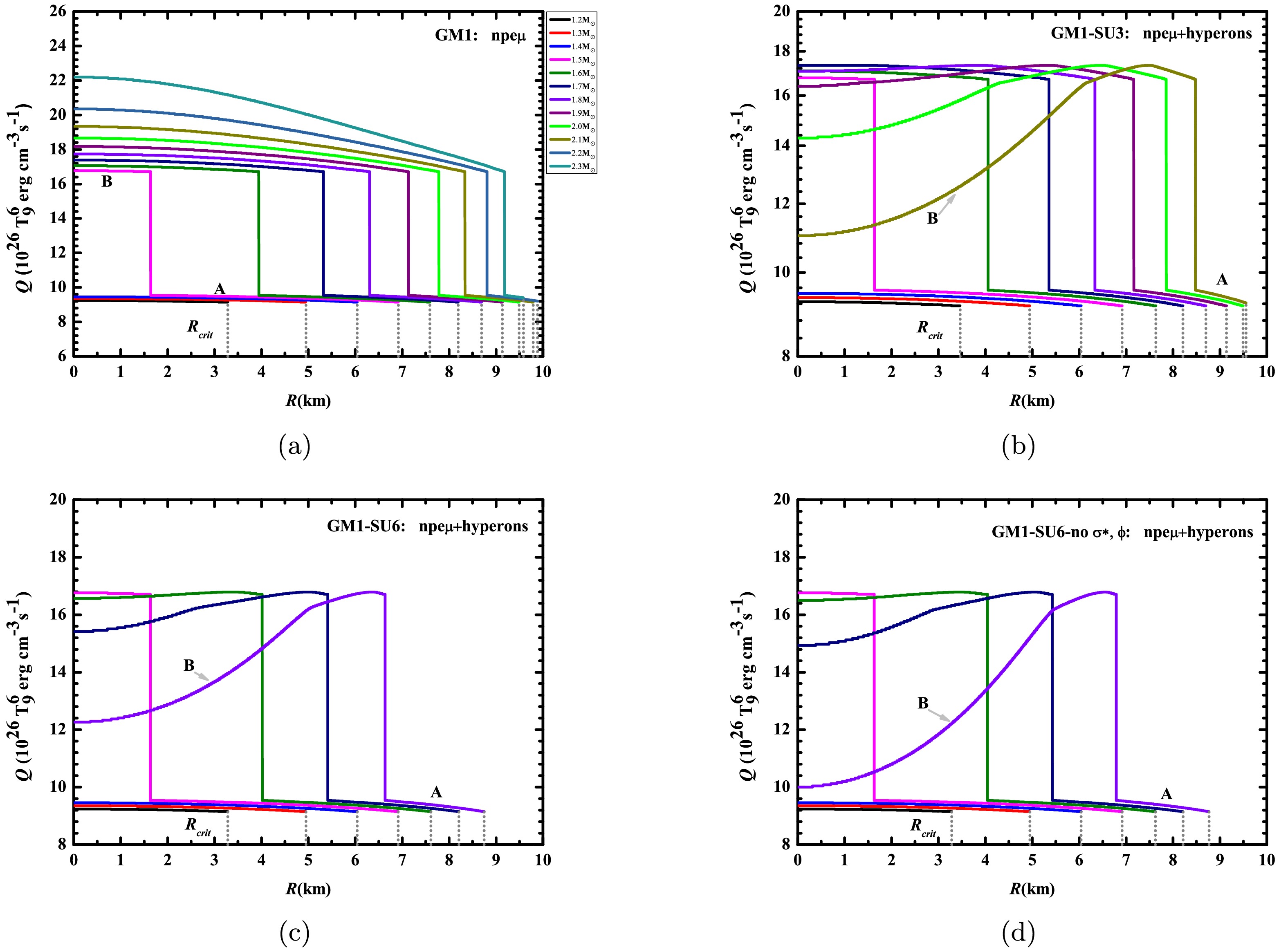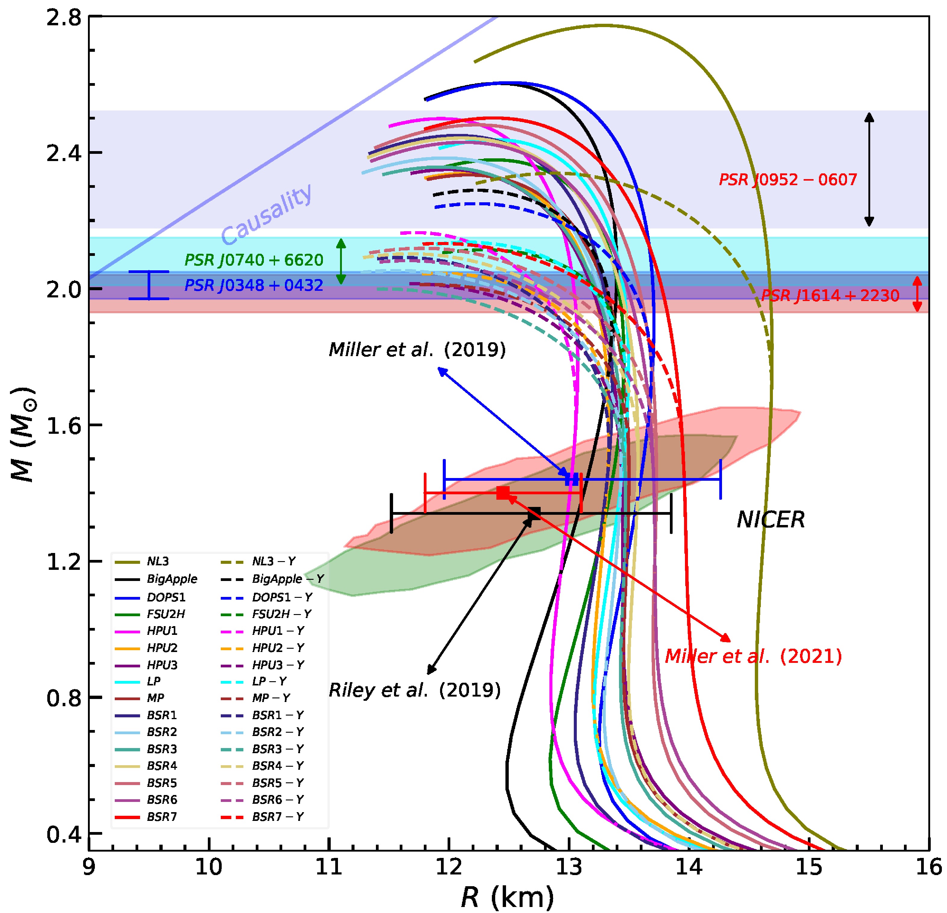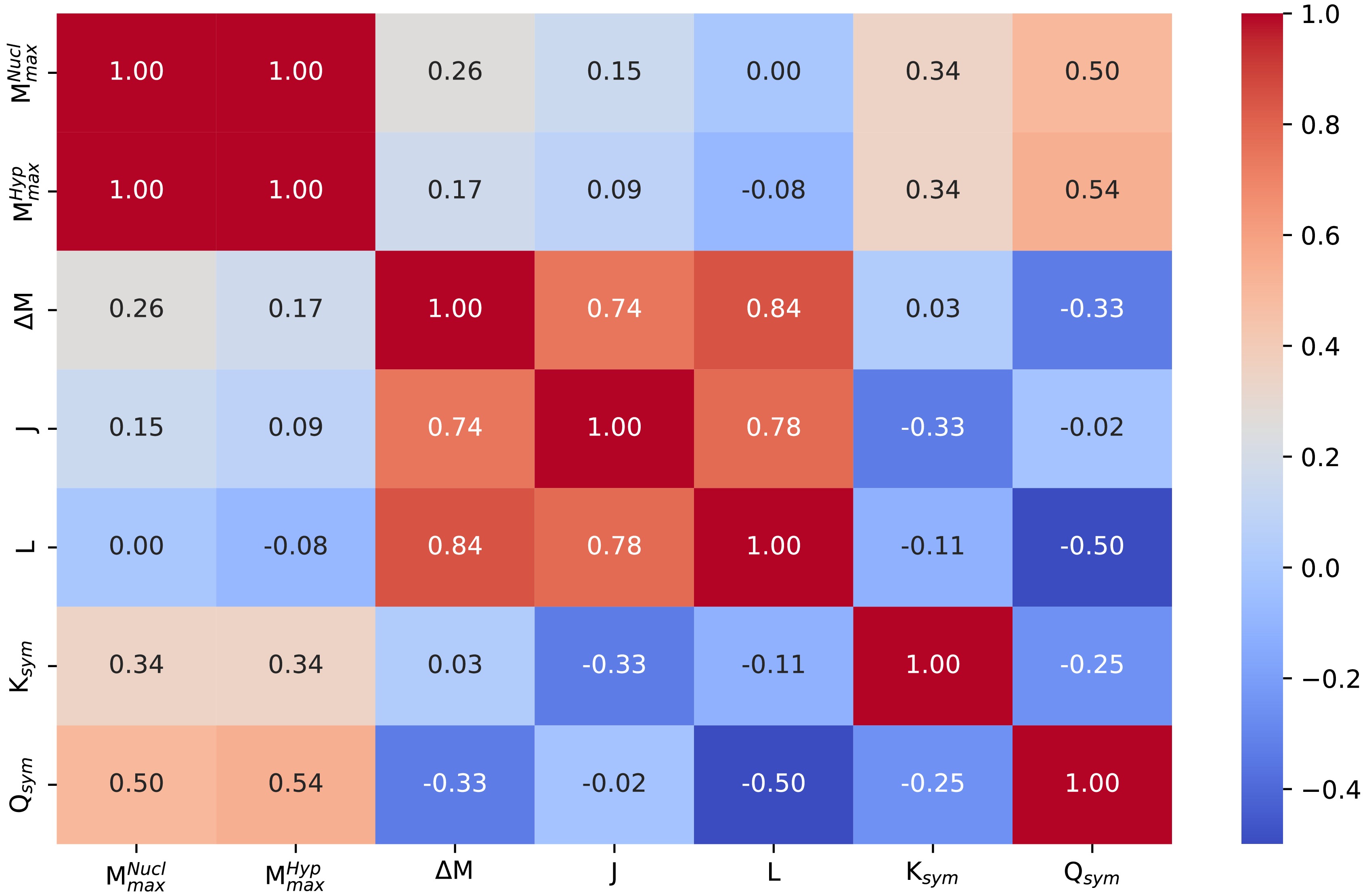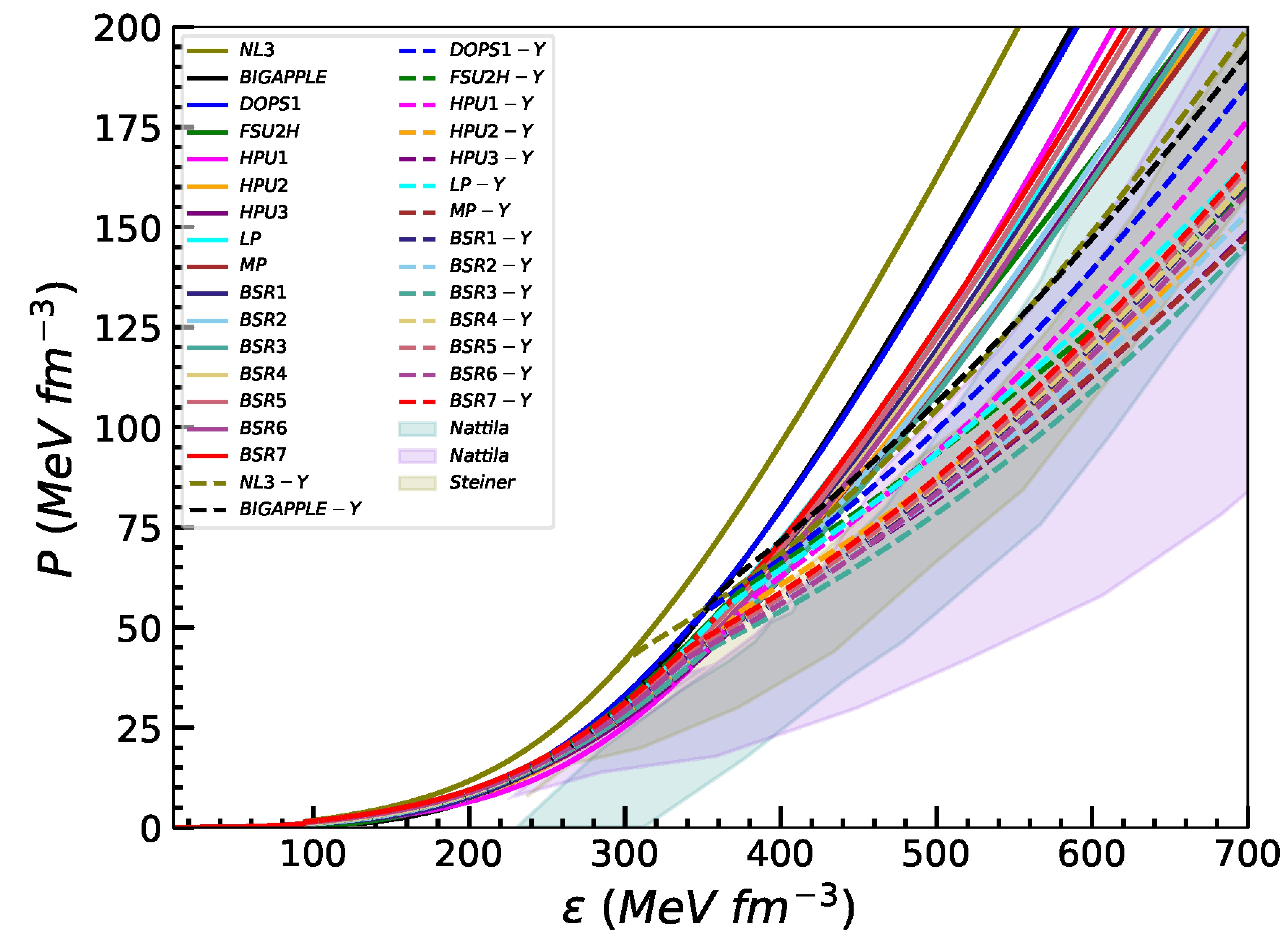 We employ a comprehensive set of relativistic mean-field (RMF) models to investigate the role of hyperons (Λ,\begin{document}$ \Sigma^{\pm,0} $\end{document} , and \begin{document}$ \Xi^{-,0} $\end{document} ) in dense nuclear matter. We consider various RMF models that span a wide range of high-density behaviors of equations of state (EoSs), symmetry energy coefficients, and hyperon-meson coupling schemes. Our aim is to assess how the inclusion of hyperons in nucleonic matter influences the key neutron star properties, including the maximum mass (M\begin{document}$ _{\rm max} $\end{document} ), stellar radius (R\begin{document}$ _{\rm max} $\end{document} ), and tidal deformability (\begin{document}$ \Lambda_{\rm max} $\end{document} ). By varying the vector meson-hyperon coupling strength (\begin{document}$ X_{\omega Y} $\end{document} ) over a wide range and considering the SU(6) symmetry, we find that a decrease in \begin{document}$ X_{\omega Y} $\end{document} results in an increased hyperon population. This leads to a significant softening of the EoS and a reduction in the maximum mass of a neutron star. The models with strong vector repulsion (larger value of \begin{document}$ X_{\omega Y} $\end{document} ) show a dominance of Λ and \begin{document}$ \Xi^- $\end{document} hyperons, with \begin{document}$ \Xi^0 $\end{document} appearing only at higher densities. The neutron star properties, such as M\begin{document}$ _{\rm max} $\end{document} , R\begin{document}$ _{\rm max} $\end{document} , and \begin{document}$ \Lambda_{\rm max} $\end{document} , are strongly affected by the hyperonization for all RMF models. It is observed that the canonical star properties like R\begin{document}$ _{1.4} $\end{document} and \begin{document}$ \Lambda_{1.4} $\end{document} remain largely unaffected by the presence of hyperons in nucleonic EoSs under fixed vector coupling strengths, except when couplings are based on SU(6) symmetry. This behavior can be attributed to the fact that, although hyperons appear in the very centre of a 1.4 M\begin{document}$ _{\odot} $\end{document} star, their population fraction is extremely small and therefore has a negligible effect on global stellar properties like R\begin{document}$ _{1.4} $\end{document} and \begin{document}$ \Lambda_{1.4} $\end{document} . Furthermore, to support a star with observational constraint of M\begin{document}$ _{\rm max} $\end{document} \begin{document}$ \ge $\end{document} 2 M\begin{document}$ _{\odot} $\end{document} , the vector coupling strength X\begin{document}$ _{\omega Y} $\end{document} must lie in the range 0.8−0.9. Our results highlight the critical role of vector coupling strength in governing hyperonization and its impact on neutron star observables. It is found that increasing X\begin{document}$ _{\omega Y} $\end{document} improves compliance with the 2 M\begin{document}$ _{\odot} $\end{document} mass constraint by suppressing early hyperonization. The critical role of the slope of symmetry energy (L) in regulating the impact of hyperonization on neutron star observables is also studied.