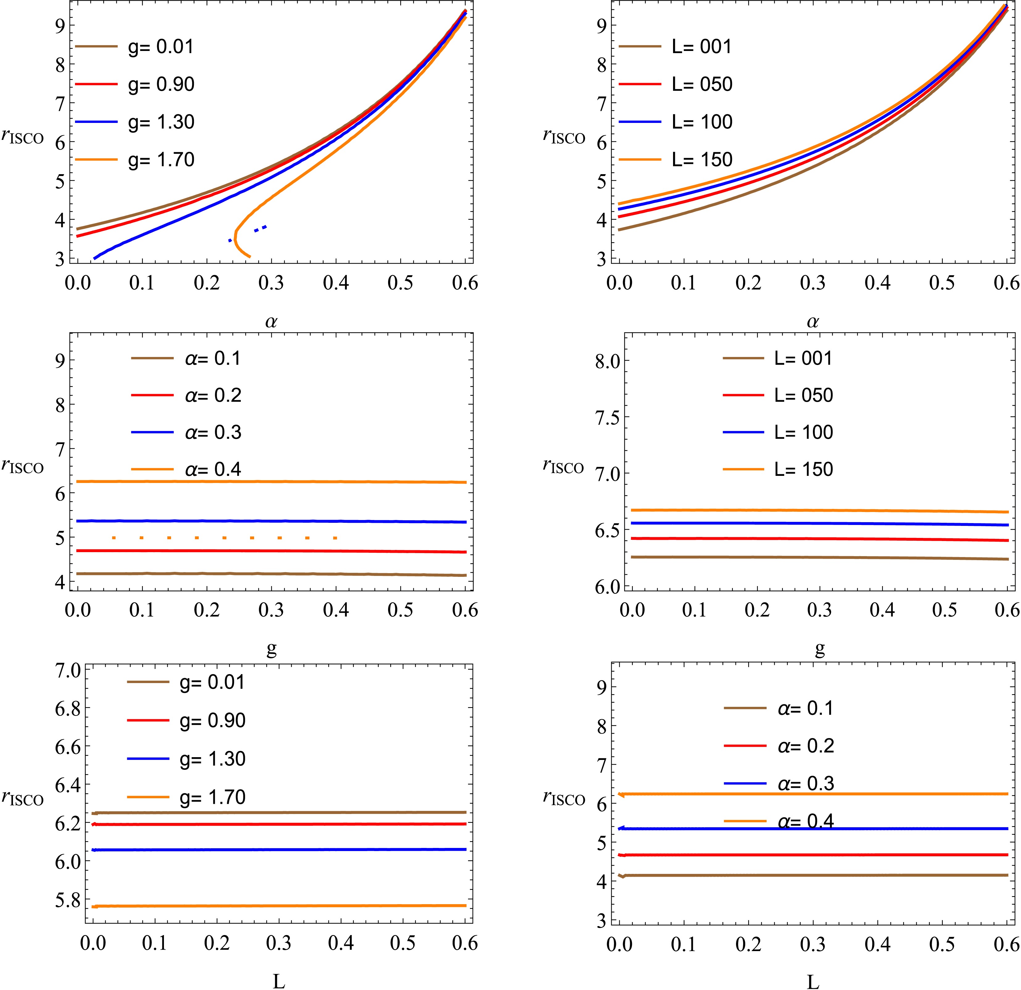 $ R_{sh} $ can be represented by the two celestial coordinates X and Y, where$ R_{sh} = \sqrt{X^2 + Y^2} $ for the observer [161–162]. It is noted that the shadow radius behaves very similarly to the$ r_{\mathrm{ISCO}} $ radius. The shadow radius$ R_{sh} $ along α decreases with an increase in g and increases with an increase in L;$ R_{sh} $ along g increases with an increase in$ \alpha\;\&\;L $ ; and$ R_{sh} $ along L decreases with an increase in g and increases with an increase in α. -
