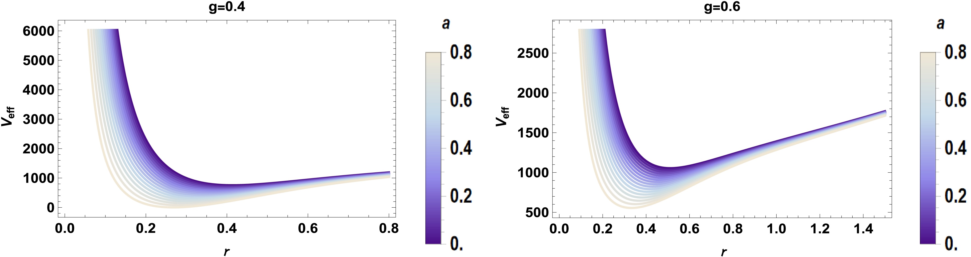 $ V\mathrm{_{\mathrm{eff}}}(r) $ and$ {\cal{L}} $ represent notations used for the effective potential defining the motion of the test particle along the radius and angular momentum, respectively. The motion of neutral particles around the BH may be determined by setting$ \dot{r} = 0 $ and$ \ddot{r} = 0 $ .Next, we examine the