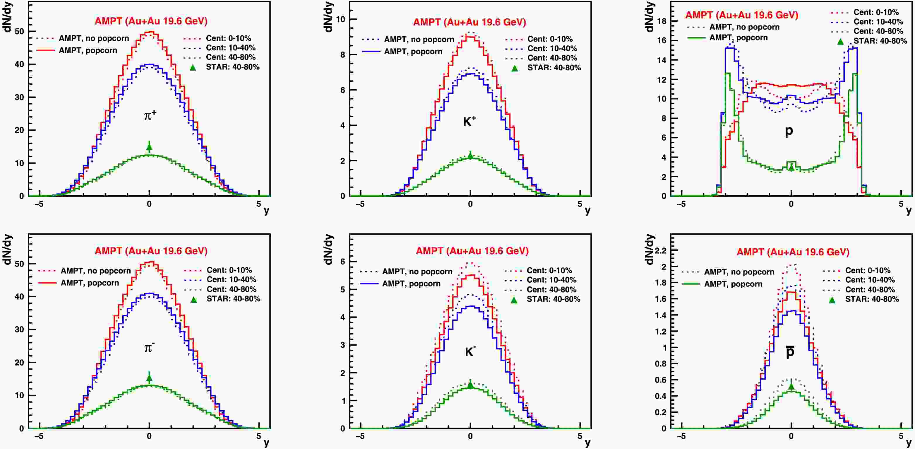 We performed AMPT simulations comprising approximately one million events for each of the previously mentioned configurations, as presented in Table 1, covering an impact parameter ranging from 0.0 to 15.0 fm. Figures 1 and 2 show the pseudorapidity distribution ( $ {\rm d}N/{\rm d}y $ ) for$ \pi^{+} $ ,$ K^{+} $ , and p and their antiparticles, respectively, in Au+Au and Cu+Cu collisions at$ \sqrt{s_{NN}} $ = 19.6 GeV for three different collision centralities, with and without the popcorn mechanism. Enabling the popcorn mechanism in AMPT with$ \mathrm{PARJ(5)}$ =1 increases the yields for$ \pi^{+} $ ($ \pi^{-} $ ) and p near mid-rapidity while decreasing the$ K^{\pm} $ and$ \bar{p} $ yields. A similar feature is observed for both Au+Au and Cu+Cu collisions. For the net particle pseudorapidity distribution (denoted as$ \Delta {\rm d}N/{\rm d}y $ ; see Fig. 3), defined as the difference between particle and antiparticle yields, the popcorn mechanism increases the mid-rapidity yield for kaons and protons, while for pions, the relative change is small. In a previous AMPT-based study, it was observed that setting equal probabilities for the$ B\bar{B} $ and$ BM\bar{B} $ configurations allows the reproduction of the net-baryon rapidity distribution at SPS energies. It was also observed that, without the popcorn mechanism, as implemented by default in the HIJING model, the net-baryon rapidity distribution would peak at a larger rapidity. Figure 4 presents the$ {\rm d}N/{\rm d}y $ distribution for two different implementations of the Lund string parameter a with the popcorn mechanism: a = 0.55 and a = 2.2. As expected, larger values of a increase the mid-rapidity yields for all species (π, K, and p). By varying the Lund string fragmentation mechanism, we altered the mid-rapidity yields of particles. Next, we studied the impact of these changes on the directed flow. As discussed in [37], the default values of the a and b parameters in HIJING can reproduce charged particle multiplicities in elementary collisions. Consequently, these parameters in the AMPT model may better describe peripheral collisions compared to central collisions. Although the a and b values in the AMPT model can be varied with centrality to better explain the data, we have not yet investigated the extent of this variation. We compared our calculations of mid-rapidity in terms of$ {\rm d}N/{\rm d}y $ and$ \Delta {\rm d}N/{\rm d}y $ with STAR data ($ |y|<0.1 $ ) for Au+Au collisions [45] and observed that the results from the 40%–80% centrality bins are comparable with AMPT, whereas AMPT underpredicts the values for mid-central and central collisions.Parameters $\mathrm{MSTJ(12)} $   $\mathrm{PARJ(5)} $   $\mathrm{PARJ(41)} $   $\mathrm{PARJ(42)} $   set-1: no-popcorn 0 0 0.55 0.15 set-2: popcorn 1 0.5 0.55 0.15 set-3: popcorn 1 1 0.55 0.15 set-4: popcorn 1 1 2.2 0.15 Table 1. Lund string fragmentation parameters used in AMPT simulation.   Figure 1. (color online) Pseudorapidity ( ${\rm d}N/{\rm d}y$ ) distribution for π,$K$ , and$p$ and their antiparticles in Au+Au collisions at$\sqrt{s_{NN}}$ = 19.6 GeV for different collision centralities with and without the popcorn mechanism (Table 1: set-1 and set-3) using the AMPT model. The STAR data points ($|y|<0.1$ ) are taken from [45].  Figure 2. (color online) Pseudorapidity ( ${\rm d}N/{\rm d}y$ ) distribution for π,$K$ , and$p$ and their antiparticles in Cu+Cu collisions at$\sqrt{s_{NN}}$ = 19.6 GeV for different collision centralities with and without the popcorn mechanism (Table 1: set-1 and set-3) using the AMPT model.  Figure 3. (color online) Pseudorapidity ( ${\rm d}N/{\rm d}y$ ) distribution for net-π, net-$K$ , and net-$p$ in Au+Au and Cu+Cu collisions at$\sqrt{s_{NN}}$ = 19.6 GeV for different collision centralities with and without the popcorn mechanism (Table 1: set-1 and set-3) using the AMPT model. The STAR data points ($|y|<0.1$ ) are taken from [45].  Figure 4. (color online) Pseudorapidity ( ${\rm d}N/{\rm d}y$ ) distribution for π,$K$ , and$p$ in Au+Au collisions at$\sqrt{s_{NN}}$ = 19.6 GeV for different collision centralities, two cases of the popcorn mechanism, and Lund fragmentation parameter values a=0.55 and a=2.2 (Table 1: set-3 and set-4), using the AMPT model. The STAR data points ($|y|<0.1$ ) are taken from [45].The top and bottom panels in Fig. 5 presents the rapidity dependence of $ v_{1} $ for$ \pi^{+} $ ,$ K^{+} $ , p, and their antiparticles for mid-central (10%−40%) Au+Au and Cu+Cu collisions respectively at$ \sqrt{s_{{NN}}} = 19.6 $ GeV using popcorn process in AMPT. The values of$ v_{1} (y) $ were fitted with a linear function within$ -1.0 < y < 1.0 $ to extract the slope near mid-rapidity or$ {\rm d}v_{1}/{\rm d}y $ . The values of$ {\rm d}v_{1}/{\rm d}y $ were studied as a function of centrality and also for ultra-central collisions ($ b<1 $ fm/c).  Figure 5. (color online) Directed flow $v_{1} (y)$ for$\pi^{+}$ ,$K^{+}$ ,$p$ , and their antiparticles in Au+Au and Cu+Cu collisions at$\sqrt{s_{NN}}$ = 19.6 GeV for 10%–40% centrality with the popcorn mechanism and Lund fragmentation parameter values a=0.55 and b=0.15 GeV$^{2}$ (Table 1: set-3), using the AMPT model.Figure 6 shows $ {\rm d}v_{1}/{\rm d}y $ as a function of centrality for$ \pi^{+} $ ,$ K^{+} $ , p, and their antiparticles in Au+Au and Cu+Cu collisions at$ \sqrt{s_{{NN}}} = 19.6 $ GeV. Results with and without the popcorn mechanism are shown. Note that the popcorn process increases the magnitude of$ {\rm d}v_{1}/{\rm d}y $ for$ K^{+} $ , p, and$ \bar{p} $ , while the effect on pions is small. In contrast, for 0–10% and 10%–40% collisions, a sign reversal is observed in$ {\rm d}v_{1}/{\rm d}y $ for$ K^{-} $ when the popcorn mechanism is enabled. Comparing the smaller Cu+Cu system to the larger Au+Au system, pions and, to a large extent, kaons do not exhibit substantial changes in$ {\rm d}v_{1}/{\rm d}y $ , whereas protons (and anti-protons) show a more pronounced eff