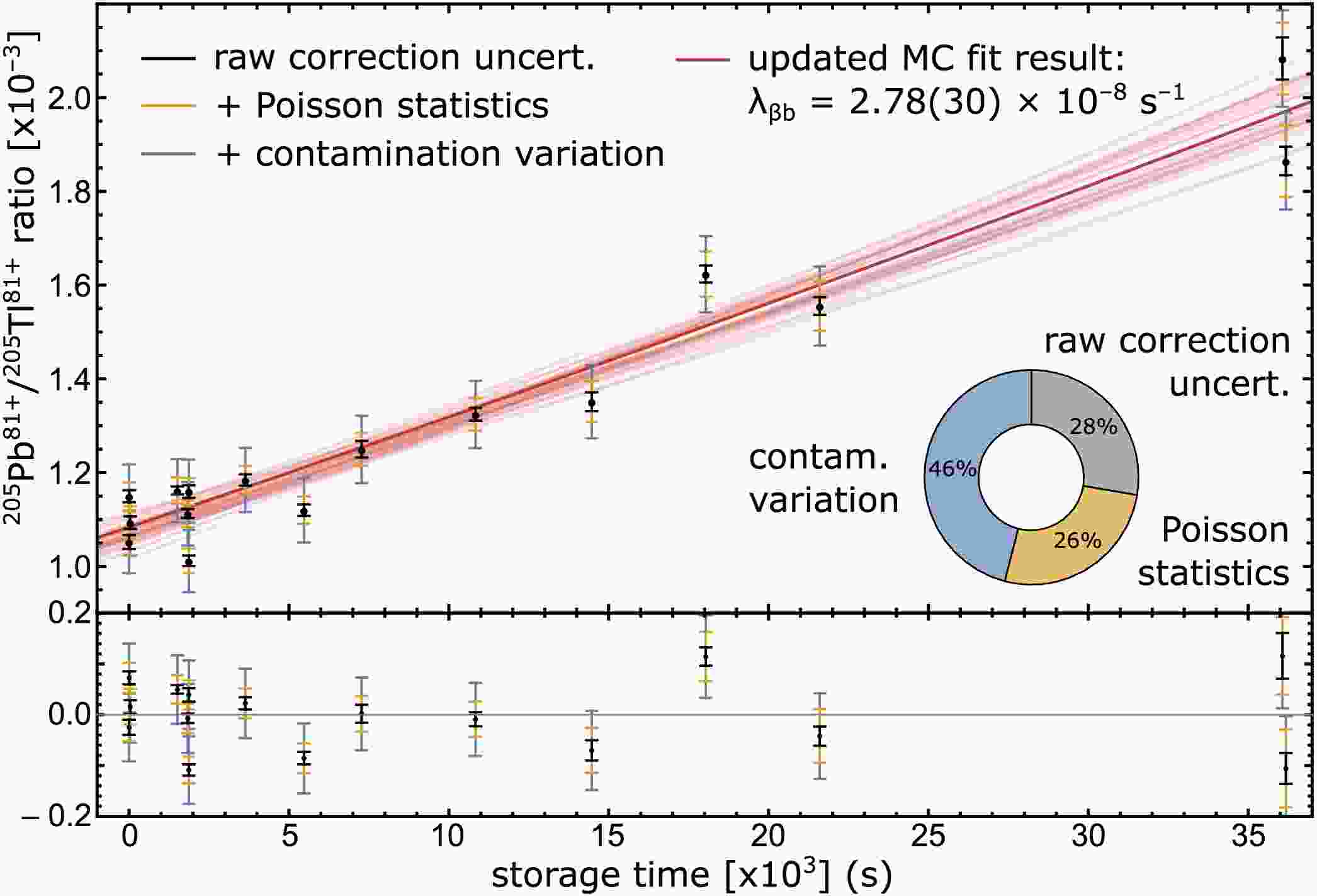 $ \beta_b $ -decay experiments [4, 5], the fully-stripped$ \beta_b $ -decay daughters were counted with particle detectors. Therefore, the number of ions was known immediately. For 205Tl81+, we chose to measure the ratio of Schottky noise power densities—proportional to the ion number according to the Schottky theorem—to avoid introducing systematic errors when calibrating the Schottky detectors. While the Schottky noise power density has its own uncertainty, it does not account for the variance introduced by the Poisson statistics. The Poisson uncertainty in the ratio$ R=N_{\rm{Pb}}/N_{\rm{Tl}} $ is just$ \sigma_R=\sqrt{R/N_{\rm{Tl}}} $ (see Appendix A for derivation). Using this expression, we can add Poisson uncertainty to each data point using the MC method in the same manner that we added the contamination variation. The results are shown in Fig. 4. As can be seen from the residuals, Poisson statistics alone are not enough to account for the missing uncertainty, although they do explain a third of the unaccounted-for variation. However, as expected, the final result from an updated MC analysis is$ \lambda_{\beta_b}= 2.78(30)\times 10^{-8}\; {\rm{s}}^{-1} $ , almost identical to the published result, indicating that the Poisson variation had been included in the contamination variation. Despite this, explicitly modeling Poisson statistics is essential when comparing the MC method with the Bayesian analysis because we are primarily interested in the behaviour of the methods when estimating the missing uncertainty.Figure 4. (color online) Updated MC method with error bars indicating the variance included for Poisson statistics and updated contamination variation. The example of 100 MC fits is again represented in red with the median fit result used to calculate the residuals. The pie chart shows the contribution of each source to the total uncertainty, highlighting that the dominant uncertainty for the experiment remains the contamination variation from the FRS.