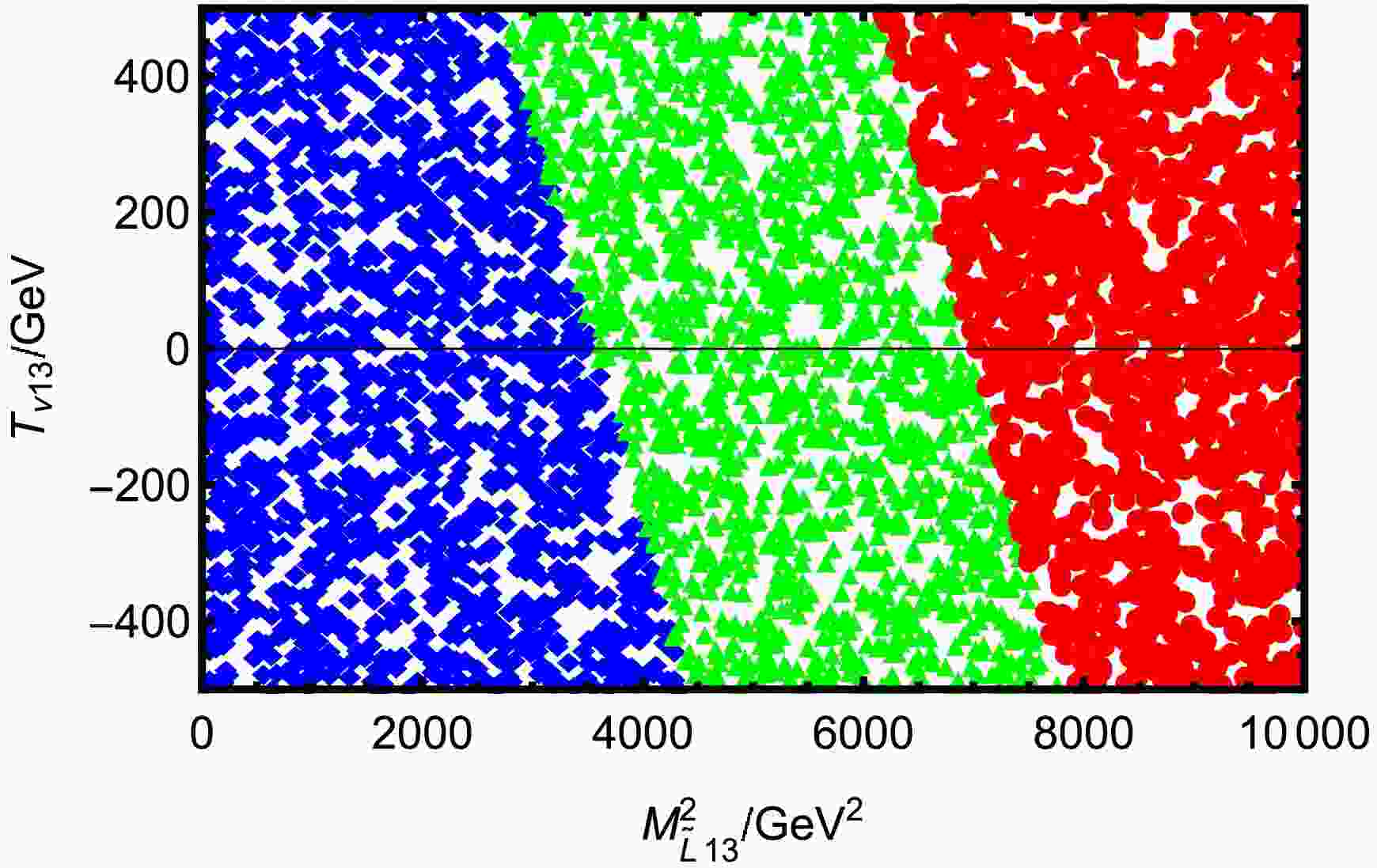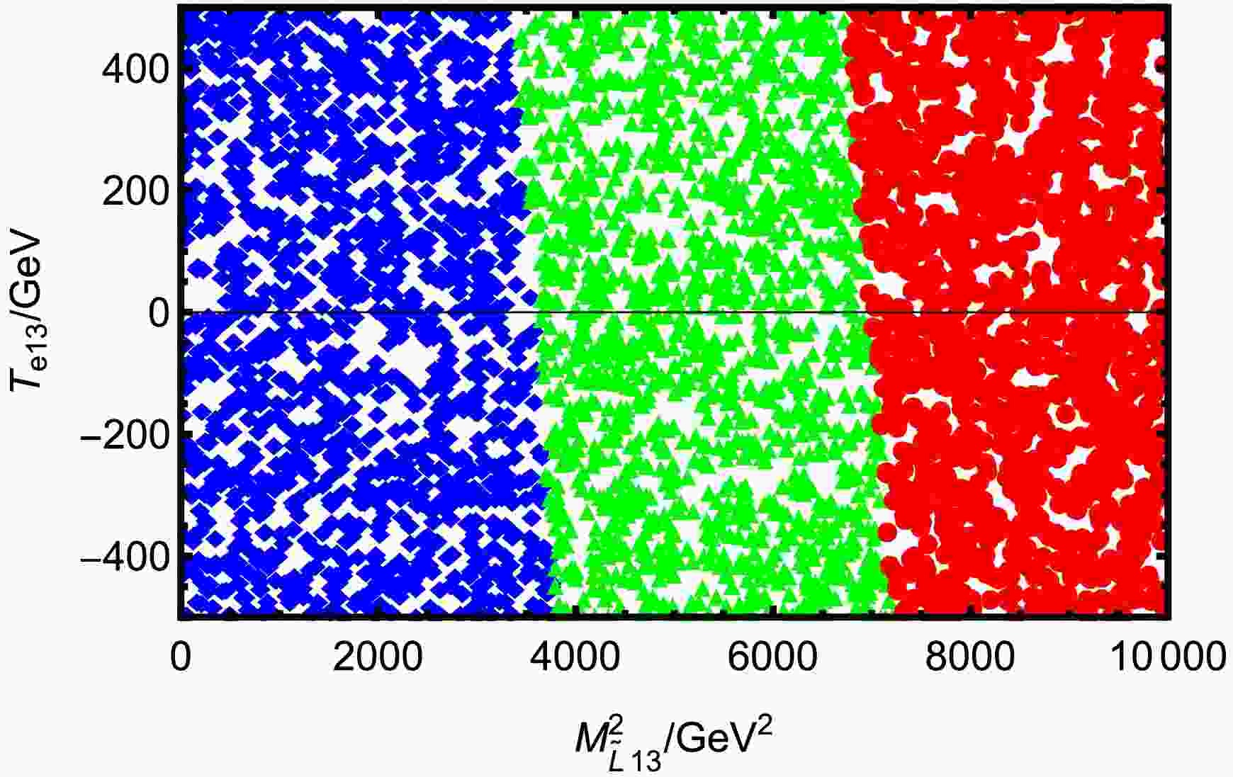 $ (\tau \rightarrow e K^+K^-) $ in the two-dimensional parameter plane of$ M_{\tilde{L}}^2 $ and$ M_{\tilde{L}13}^2 $ . ● are located mainly in the upper left part of the image, specifically in the area where$ M_{\tilde{L}}^2 $ is smaller and$ M_{\tilde{L}13}^2 $ is larger. In this region, the branching ratio is more likely to exceed$ 10^{-10} $ . ▲ are distributed predominantly in the middle zone, forming a transition band along the direction from bottom left to top right, showing an obvious oblique structure of the color boundary. Meanwhile, ◆ are clustered in the lower right corner area, indicating that the branching ratio is relatively small when$ M_{\tilde{L}}^2 $ is larger and$ M_{\tilde{L}13}^2 $ is smaller. As can be seen from Fig. 10(c), the branching ratio is significantly positively correlated with$ M_{\tilde{L}13}^2 $ , whereas$ M_{\tilde{L}}^2 $ has a secondary but still important effect on BR$ (\tau \rightarrow e K^+K^-) $ , inhibiting the branching ratio.Parameters Min Max $ T_{e13}/\rm GeV $ –500 500 $ T_{\nu13}/\rm GeV $ –500 500 Table 5. Scanning parameters for Fig. 11.