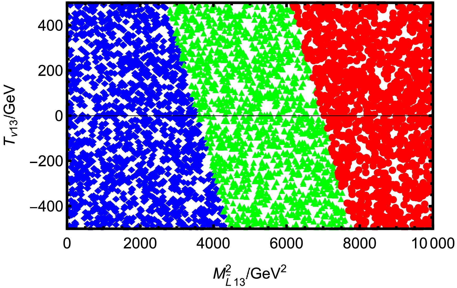 $ M^2_{\tilde{L}13} $ in Figs. 12, 13 and perform a combined analysis with$ T_{e13} $ and$ T_{\nu13} $ . As shown in the figures,$ M^2_{\tilde{L}13} $ exhibits the most direct and significant impact on the branching ratio. As this parameter increases from 0 GeV2 to 10000 GeV2, the markers of the scattered points transition from ◆$ (0< {\rm BR}\;(\tau \rightarrow e K^+K^-)<6\times 10^{-12}) $ to ▲$ (6\times 10^{-12}\leq \rm BR\;(\tau \rightarrow e K^+K^-)<2.3\times 10^{-11}) $ , and eventually to ●$(2.3\times 10^{-11} \leq {\rm BR}\;(\tau \rightarrow e K^+K^-)<3.4\times 10^{-8}) $ . This indicates that$ \text{BR}\;( \tau \to e K^+K^-) $ increases rapidly from the order of$ 10^{-12} $ to$ 10^{-11} $ , approaching the current experimental limit. This behavior reflects the strong enhancement effect of$ M^2_{\tilde{L}13} $ on LFV processes. By contrast, the effects of$ T_{\nu13} $ and$ T_{e13} $ are relatively mild. Within the same range of$ M^2_{\tilde{L}13} $ , variations in either$ T_{\nu13} $ or$ T_{e13} $ can lead to some changes in$ \text{BR}\;(\tau \to e K^+K^-) $ , but the amplitude and trend are significantly less pronounced than those induced by$ M^2_{\tilde{L}13} $ . In particular, the influence of$ T_{\nu13} $ shows a more obvious directional tendency with a clearly sloped boundary, while the effect of$ T_{e13} $ appears more gentle.Figure 12. (color online) Under the premises of current limits on LFV decays