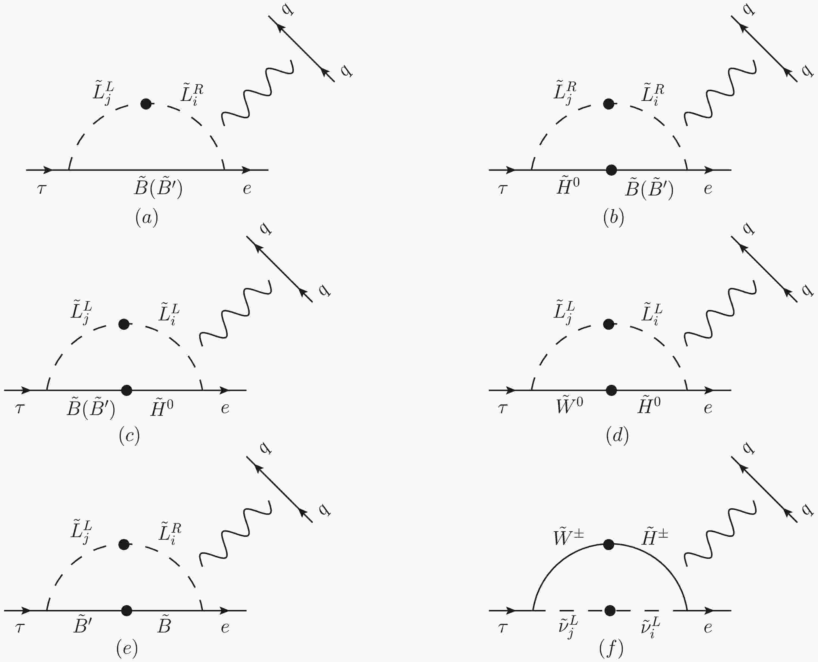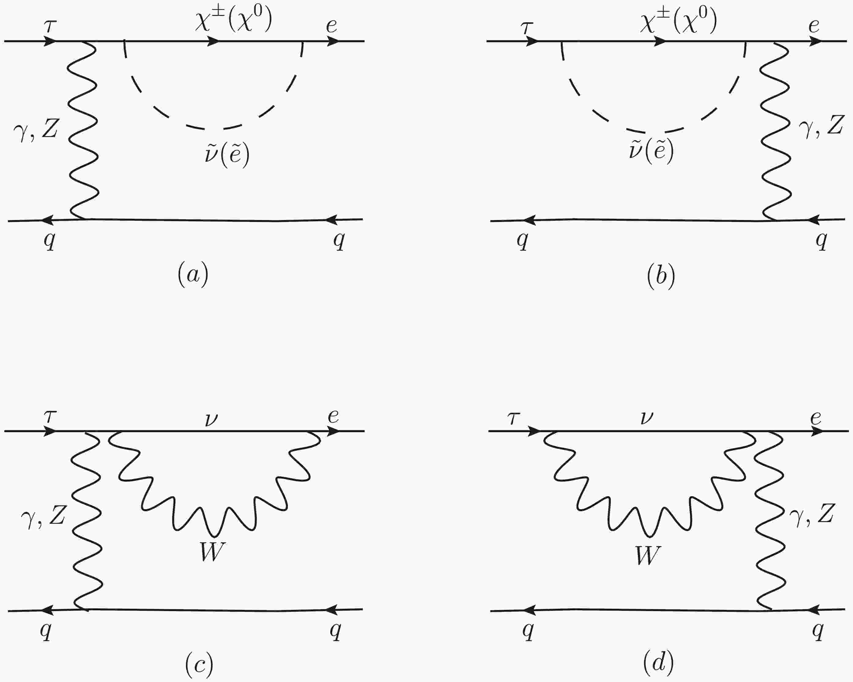 $ C^{eq}_{VLL},\; C^{eq}_{VLR},\; C^{eq}_{SRR},\; C^{eq}_{SRL} $ , and$ C^{eq}_{TRR} $ are obtained from the sum of these diagrams' amplitudes. The corresponding effective operators are$ (\bar e{\gamma^\mu }{P_L}\tau)(\bar q{\gamma_\mu}{P_L}q),\; (\bar e{\gamma^\mu}{P_L}\tau)(\bar q{\gamma_\mu }{P_R} q),\; (\bar e P_R\tau)(\bar q P_R q),\; (\bar e P_R \tau)(\bar q P_L q),\; (\bar e\sigma^{\mu\nu}{P_R}\tau)(\bar q{\sigma_{\mu\nu}}{P_R}q) $ , respectively. For convenience, the final Wilson coefficients are analyzed in the generic form, which can simplify the work. Herein,$ C^{eq}_{VLL} $ is used as an example; see Appendix A for the rest.$ \begin{aligned}[b] C^{eq}_{VLL}=\;&\sum_{F_1,F_2=\chi^\pm,\chi^\pm} \sum_{S_1,S_2=\tilde{\nu},\tilde{u}}\frac{1}{4}I_8(x_{F_1},x_{F_2},x_{S_1},x_{S_2})H_L^{S_1\tau\bar{F_1}}H_R^{S_1 F_2\bar{e}}H_R^{S_2 F_1 \bar{d}}H_L^{S_2 d\bar{F_2}} -\sum_{F_1,F_2=\chi^0,\chi^0} \sum_{S_1,S_2=\tilde{e},\tilde{q}}\\&\times\frac{1}{2}\Big[I_9(x_{F_1},x_{F_2},x_{S_1},x_{S_2})H_L^{S^*_1\tau\bar{F_1}}H_R^{S_1 F_2\bar{e}}H_R^{S_2 F_2 \bar{q}}H_L^{S^*_2 q \bar{F_1 }} -\frac{1}{2}I_8(x_{F_1},x_{F_2},x_{S_1},x_{S_2})H_L^{S^*_1\tau\bar{F_1}}H_R^{S_1 F_2\bar{e}}H_R^{S_2 F_1 \bar{q}}H_L^{S^*_2 q\bar{F_2}}\Big]\\& +\sum_{F=\chi^0,\chi^{\pm}} \sum_{S=\tilde{e},\tilde{\nu}}\frac{1}{m_Z^{2}}\Big[\frac{1}{2}I_5(x_F,x_{S_1},x_{S_2})[H_R^{S_2 F \bar{e}}H_L^{S^* \tau \bar{F}}H^{Z S_1 S^*_1}H_L^{\bar{q} Z q} -H_R^{S F_2 \bar{e}}H_R^{Z F_1 \bar{F_2}}H_L^{S^* \tau \bar{F_1}}H_L^{\bar{q} Z q}]\\& +m_{F_1}m_{F_2}I_6(x_S,x_{F_2},x_{F_1})H_R^{S F_2 \bar{e}}H_L^{Z F_1 \bar{F_2}}H_L^{S^* \tau \bar{F_1}}H_L^{\bar{q} Z q}\Big] +\frac{1}{(m^2_e-m^2_\tau)}\Big[\frac{1}{2}I_1(x_F,x_S)(m^2_e-m^2_\tau ) [\frac{Q_q e^2}{k^2}H_R^{S^* F \bar{e}} H_L^{S \tau \bar{F}}\\& -\frac{1}{(k^2-m^2_Z)}H_R^{S^* F \bar{e}} H_L^{S \tau \bar{F}}H_L^{Z \tau \bar{e}}H_L^{\bar{q} Z q}] +(m^2_e-m^2_\tau)[I_3(x_F,x_S)-I_4(x_F,x_S)]\\&\times[\frac{Q_q e^2}{k^2}m_F(m_e H_L^{S^* F \bar{e}} H_L^{S \tau \bar{F}}+m_\tau H_R^{S^* F \bar{e}} H_R^{S \tau \bar{F}})-\frac{1}{(k^2-m^2_Z)} \times m_F(m_e H_L^{S^* F \bar{e}} H_L^{S \tau \bar{F}}H_L^{Z \tau \bar{e}}H_L^{\bar{q} Z q}\\&+m_\tau H_R^{S^* F \bar{e}} H_R^{S \tau \bar{F}}H_L^{Z \tau \bar{e}}H_L^{\bar{q} Z q})]\Big] +\sum_{F=\chi^0} \sum_{S=\tilde{e}}\frac{-Q_q e^2}{k^2}\Big[\frac{1}{2}I_1(x_F,x_S) H_R^{S F \bar{e}} H_L^ {S^* \tau \bar{F}} +[I_2(x_F,x_S)-I_4(x_F,x_S)]\\& \times[(m^2_\tau+m^2_e)H_R^{S F \bar{e}} H_L^{S^* \tau \bar{F}} +m_e m_\tau H_L^{S F \bar{e}} H_R^{S^* \tau \bar{F}} ] +[I_2(x_F,x_S)-I_3(x_F,x_S)] [m_F (m_e H_L^{S F \bar{e}} H_L^{S^* \tau \bar{F}} + m_\tau H_R^{S F \bar{e}} H_R^{S^* \tau \bar{F}} )]\Big]\\& +\sum_{F=\chi^{\pm}} \sum_{S=\tilde{\nu}}\frac{Q_q e^2}{k^2}\Big[[\frac{1}{2}I_1(x_F,x_S)-m^2_F I_3(x_F,x_S)] H_R^{S F \bar{e}} H_L^{S^* \tau \bar{F}} +[2I_4(x_F,x_S)-I_2(x_F,x_S)\\&-I_3(x_F,x_S)] [(m^2_\tau+m^2_e)H_R^{S F \bar{e}} H_L^{S^* \tau \bar{F}} +m_e m_\tau H_L^{S F \bar{e}} H_R^{S^* \tau \bar{F}} ]+[I_4(x_F,x_S)-I_3(x_F,x_S)] [m_F (m_e H_L^{S F \bar{e}} H_L^{S^* \tau \bar{F}} +m_\tau H_R^{S F \bar{e}} H_R^{S^* \tau \bar{F}} )]\Big]. \end{aligned} $