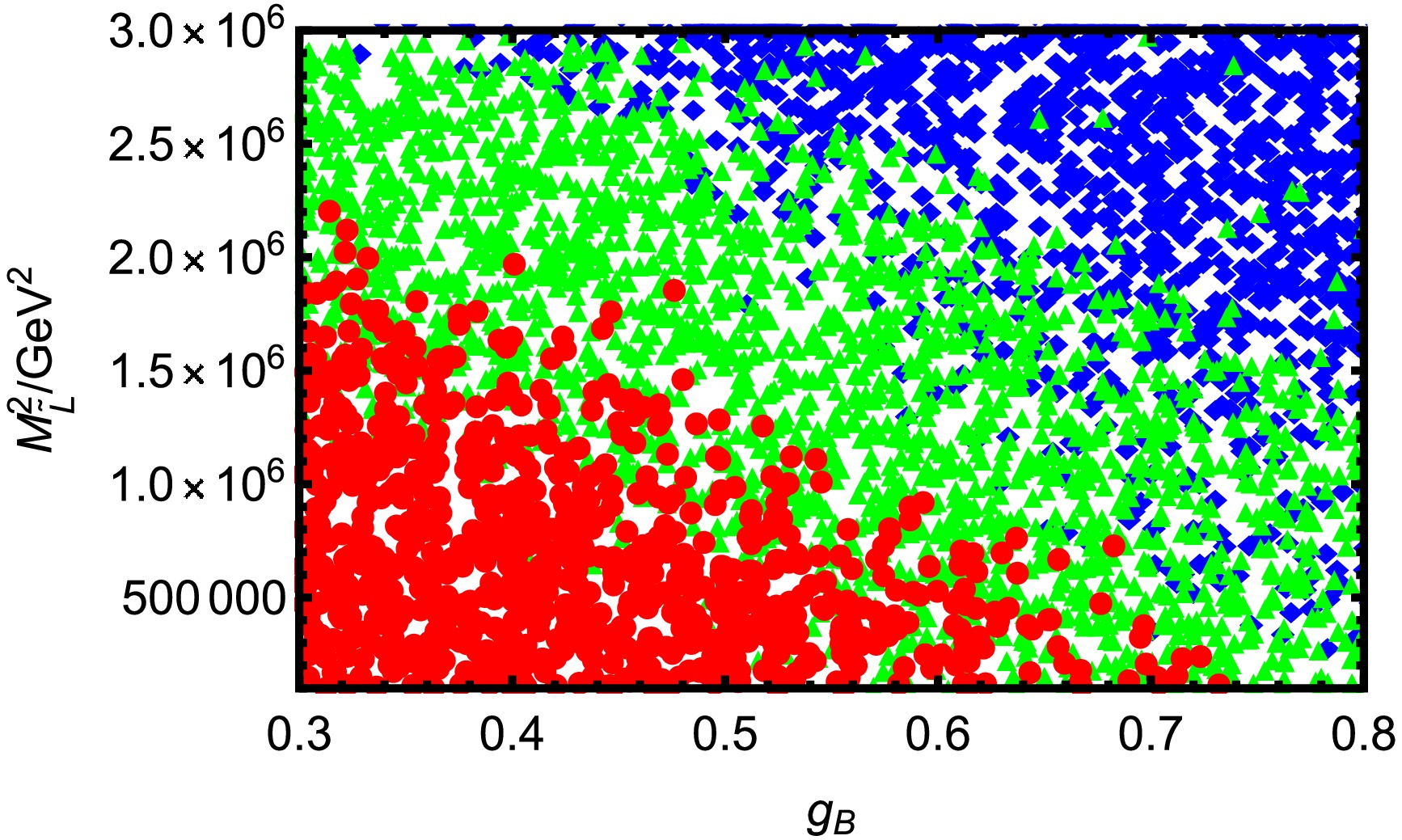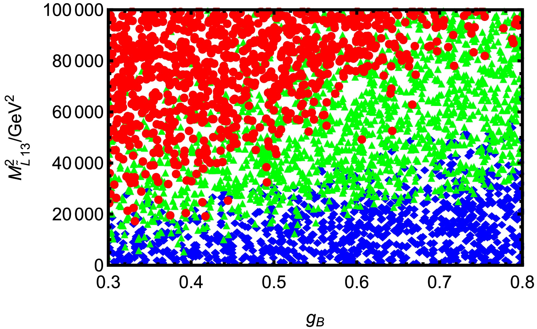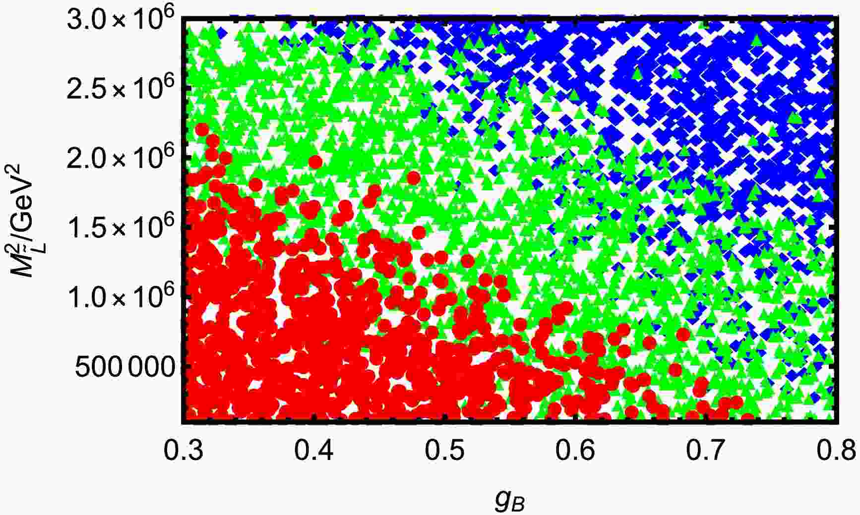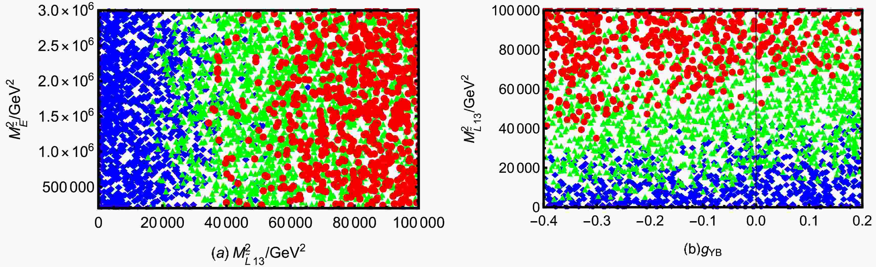 $ \lambda=0.4,\; \tan\beta=25,\; T_\nu=1\; {\rm{TeV}}, \; T_e= 1.5\; {\rm{TeV}},\; v_S= 4\; {\rm{TeV}},\; M_{BB'}=0.1\; {\rm{TeV}},\; M_{BL}=1\; {\rm{TeV}}$ , and$ M_{\tilde{L}13}^2=0.05\; {\rm{TeV^2}} $ , we plot$ g_B $ varying with$ M^2_{\tilde{L}} $ in Fig. 8. These parameter ranges are given in Table 4. ● are concentrated mainly in the lower left part of Fig. 8, where$ g_B<0.5 $ and$ M^2_{\tilde{L}}<1.5\times10^6\; {\rm{GeV^2}} $ . The points with a high branching ratio are more densely distributed, indicating that the parameter combination corresponding to this area is more likely to enhance the decay rate of$ \tau \rightarrow e \pi^+K^- $ . ▲ are distributed in a strip in the middle of Fig. 8, with a wide horizontal extension, indicating that this is the intermediate region, where the branching ratio transitions from high to low. Meanwhile, ◆ are distributed in large numbers in the upper right corner of Fig. 8. In the area of$ g_B>0.6 $ and$ M^2_{\tilde{L}}>2\times10^6\; {\rm{GeV^2}} $ , ● and ▲ have almost completely disappeared, and only ◆ remain, indicating that this parameter interval has a strong inhibitory effect on LFV decay. The dividing line shows a clear diagonal distribution, and the three regions of red, green, and blue basically transition from the bottom left to the top right. This shows that increasing either$ g_B $ or$ M^2_{\tilde{L}} $ alone can reduce BR ($ \tau \rightarrow e \pi^+K^- $ ), and if both are increased at the same time, the inhibitory effect is more obvious. This diagram clearly reveals the sensitivity of the$ \tau \rightarrow e \pi^+K^- $ decay process to the two parameters$ g_B $ and$ M^2_{\tilde{L}} $ , both of which play a key role in controlling the size of the branching ratio.Figure 8. (color online) Under the premises of current limits on LFV decays