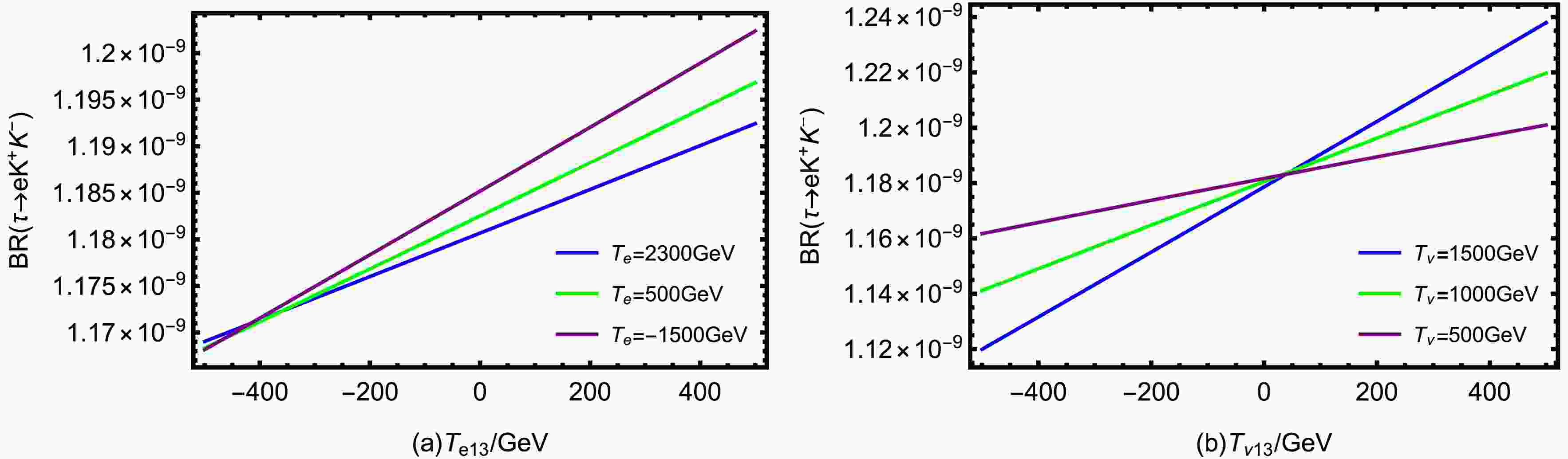 $ \tau \rightarrow e K^+K^- $ ) with respect to$ T_{e13} $ is investigated in Fig. 9(a). Three lines are analyzed: a blue line for$ T_e=2300\; {\rm{GeV}} $ , a green line for$ T_e= 500\; {\rm{GeV}} $ , and a purple line for$ T_e=-1500\; {\rm{GeV}} $ , demonstrating the sensitivity of the branching ratio to these parameters. All three curves show a monotonous upward trend. As$ T_{e13} $ changes from negative to positive, the branching ratio increases. The purple line is always at the top, the green line is in the middle, and the blue line is at the bottom. That is to say, under the same$ T_{e13} $ condition, the smaller the$ T_e $ , the larger the branching ratio. The spacing between the three lines slightly expands as$ T_{e13} $ increases. From a quantitative perspective, in the N-B-LSSM model, the mass square matrix of slepton is a$ 6\times6 $ dimensional sturcture, which is determined jointly by the softbreaking mass term and the trilinear coupling term of the left-handed and right-handed three-generation lepton superparticles. The matrix can be split into$ 3\times3 $ flavor sub-blocks, corresponding to the flavor-conserving and flavor-violating components, respectively. The parameter$ T_{e13} $ appears in the flavor-violating off-diagonal part of the matrix, while$ T_e $ corresponds to the flavor-conserving diagonal element. The flavor mixing is introduced in the diagonalization of slepton weak interaction eigenstates into the mass eigenstates, and the magnitude of the mixing angle is related to the ratio of off-diagonal element to a diagonal element$ \dfrac{T_{e13}}{T_{e}} $ . Therefore, the larger$ T_{e13} $ is, the smaller$ T_e $ is, and the BR ($ \tau \rightarrow e K^+K^- $ ) increases.We study the effect of the parameter