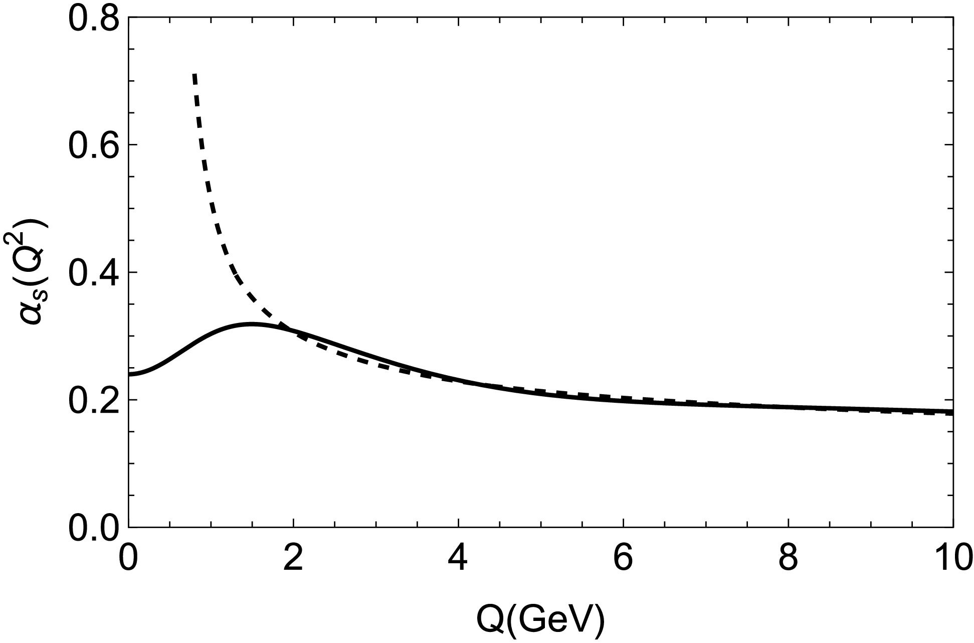 Figure 1. Strong running coupling constant in the momentum space. The solid curve represents data from the parametrized model and the dotted curve represents data from QCD perturbative calculations up to two loop corrections.
