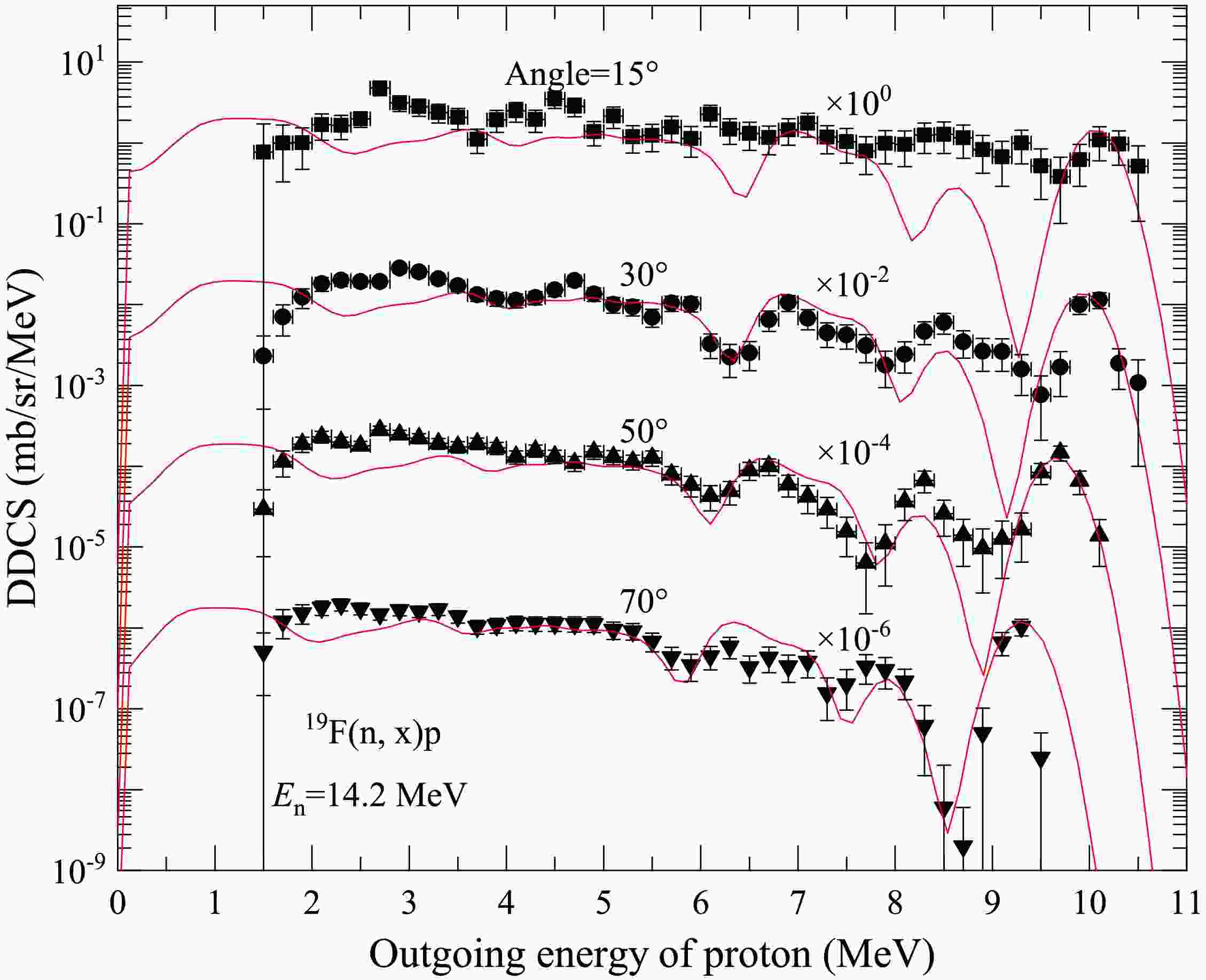 $ ^{19}\text{F}(n, \gamma $ )$ ^{20}\text{F} $ and$ ^{19}\text{F}(n, p)^{19}\text{O} $ within high density neutron-rich environments, which include scenarios such as supernova explosions and neutron star mergers. These reactions have significant implications for understanding element synthesis processes in nuclear astrophysics and elucidating cosmic nucleosynthesis mechanisms [1, 2]. In nuclear engineering and technology, physical quantities (such as cross section, angular distribution, and double-differential cross section (DDCS)) for the n+19F reaction play a critical role in key areas, including the nuclear fuel cycle, nuclear waste management, and nuclear safety systems. For example, fluoride molten salt serves as both the coolant and fuel carrier in nuclear reactors, enabling the extraction, purification, recovery, and recycling of valuable nuclides, such as uranium and plutonium. This facilitates efficient nuclear fuel production and reprocessing while enhancing reactor safety and economic performance [3−7].The DDCS is crucial for coupling energy and angular distributions of emitted particles, providing a concurrent description of neutron scattering and particle emission, handling numerous open reaction channels, and offering accurate distributions for particle transport, heat deposition, or radiation damage calculations [8]. Notably, the DDCS of outgoing charged particles is a fundamental value to estimate nuclear heating and material damages in fusion reactors [9]. Quantitatively describing the DDCS for neutron-induced light nucleus reactions is a challenging problem, not only due to the complexities of the reaction mechanisms but also the scarcity of data on the experimental DDCS of emitted charged particles. As the first nuclide in the 2s1d-shell,