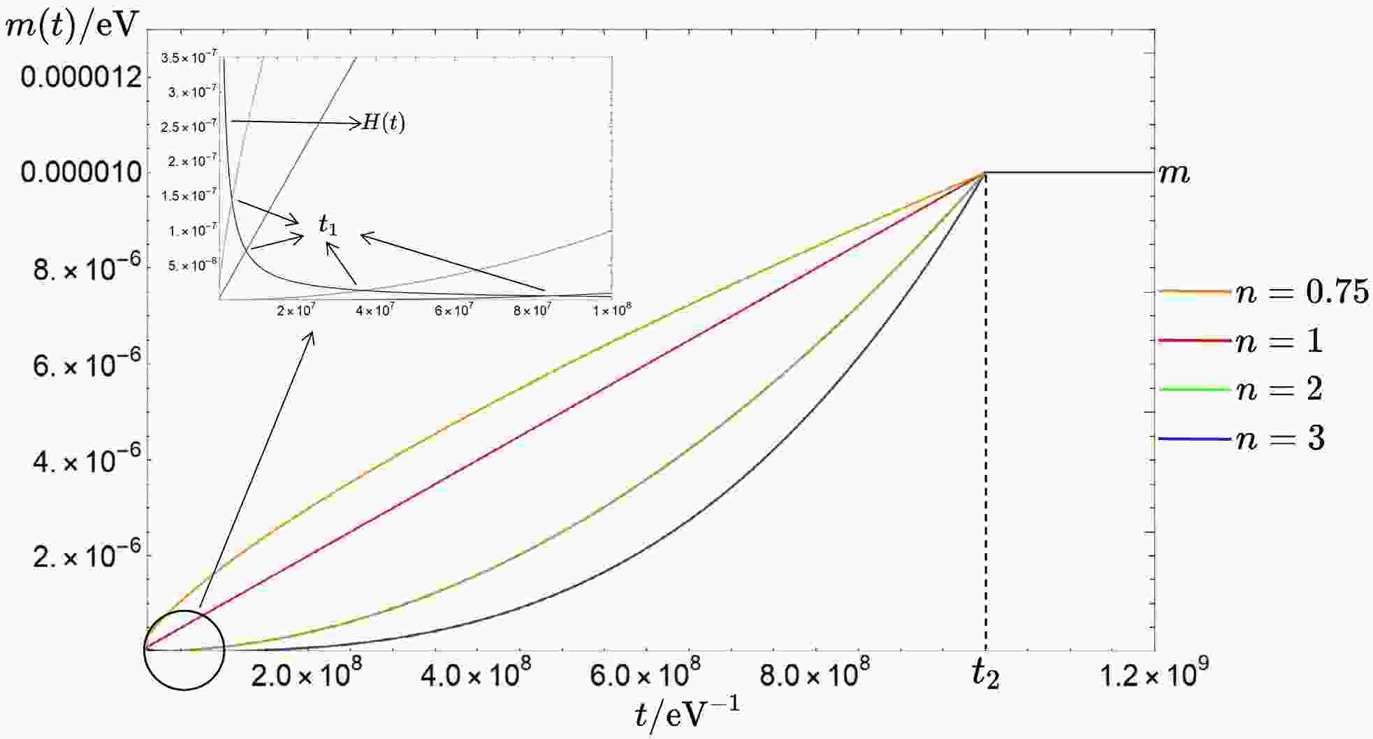 $ t_1 $ denotes the time at which the mass suppresses the hubble friction, and$ t_1\simeq\left(\frac{t_2^{2n}}{m^2}\right)^{\frac{1}{2n+2}}. $