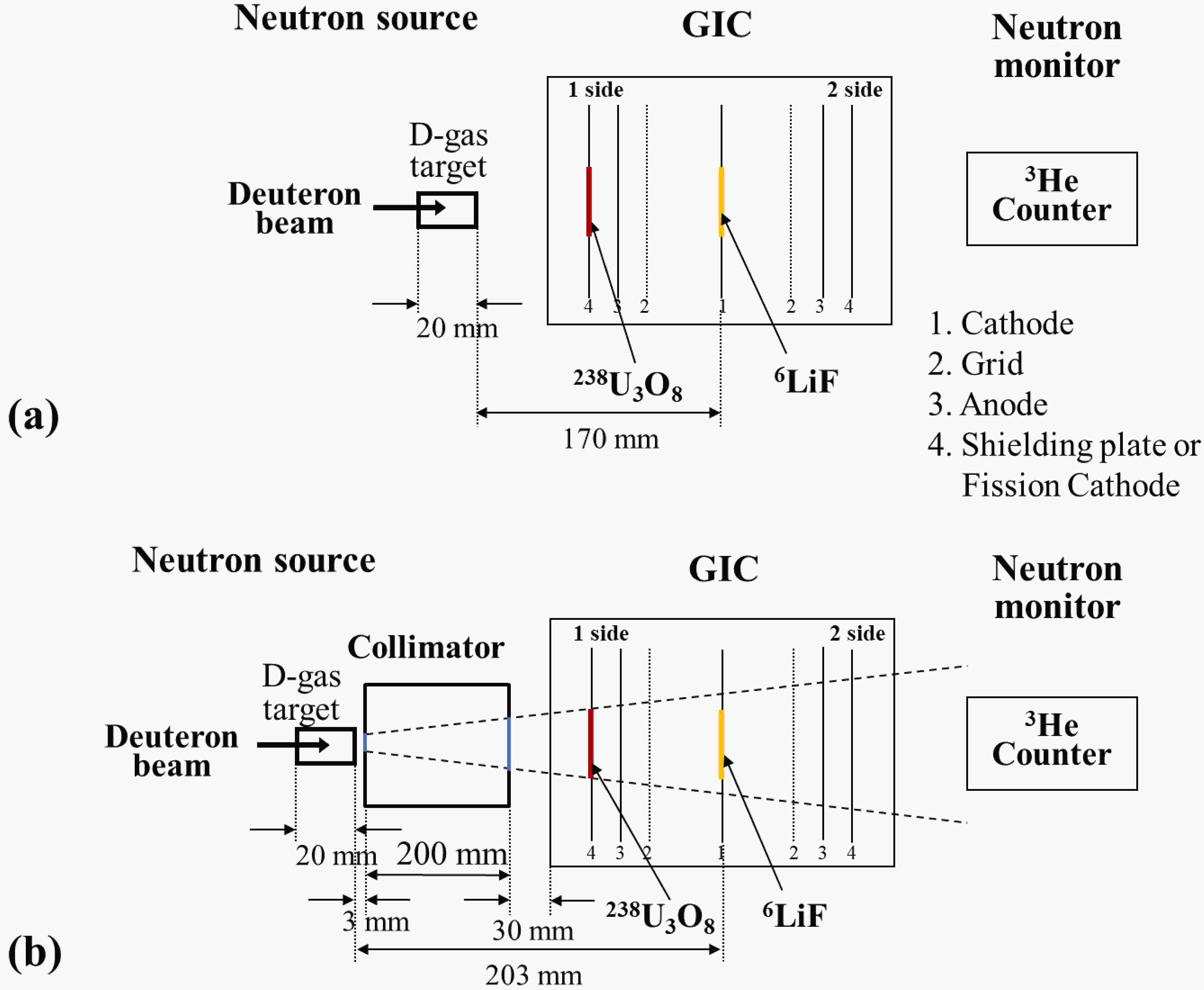 A steel collimator (20 cm×20 cm×20 cm) featuring a copper insert (60 mm diameter) with a conical aperture (10 mm entrance, 33 mm exit) was used to reduce the background from scattered and thermal neutrons. The copper insert reduces neutron scattering and improves beam collimation. The absolute neutron flux was measured using the 238U(n, f) reaction. Uranium samples were placed at defined positions on the cathode of the GIC. One of the 238U3O8 samples was glued to the GIC shielding plate, which then served as the fission cathode. In parallel, a long counter filled with 3He was employed as a secondary neutron flux monitor, with both methods yielding consistent results.
