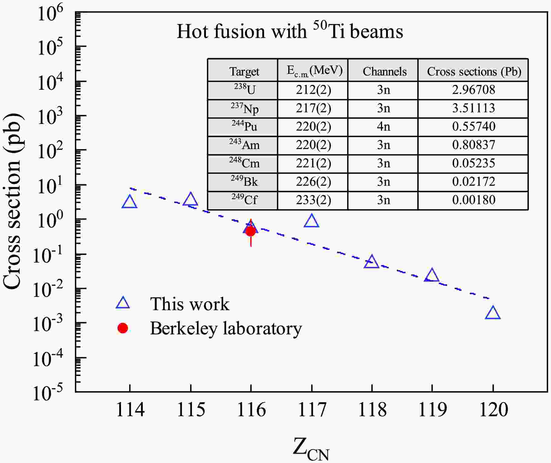 $ Z = 114{-}120 $ using$ ^{50} $ Ti beams. One can see that as the atomic number of the compound nucleus ($ Z_{\text{CN}} $ ) increases, the maximum cross section generally decreases. In addition, most reactions show maximum cross sections in the 3n exit channels, while the$ ^{50} $ Ti +$ ^{244} $ Pu reaction has its maximum cross section in the 4n exit channels. We predict that the production cross section for this reaction is$ \sigma_{\mathrm{prod}} = 0.55 $ pb, with a center-of-target center-of-mass energy of 220(2) MeV. The experimental result shows a production cross section of$ \sigma_{\mathrm{prod}} = 0.44^{+0.28}_{-0.58}$ pb at a center-of-target center-of-mass energy of 220(3) MeV. Our results, whether for the center-of-mass energy, maximum cross section, or exit channel, are in remarkable agreement with the experimental data reported in Ref. [11].