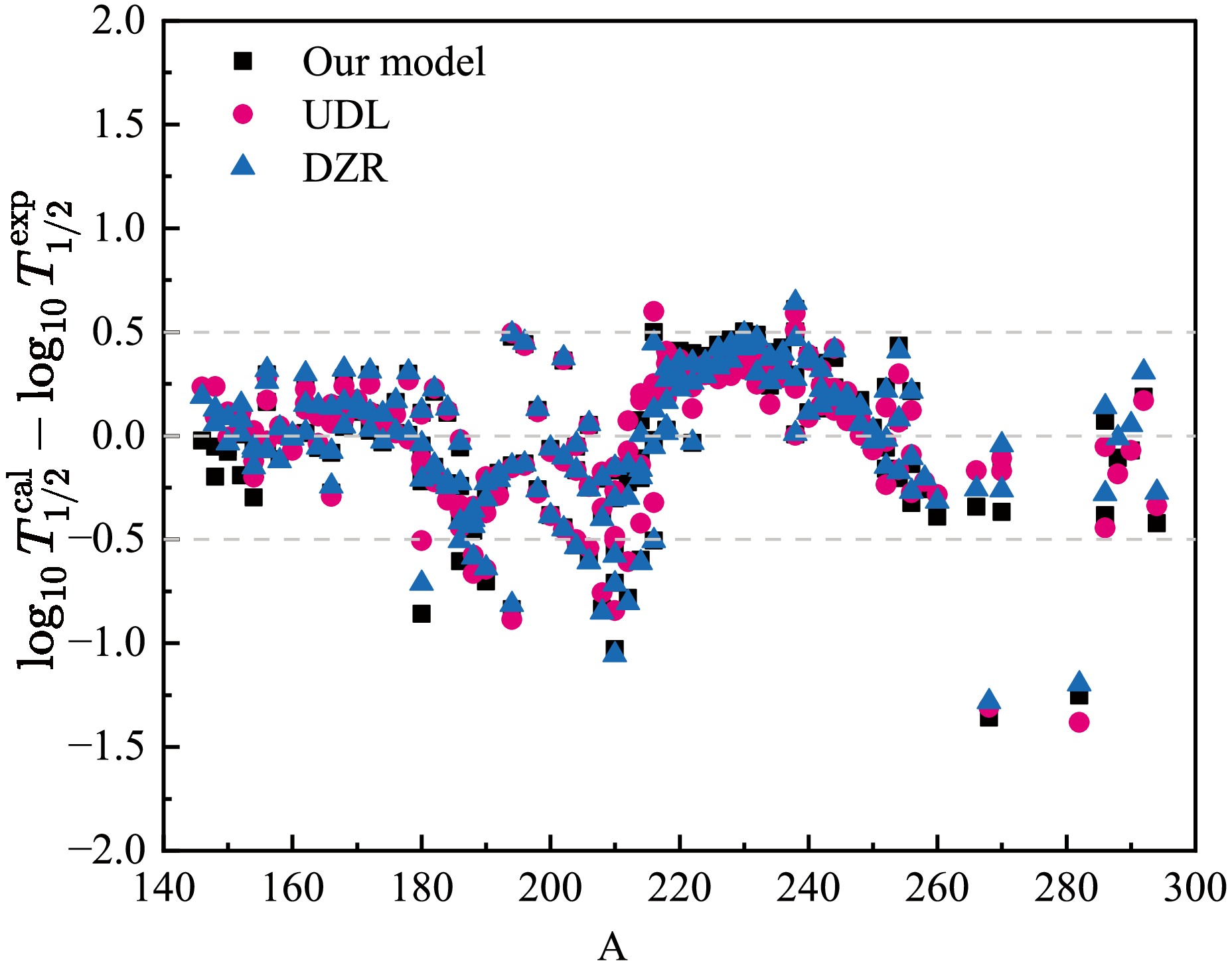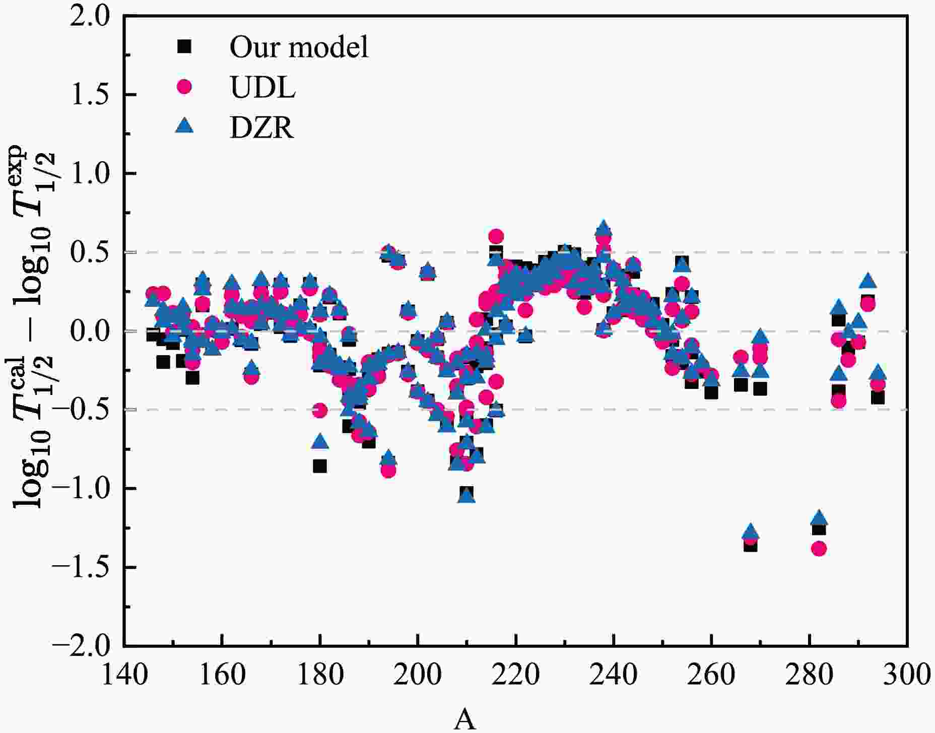 $ \log_{10} T_{1/2}^{{\rm{exp}}} $ and$ \log_{10} T_{1/2}^{{\rm{cal}}} $ are the logarithmic forms of experimental$ \alpha $ decay half-lives and the calculated ones, respectively. n is the number of nuclei involved in different decay cases. The standard deviation$ \sigma $ of the calculated results for the three models and/or formulas is shown in Table 4. From this table, we can clearly see that the standard deviation$ \sigma $ of our model only is 0.408 for all 559 nuclei, 0.323 for 177 even-even nuclei, 0.459 for 277 odd-A nuclei, and 0.391 for 105 odd-odd nuclei. These values are smaller than those of the UDL and DZR results, which proves that our model achieves satisfactory results.Formulas Total e-e e-o o-o Our model 0.408 0.323 0.459 0.391 UDL 0.589 0.349 0.633 0.632 DZR 0.436 0.337 0.493 0.423 Table 4. Standard deviations