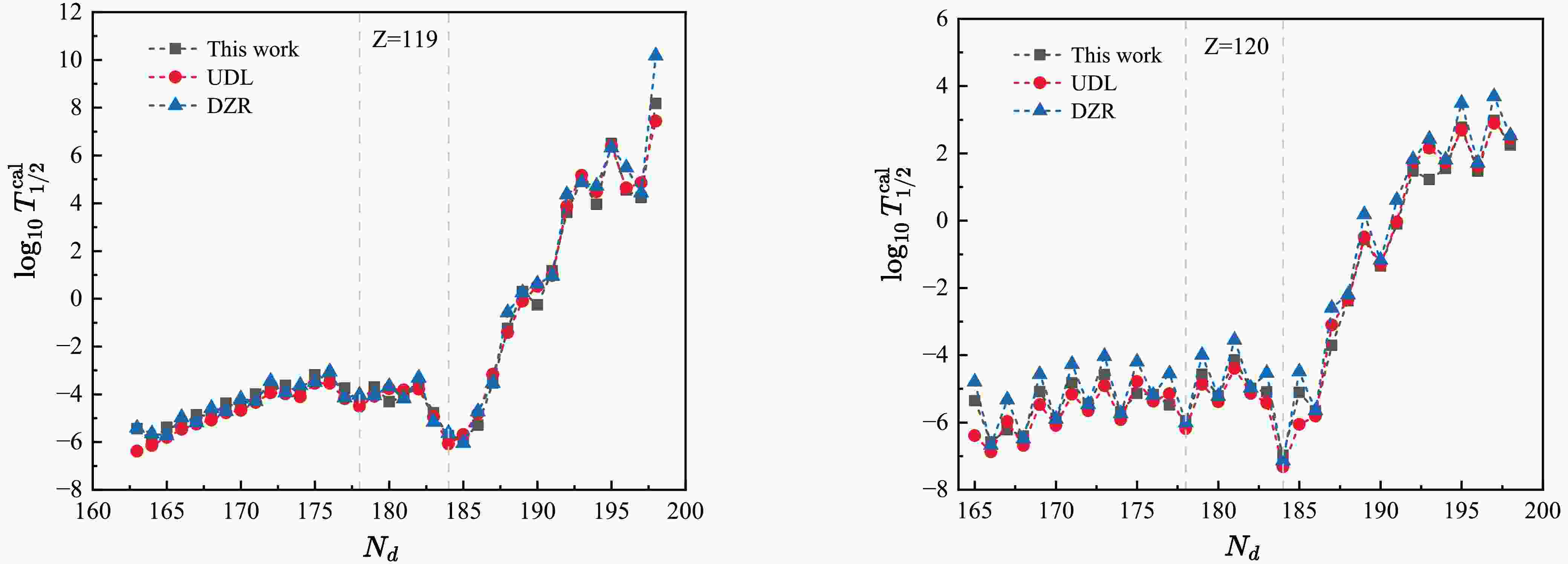 Nuclide $Q_{\alpha} $ /MeV$P_\alpha$ $\log_{10} T^{{\rm{exp}}}_{1/2}$ $\log_{10} T^{{\rm{cal}}}_{1/2}$ $\log_{10} T_{1/2}^{{\rm{UDL}}}$ $\log_{10} T_{1/2}^{{\rm{DZR}}}$ l 107Te 4.0051 0.1721 −2.34 −2.17 −2.65 −2.97 0 109I 3.9171 0.2638 −0.19 −0.66 −1.60 −1.12 2 113I 2.7061 0.2190 7.30 7.17 6.91 7.24 0 111Xe 3.7151 0.1794 0.85 0.52 0.15 −0.19 0 145Pm 2.3221 0.1659 17.30 17.68 17.51 17.77 0 147Sm 2.3114 0.1588 18.53 18.69 18.52 17.77 0 147Eu 2.9912 0.1723 10.96 11.48 11.41 11.53 0 151Eu 1.9640 0.1789 26.16 25.81 24.97 25.67 2 149Gd 3.0995 0.1581 11.27 11.18 11.10 10.52 0 151Gd 2.6522 0.1611 15.63 15.86 15.78 15.09 0 149Tb 4.0781 0.1835 4.95 5.00 4.29 4.64 2 151Tb 3.4957 0.1799 8.82 9.06 8.38 8.79 2 151Dy 4.1800 0.1796 4.28 4.26 4.24 3.83 0 153Dy 3.5591 0.1864 8.39 8.49 8.53 8.02 0 151Ho 4.6441 0.2212 2.20 2.12 2.18 2.11 0 153Ho 4.0161 0.2207 5.37 5.77 5.89 5.87 0 153Er 4.8021 0.1777 1.84 1.91 1.89 1.56 0 155Er 4.1181 0.1946 6.15 5.73 5.82 5.39 0 153Tm 5.2481 0.2314 0.21 0.19 0.27 0.17 0 155Tm 4.5721 0.2435 3.41 3.50 3.68 3.62 0 157Tm 3.8091 0.2352 7.46 8.37 8.58 8.58 0 155Yb 5.3381 0.1704 0.30 0.39 0.36 0.09 0 155Lu 5.8021 0.2359 −1.12 −1.20 −1.12 −1.24 0 157Hf 5.8751 0.1918 −0.91 −0.96 −0.95 −1.15 0 159Hf 5.2251 0.1778 1.16 1.83 1.89 1.61 0 161Hf 4.6791 0.1871 3.79 4.59 4.72 4.36 0 157Ta 6.2751 0.2821 −1.98 −2.16 −2.01 −2.14 0 159Ta 5.6601 0.2504 0.48 0.24 0.43 0.32 0 159W 6.4551 0.1658 −2.09 −2.16 −2.23 −2.37 0 161W 5.9251 0.1929 −0.25 −0.29 −0.22 −0.42 0 163W 5.5181 0.1747 1.27 1.43 1.51 1.26 0 167W 4.7511 0.1706 4.69 5.22 5.37 5.00 0 163Re 6.0121 0.2520 0.08 −0.32 −0.11 −0.25 0 165Re 5.6951 0.2537 1.03 0.94 1.20 1.07 0 169Re 5.0141 0.2280 5.18 5.12 4.45 5.09 3 163Os 6.6651 0.1625 −2.24 −2.08 −2.12 −2.24 0 165Os 6.3351 0.1892 −1.10 −1.01 −0.94 −1.10 0 167Os 5.9851 0.1750 0.21 0.33 0.42 0.22 0 169Os 5.7131 0.1778 1.40 1.43 1.56 1.33 0 171Os 5.3711 0.1731 2.66 2.97 3.13 2.84 0 173Os 5.0551 0.1765 3.73 4.51 4.72 4.38 0 167Ir 6.5051 0.2598 −1.17 −1.36 −1.14 −1.29 0 169Ir 6.1411 0.2543 −0.18 −0.02 0.24 0.09 0 171Ir 5.8651 0.2397 1.31 1.09 1.37 1.22 0 173Ir 5.5411 0.2365 2.41 2.50 2.81 2.67 0 175Ir 5.4301 0.2195 3.02 3.69 3.30 3.54 2 177Ir 5.0821 0.1885 4.69 4.80 5.06 4.92 0 167Pt 7.1651 0.1611 −3.04 −2.93 −2.99 −3.05 0 169Pt 6.8651 0.1883 −2.16 −2.07 −2.01 −2.11 0 171Pt 6.6051 0.1694 −1.28 −1.17 −1.11 −1.24 0 173Pt 6.3581 0.1808 −0.35 −0.33 −0.21 −0.37 0 177Pt 5.6431 0.1888 2.24 2.54 2.78 2.52 0 179Pt 5.4121 0.1658 3.94 4.34 3.86 3.84 2 181Pt 5.1501 0.1521 4.85 4.98 5.18 4.84 0 183Pt 4.8221 0.1405 6.61 6.80 7.00 6.60 0 185Pt 4.2801 0.1414 7.93 10.24 10.48 9.97 0 173Au 6.8361 0.2665 −1.53 −1.78 −1.52 −1.70 0 175Au 6.5851 0.2543 −0.65 −0.91 −0.64 −0.81 0 177Au 6.2971 0.2617 0.57 0.12 0.44 0.27 0 179Au 5.9811 0.2240 1.51 1.43 1.73 1.56 0 181Au 5.7511 0.1988 2.70 2.45 2.72 2.56 0 183Au 5.4661 0.1768 3.89 3.79 4.06 3.89 0 185Au 5.1800 0.1725 4.98 5.22 5.51 5.34 0 173Hg 7.3751 0.1887 −3.10 −2.95 −2.90 −2.94 0 175Hg 7.0751 0.1720 −2.00 −2.00 −1.94 −2.02 0 177Hg 6.7351 0.1878 −0.93 −0.24 −0.77 −0.61 2 179Hg 6.3511 0.1845 0.14 0.48 0.68 0.51 0 181Hg 6.2841 0.1915 1.12 1.37 0.91 1.01 2 183Hg 6.0381 0.1851 1.90 1.67 1.91 1.70 0 185Hg 5.7721 0.1792 2.91 2.81 3.07 2.82 0 177Tl 7.0671 0.2827 −1.61 −1.81 −1.50 −1.68 0 179Tl 6.7051 0.2677 −0.14 −0.57 −0.23 −0.40 0 181Tl 6.3221 0.2671 1.52 0.85 1.24 1.07 0 181Pb 7.2451 0.1716 −1.41 −1.15 −1.73 −1.51 2 183Pb 6.9281 0.1654 −0.27 −0.11 −0.66 −0.48 2 185Pb 6.6951 0.1686 1.26 0.68 0.17 0.32 2 187Pb 6.3931 0.1663 2.20 1.80 1.33 1.44 2 189Pb 5.9151 0.1622 3.97 3.78 3.37 3.41 2 187Bi 7.7791 0.2413 −1.43 −1.81 −3.14 −1.48 5 189Bi 7.2681 0.2261 −0.16 −0.24 −1.51 0.15 5 191Bi 6.4471 0.2144 1.39 1.17 1.52 1.32 0 193Bi 6.0211 0.1986 3.26 2.95 3.32 3.12 0 195Bi 5.5351 0.1858 5.78 5.23 5.64 5.44 0 209Bi 3.1373 0.0938 26.80 25.45 24.12 25.85 5 211Bi 6.7501 0.0903 2.11 1.56 −0.02 1.57 5 213Bi 5.9881 0.0924 5.12 4.60 3.14 4.73 5 189Po 7.6941 0.1906 −2.46 −1.95 −2.48 −2.22 2 191Po 7.4931 0.1849 −1.66 −2.03 −1.86 −1.90 0 193Po 7.0941 0.1840 −0.40 −0.75 −0.53 −0.61 0 195Po 6.7491 0.1699 0.69 0.48 0.72 0.59 0 197Po 6.4111 0.1577 1.80 1.79 2.05 1.87 0 199Po 6.0741 0.1498 3.64 3.20 3.48 3.25 0 201Po 5.7991 0.1368 4.92 4.46 4.74 4.46 0 203Po 5.4961 0.1329 6.29 6.62 6.24 6.19 2 205Po 5.3251 0.1198 7.19 6.85 7.13 6.76 0 207Po 5.2151 0.1111 7.99 7.46 7.71 7.32 0 209Po 4.9770 0.1037 9.59 8.84 9.08 8.65 0 211Po 7.5946 0.0884 −0.29 −0.85 −2.54 −1.19 5 213Po 8.5357 0.1804 −5.43 −5.35 −5.37 −5.33 0 215Po 7.5263 0.1775 −2.75 −2.53 −2.39 −2.45 0 217Po 6.6621 0.1726 0.20 0.42 0.69 0.53 0 219Po 5.9161 0.1673 3.34 3.51 3.88 3.60 0 191At 7.7141 0.1984 −2.68 −2.35 −2.15 −2.37 0 193At 7.3891 0.2661 −1.54 −1.49 −1.11 −1.33 0 195At 7.1021 0.2380 −0.54 −0.51 −0.14 −0.36 0 197At 7.1051 0.2142 −0.39 −0.51 −0.18 −0.41 0 199At 6.7781 0.1974 0.89 0.67 1.01 0.78 0 201At 6.4731 0.1748 2.07 1.88 2.20 1.97 0 203At 6.2101 0.1656 3.15 2.96 3.30 3.07 0 205At 6.0191 0.1456 4.20 3.83 4.14 3.90 0 207At 5.8731 0.1318 4.81 4.51 4.79 4.56 0 209At 5.7571 0.1209 5.69 5.07 5.33 5.09 0 211At 5.9825 0.0938 4.79 4.08 4.21 3.95 0 213At 9.2537 0.1871 −6.90 −6.73 −6.84 −7.16 0 215At 8.1771 0.1779 −4.43 −4.06 −3.99 −4.30 0 217At 7.2021 0.1679 −1.49 −1.08 −0.87 −1.17 0 219At 6.3421 0.1582 1.78 2.14 2.46 2.17 0 195Rn 7.6941 0.1830 −2.15 −1.93 −1.73 −1.75 0 197Rn 7.4101 0.1814 −1.27 −1.05 −0.81 −0.86 0 199Rn 7.1321 0.1706 −0.23 −0.12 0.14 0.05 0 203Rn 6.6301 0.1527 1.82 1.72 2.00 1.85 0 205Rn 6.3861 0.1407 2.84 3.39 2.99 3.08 2 207Rn 6.2511 0.1340 3.42 3.27 3.55 3.33 0 209Rn 6.1551 0.1219 4.00 3.70 3.95 3.71 0 211Rn 5.9661 0.1142 5.28 5.23 4.79 4.81 2 213Rn 8.2451 0.0978 −1.71 −2.06 −3.75 −2.32