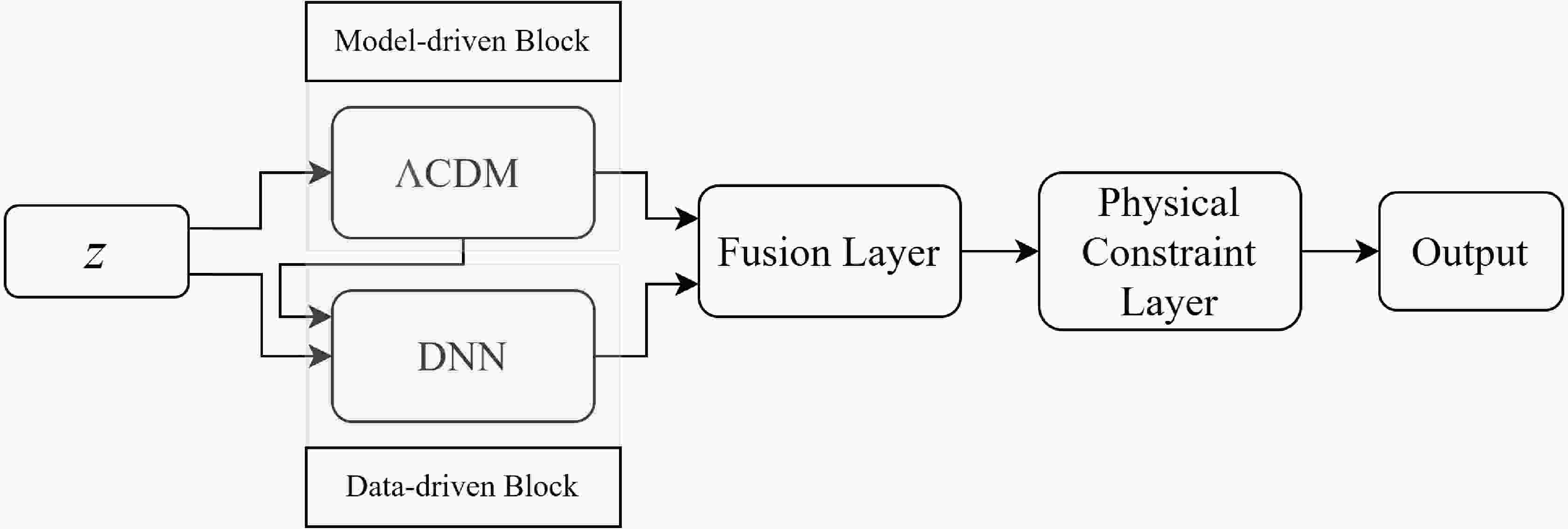 We design a deep neural network architecture based on the residual network (ResNet) framework [39], comprising multiple residual blocks that may incorporate either explicit mathematical functions or neural modules. Our approach incorporates theoretical guidance from $ \Lambda $CDM directly into the learning process, not as a fixed prior but as an auxiliary signal that helps stabilize and guide training. Although the $ \Lambda $CDM model faces both theoretical and observational challenges, it continues to serve as the prevailing framework in modern cosmology and provides a useful reference for assessing the performance of reconstruction methods [21, 29, 3132]. It should be noted that, once embedded in the network, the $ \Lambda $CDM form no longer carries cosmological meaning: it acts solely as a mathematical template, with parameters treated as trainable hyperparameters optimized alongside other network hyperparameters, entirely detached from their physical interpretation. This design enables the network to generalize more effectively in under-constrained regions while preserving model independence.
