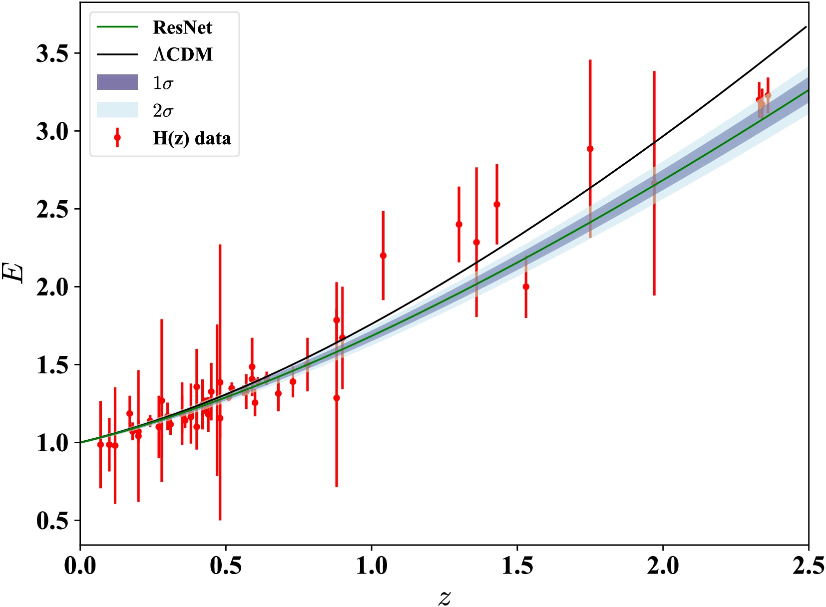 Figure 2 shows the reconstruction of E(z) using H(z) measurements. The green line denotes the ResNet output, with 1$ \sigma $ and 2$ \sigma $ credible regions shaded in dark and light blue, respectively. The H(z) data points are shown in red, while the black curve is the reference curve representing the standard $ \Lambda $CDM model with fiducial parameters $ \{\Omega_m,H_0\} = \{0.3,\ 70\ \mathrm{km\ s^{-1}\ Mpc^{-1}} \} $. The reconstruction aligns well with the $ \Lambda $CDM model up to redshift $ z\sim1 $, but exhibits a mild downward deviation at higher redshifts. This deviation is informed by the limited coverage and larger dispersion of the high-z data, suggesting that the network remains sensitive to the observed data and does not simply revert to model expectations in data-sparse regimes.