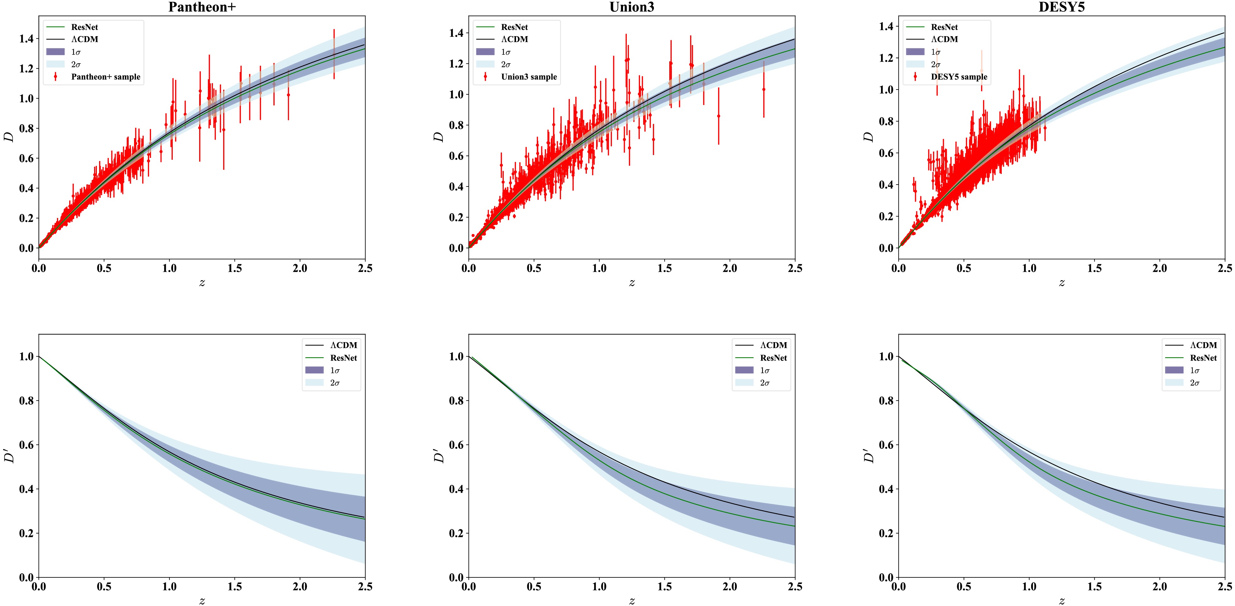 • We apply the ResNet-based deep learning framework—implemented in TensorFlow 1—to reconstruct the dimensionless Hubble parameter E(z) and the comoving distance D(z) from observational datasets, and further obtain the derivative D'(z) through numerical differentiation. Unlike conventional deep learning methods that may yield non-smooth outputs due to their discrete predictions, our ResNet architecture enables smooth function reconstruction, which is essential for reliable numerical differentiation and curvature diagnostics.