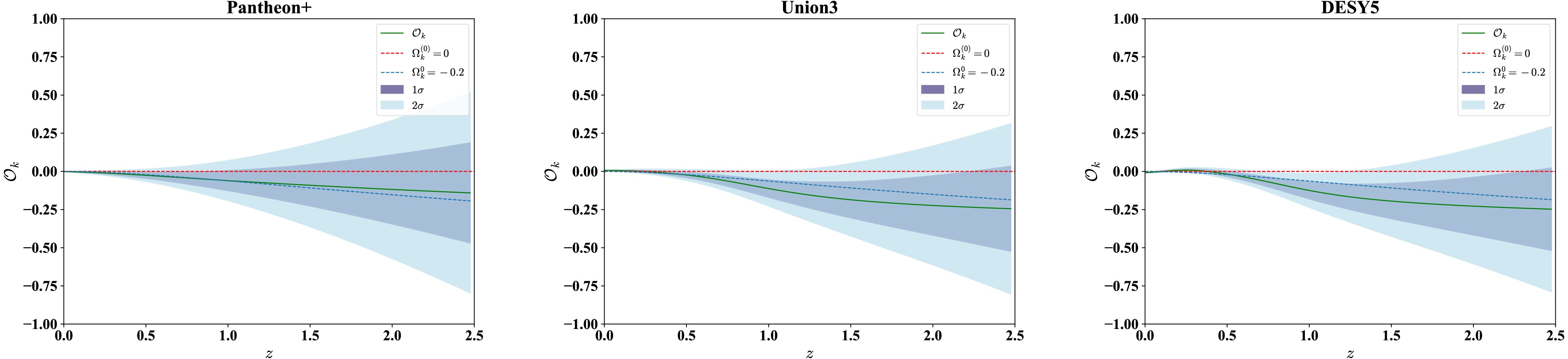 The reconstruction based on Union3 is consistent with flatness at low redshift but exhibits a systematic downward drift beyond $ z\sim0.5 $. In this regime, the median curve remains persistently below zero, with the 1$ \sigma $ band no longer fully encompassing the flat line, and approaches the negative-curvature reference. At certain redshifts, the deviation extends toward the 2$ \sigma $ level, suggesting a stronger preference for negative curvature that may reflect sample distribution and intrinsic dispersion within Union3.