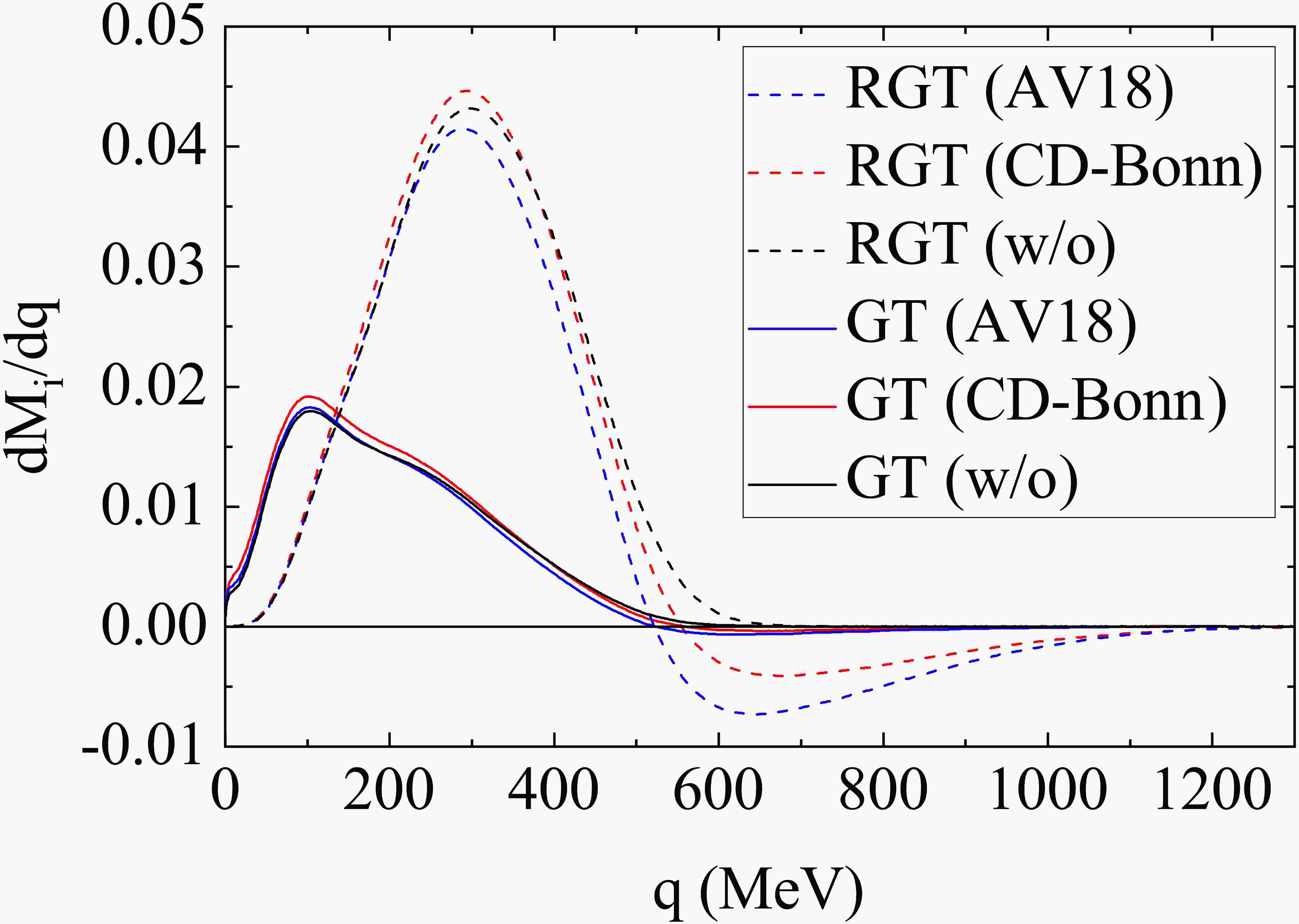$ M_{RGT} $ and$ M_{GT} $ in Fig. 1, by comparing the results with or without SRC. One can clearly see that for$ M_{GT} $ , the largest contribution comes from the momentum around 100 MeV ($ m_\pi $ ), whereas for$ M_{RGT} $ , the major contribution is dominated by the region where momentum is around 300 MeV. This is mainly due to an additional$ q^2 $ multiplied by the spherical Bessel function$ j_0 (qr) $ in the integrand (8), which enhances the contribution from higher transfer momentum. This implies the importance of short-range contributions for this part of NME, which is why the SRC, which alters the short-range behavior of various operators, plays an important role here. As shown in Fig. 1, there is a notable difference in the results with or without SRC in the region where q > 600 MeV for$ M_{RGT} $ . When the SRC is not included, we see no contribution to$ M_{RGT} $ from these high momenta, similar to what is seen for the GT part in the mass mechanism. But if the SRC is included, the behavior for$ M_{GT} $ and$ M_{RGT} $ differs greatly; a strong cancellation appears in this high momentum region for the latter. Meanwhile, a cancellation is barely observed for$ M_{GT} $ . Therefore, from Fig. 1, we find that the reduction from SRC for$ M_{RGT} $ mainly comes from a drastic distortion of the transition strength distributions as a function of exchange momentum. The magnitude of the changes from the two SRC's differs by about 20 percent. Compared to the CD-Bonn SRC, the AV18 SRC reduces the strength at the low q peak and enhances the high q reduction. While for the CD-Bonn SRC, the reduction at high q overwhelms the enhancement at low q, contrary to the case of$ M_{GT} $ . This emphasizes the importance of correctly describing the short-range behaviors of the nuclear force. -