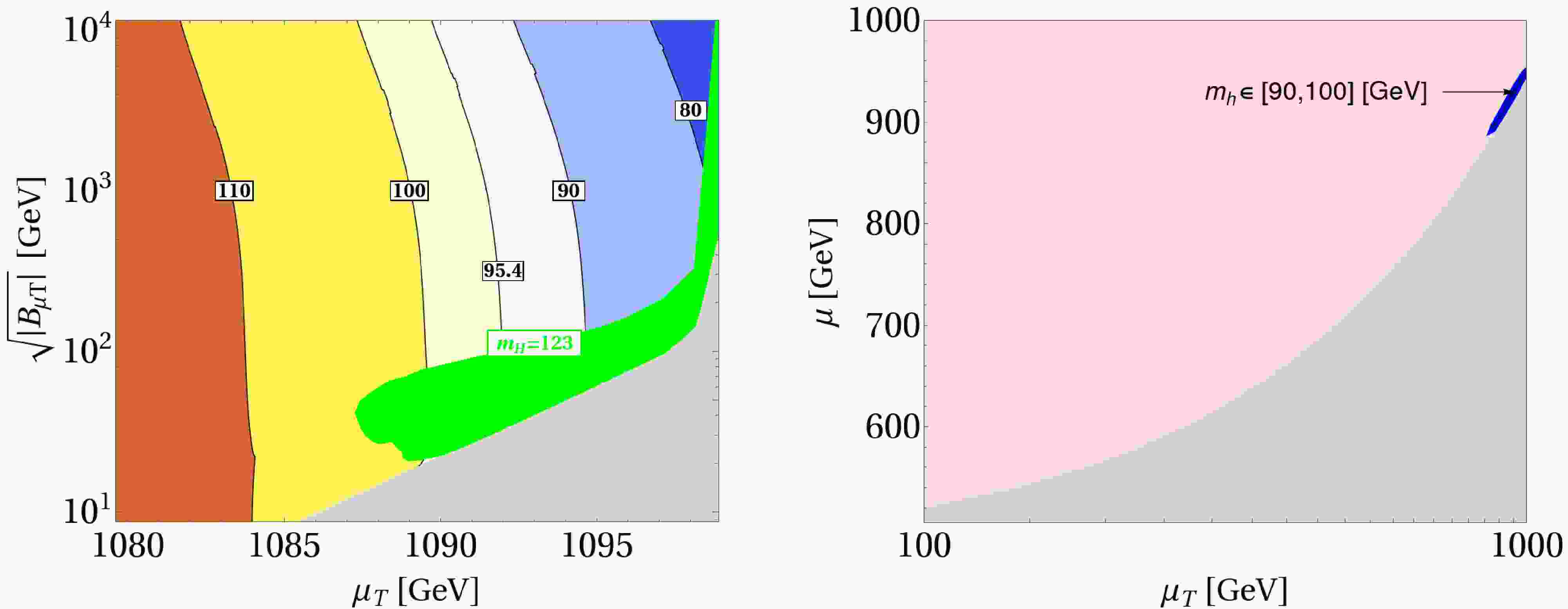 $ m_H $ in the$ A_0 $ -$ M_S $ parameter space, with$ \mu=1\; \mathrm {TeV} $ ,$ \mu_T=1.092\; \mathrm {TeV} $ , and$ B_{\mu_T}=5\left ( \mathrm {TeV}\right ) ^{2} $ . Right: Contour plot of the SM Higgs boson mass$ m_H $ in the$ \mu-\mu_T $ parameter space, with$ M_S=5.01\; \mathrm {TeV} $ ,$ A_0=12\; \mathrm {TeV} $ , and$ B_{\mu_T} =5\left ( \mathrm {TeV}\right ) ^{2} $ .The region in the right panel of Fig. 2 is in fact a zoomed-in view of the purple region in the right panel of Fig. 1. Although the triplet sector is nominally decoupled, the triplet parameter