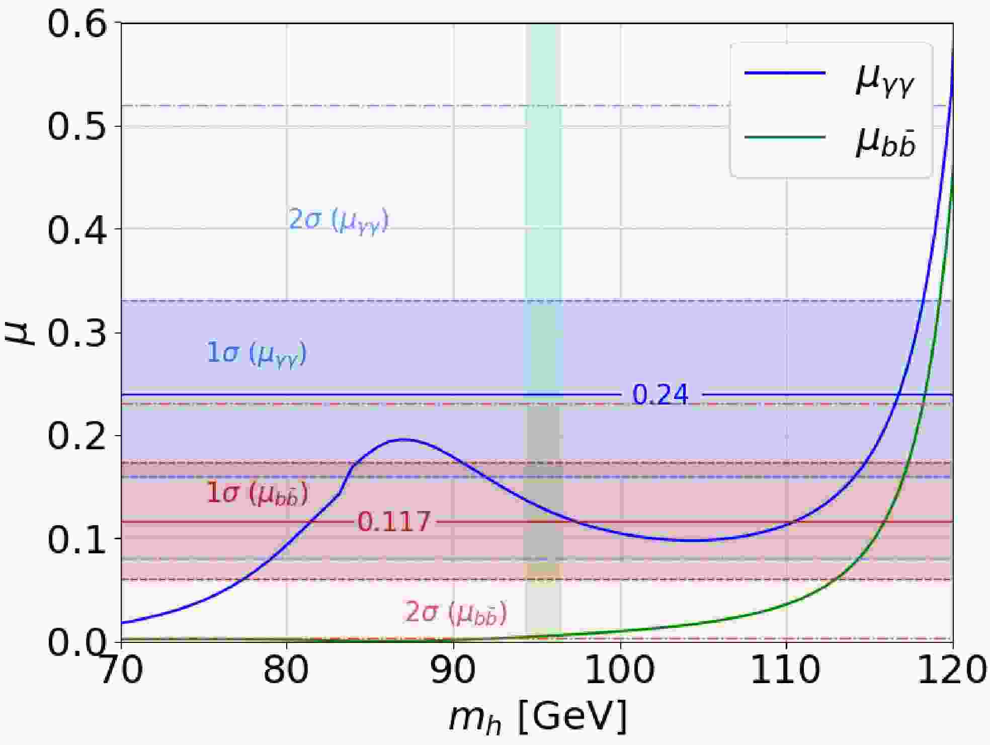 $ m_h=95.4 $ GeV and SM-like couplings. The observed signal strength of$ b\bar{b} $ near 95 GeV is consistent with zero (Fig. 3). The shaded blue band indicates the$ 1\sigma $ region for$ \mu_{\gamma\gamma} $ , whereas the light‐blue envelope shows its$ 2\sigma $ extension. Similarly, the dark‐red band represents the$ 1\sigma $ interval for the$ b\bar b $ channel, and the pale‐red shading corresponds to the$ 2\sigma $ bounds. The light-green strip highlights the mass window of$ m_h=95.4\pm 1\; {\rm{GeV}} $ . Given that the excess signals observed in the LEP, CMS, and ATLAS near 95 GeV are only valid within this specific range, the constraints on$ \mu_{\gamma\gamma} $ and$ \mu_{b\bar{b}} $ specifically refer to the mass window of$ m_h = 95.4 \pm 1\; {\rm{GeV}} $ . -