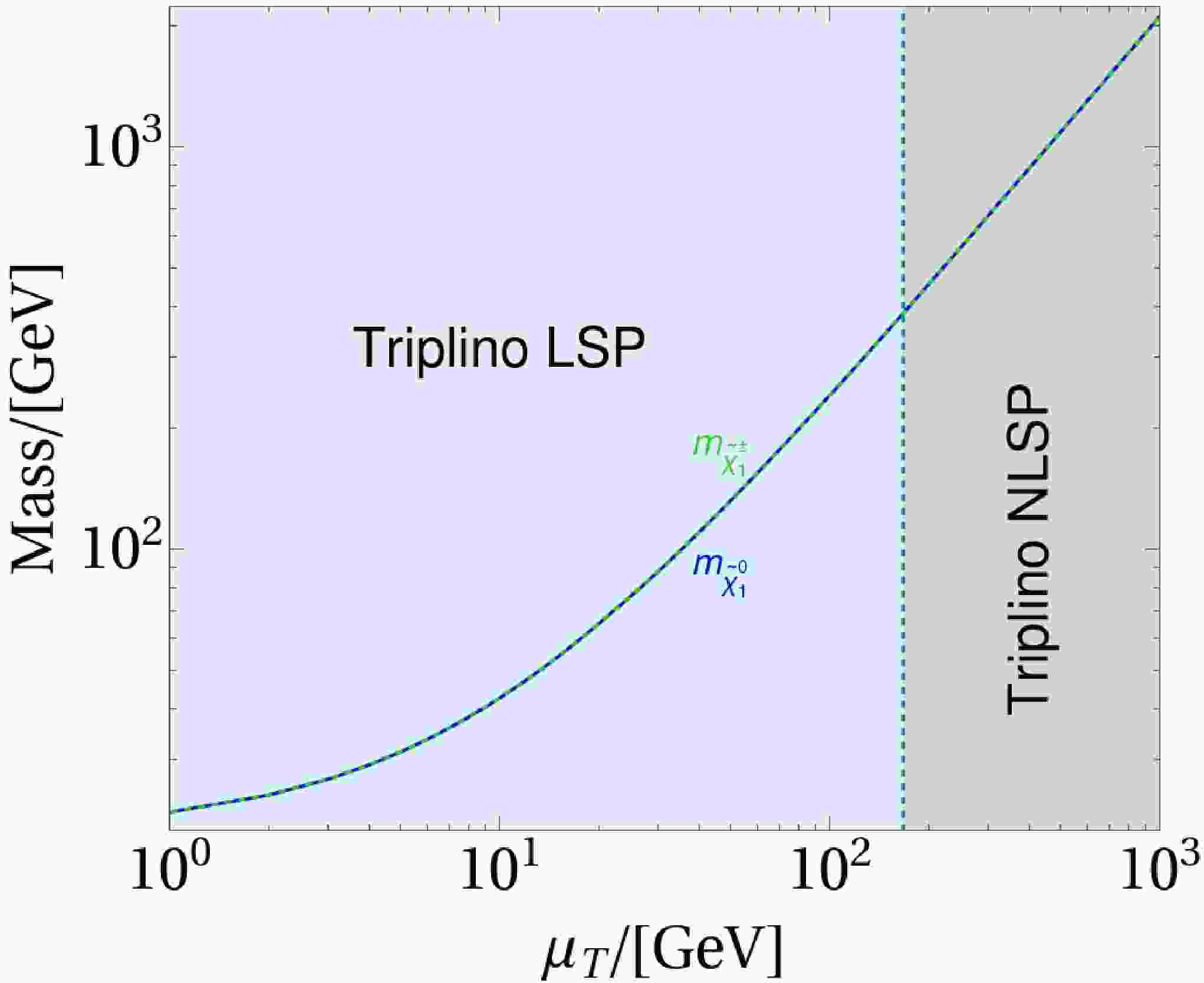 $ \mu_T = 50\; {\rm{GeV}} $ with$ \mu_T \ll M_1, M_2, \mu $ , ensuring the triplino is the LSP. However, the relic density is low, approximately$ 10^{-4} $ , due to strong$ {\rm{SU}}(2) $ interactions similar to those of the wino, which requires a mass of$ \sim 2\; {\rm{TeV}} $ to match the observed relic density. Although a heavy triplino LSP appears viable for dark matter, Fig. 5 shows that the triplino ceases to be the LSP above$ \sim 100\; {\rm{GeV}} $ . At tree level, with$ \mu \gg M_1, M_2 $ , the neutral and charged triplinos are nearly degenerate ($ m \approx 2\mu_T $ ) and dominate the LSP, as shown in Fig. 5. As$ \mu_T $ increases, loop corrections raise the neutral triplino’s mass more than the charged triplino’s, because the neutral triplino, a Majorana fermion, experiences larger Z-boson and scalar loop effects, while the charged triplino, a Dirac fermion, incurs smaller photon and W-boson corrections. This inverts the mass hierarchy, making the charged triplino the LSP. Consequently, we adopt a bino LSP for this study.