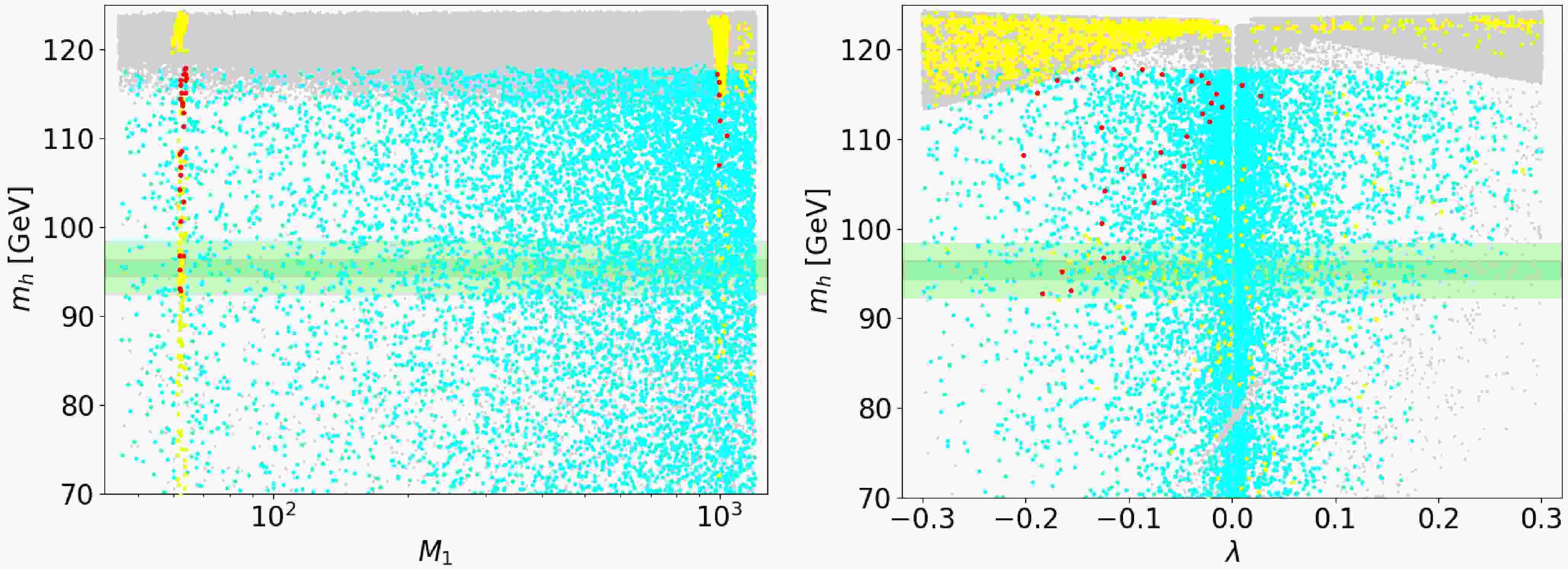 $ m_h $ and$ M_1 $ , whereas the right panel presents the correlation between$ m_h $ and λ. The color scheme follows the description in the color conditions and the surrounding context. The green band represents$ m_h=95.4\pm 1\; \mathrm {GeV} $ , and the light green area represents$ m_h=95.4\pm 3\; \mathrm {GeV} $ .In the right panel in Fig. 6, the quartic coupling λ exhibits a