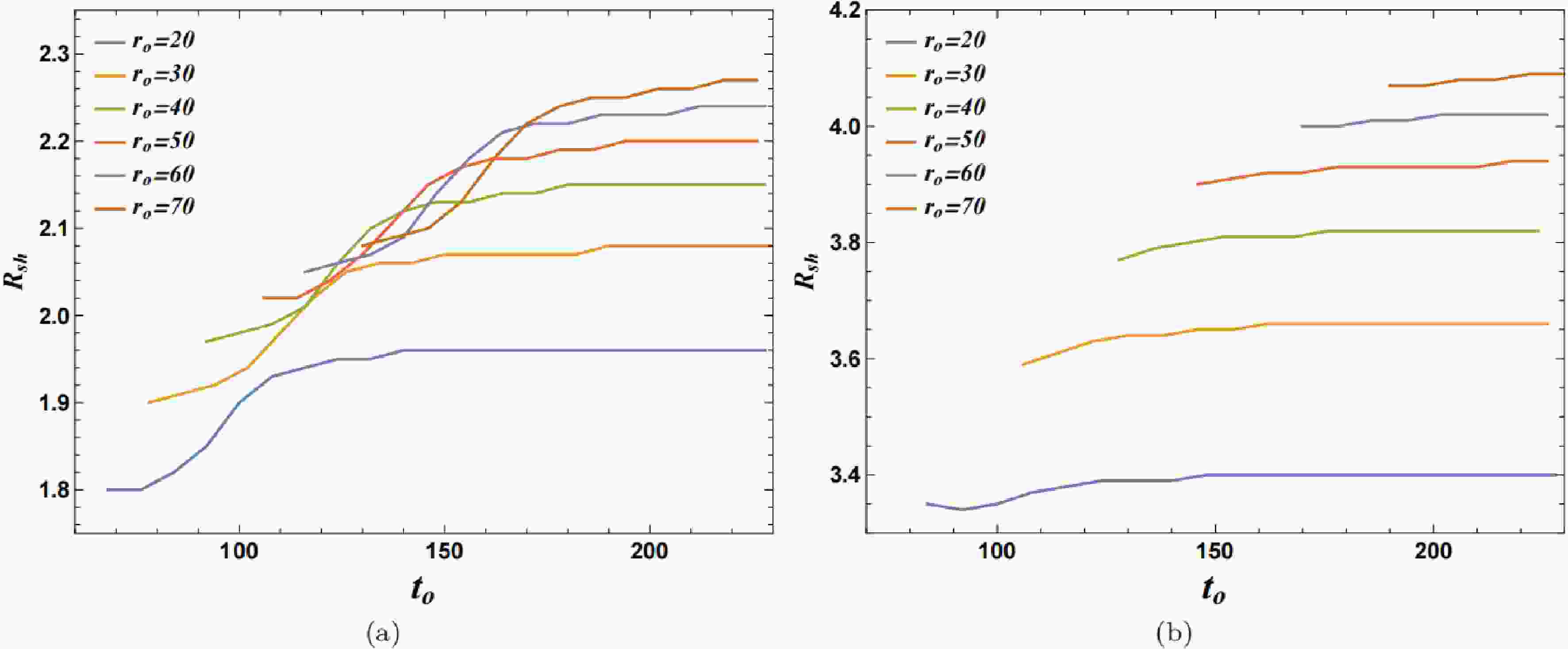 $ R_{\rm sh} $ with observer time$ t_{\rm o} $ for different observer distances$ r_{\rm o} $ . (a) Shadow radius$ R_{\rm sh} $ for this dynamic black hole with an accretion disk. (b) Shadow radius$ R_{\rm sh} $ without an accretion disk.To investigate the characteristics of the black hole shadow at every time point, we slice the dynamical spacetime into spacelike hypersurfaces at different times t. At every spacelike hypersurface, the time t is fixed. We can study the black hole shadow in the spacelike hypersurface at any moment. Figure 12 shows the black hole shadows with