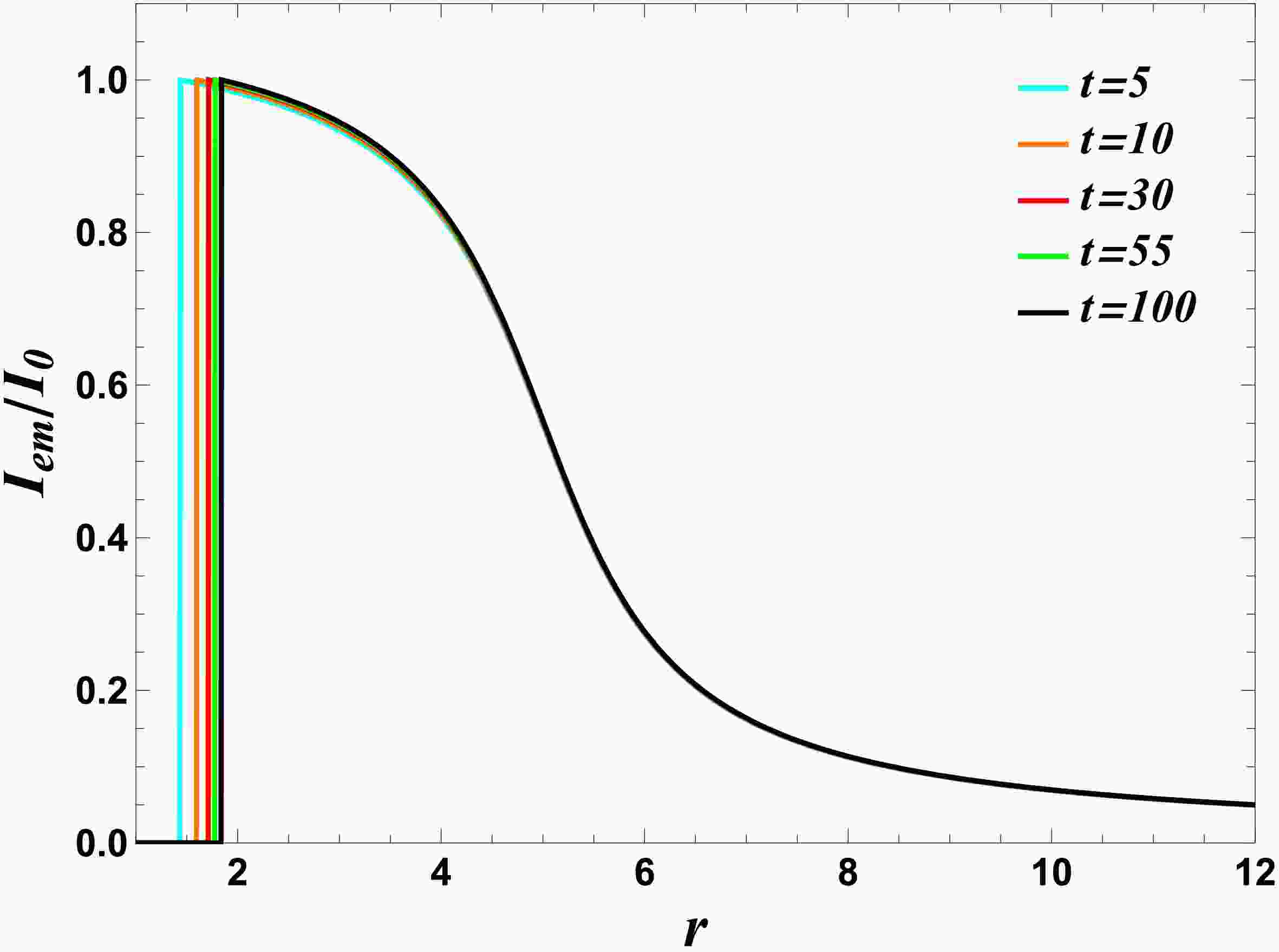 $ I_{\rm{em}}(t,r)= \left\{\begin{array}{*{20}{l}} I_0\dfrac{\dfrac{\pi}{2}-\tan^{-1}(r-5)}{\dfrac{\pi}{2}-\tan^{-1}[r_{\rm{h}}(t)-5]},& r>r_{\rm{h}}\\ 0, & r \leq r_{\rm{h}}. \end{array}\right. $