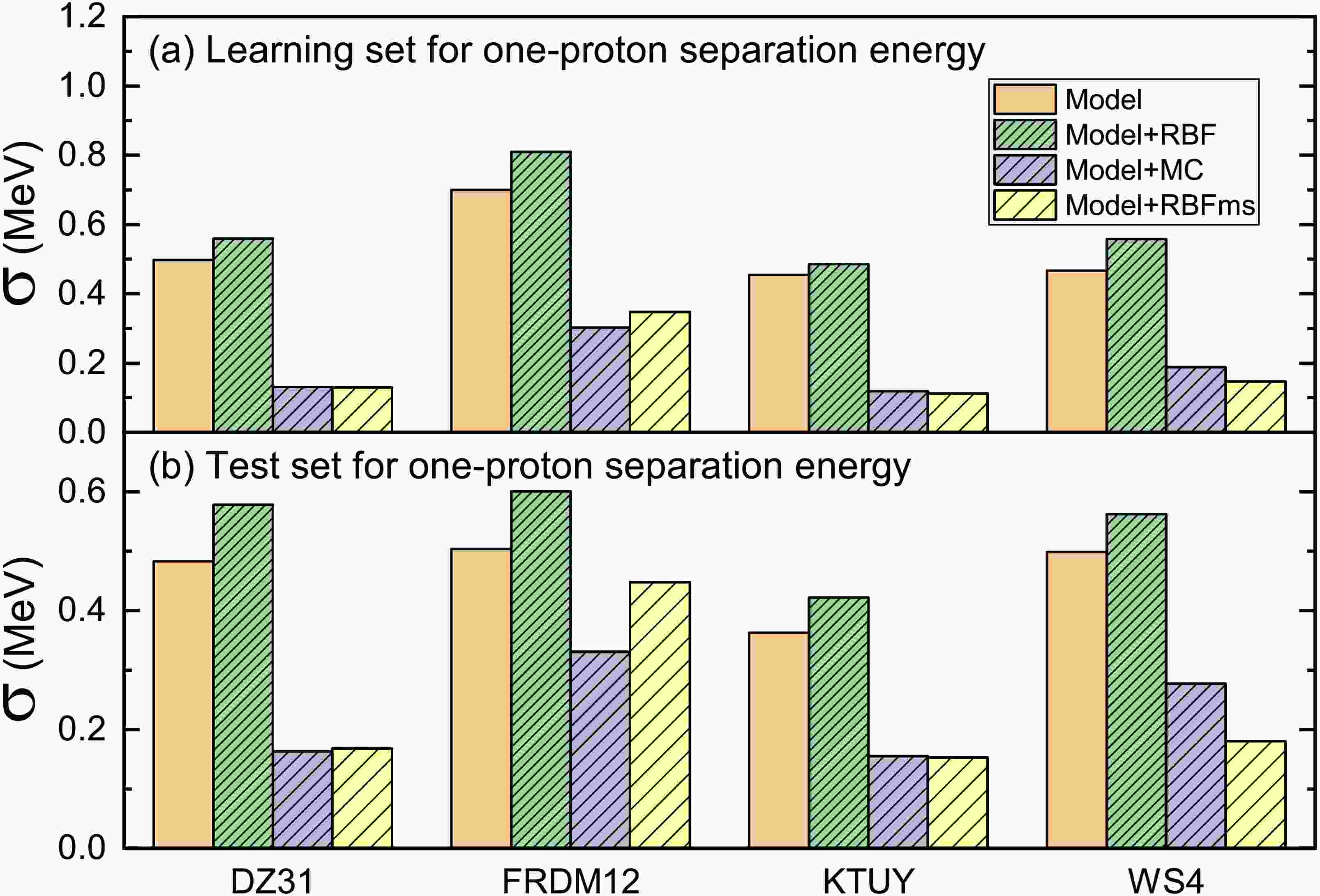 To enhance the predictive performance of nuclear mass models, contemporary research has integrated advanced machine learning techniques including radial basis function (RBF) [22−27], Bayesian neural networks (BNNs) [28−33], kernel ridge regression (KRR) [34−38], and other machine learning [39−46] approaches. These data-driven approaches offer complementary advantages to traditional theoretical frameworks by capturing non-linear correlations within nuclear data, thereby improving the accuracy of mass predictions across the nuclide chart. Among them, the RBF approach is one of the earlier machine learning approaches applied to the prediction of nuclear masses. The RBF approach utilizes inherently linear basis functions with no computational parameters requiring optimization. In 2011, Wang et al. [22] employed the RBF approach to achieve an impressive root-mean-square (rms) deviation of merely 0.2 MeV when describing 2,149 experimental nuclear mass data from AME2003 [47]. The RBF approach not only improves the accuracy of the model's description nuclear mass, but also further enhances the accuracy of describing the two-proton separation energy and two-neutron separation energy. However, when it comes to describing the one-proton separation energy and one-neutron separation energy, the results it provides are worse than those directly given by the nuclear mass model. Niu et al. subsequently introduced a significant refinement by incorporating odd-even staggering effects during the training phase, which further reduced the rms deviation to approximately 0.135 MeV [25], and the descriptions of the one-proton separation energy and one-neutron separation energy have also improved. However, the RBF approach that takes into account the odd-even effect has a poorer description of the two-proton separation energy and two-neutron separation energy. Therefore, it is an interesting research question whether there is a way to enable the RBF approach to simultaneously improve the prediction accuracy of the nuclear mass model for the one and two nucleons separation energies.