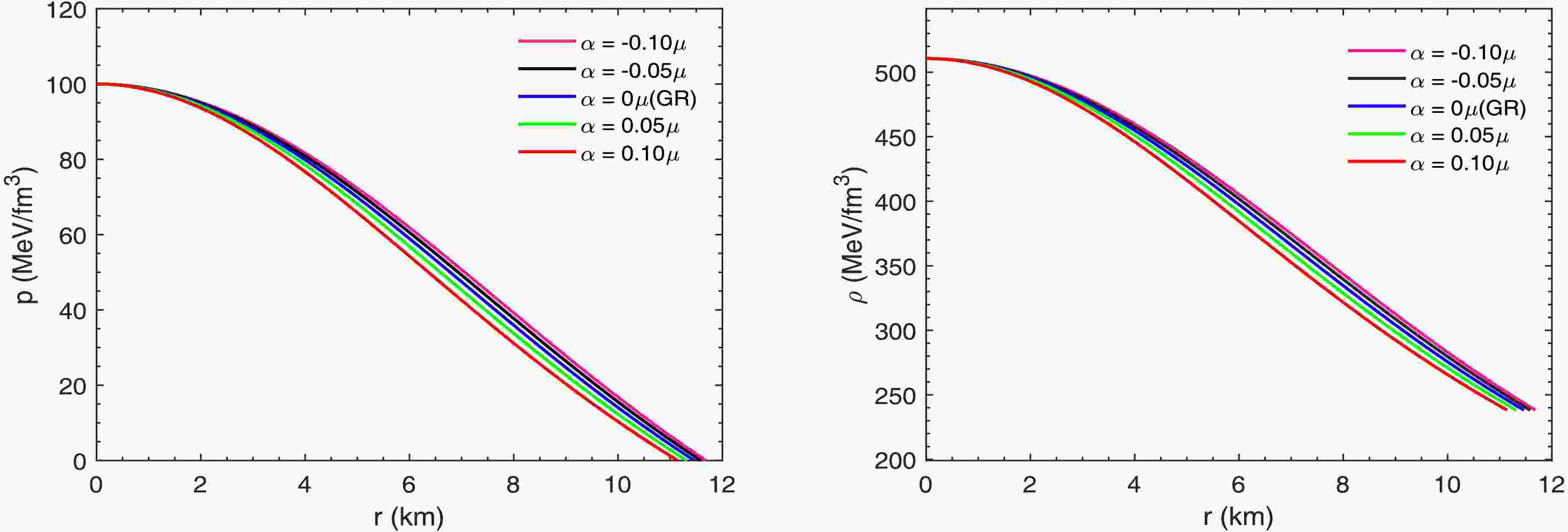 $ L_{m}=-\rho $ and$ L_{m}=p $ . Different forms of the Lagrangian density not only simplify the expression of the field equations but also influence the internal structural properties of compact objects (for more discussion on this topic, see Ref. [82] for more discussion). In this study, we choose the matter Lagrangian density as$ L_{m}=-\rho $ and combine it with Eq. (13), thus simplifying the field equation Eq. (10) to$ R_{\mu\nu}-\frac{1}{2}g_{\mu\nu}R=\Big[8\pi+\frac{3\alpha}{2}(p-\rho)\Big]T_{\mu\nu}-\alpha\rho^{2}g_{\mu\nu}. $