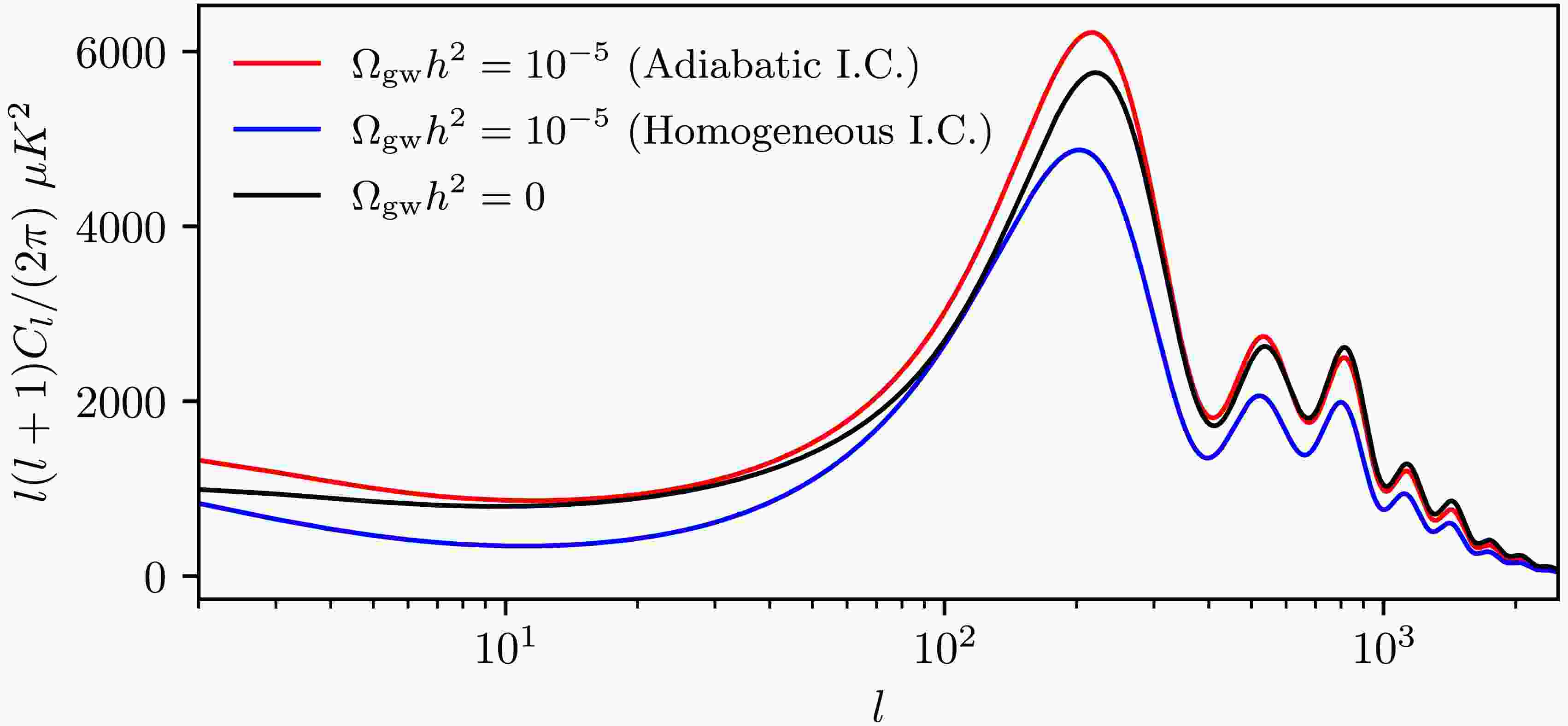 Figure 1.  (color online) Effect of Adiabatic Versus Homogeneous Initial Conditions on the CMB Temperature Angular Power Spectrum. Here, we consider only the ΛCDM model for the sake of illustration.