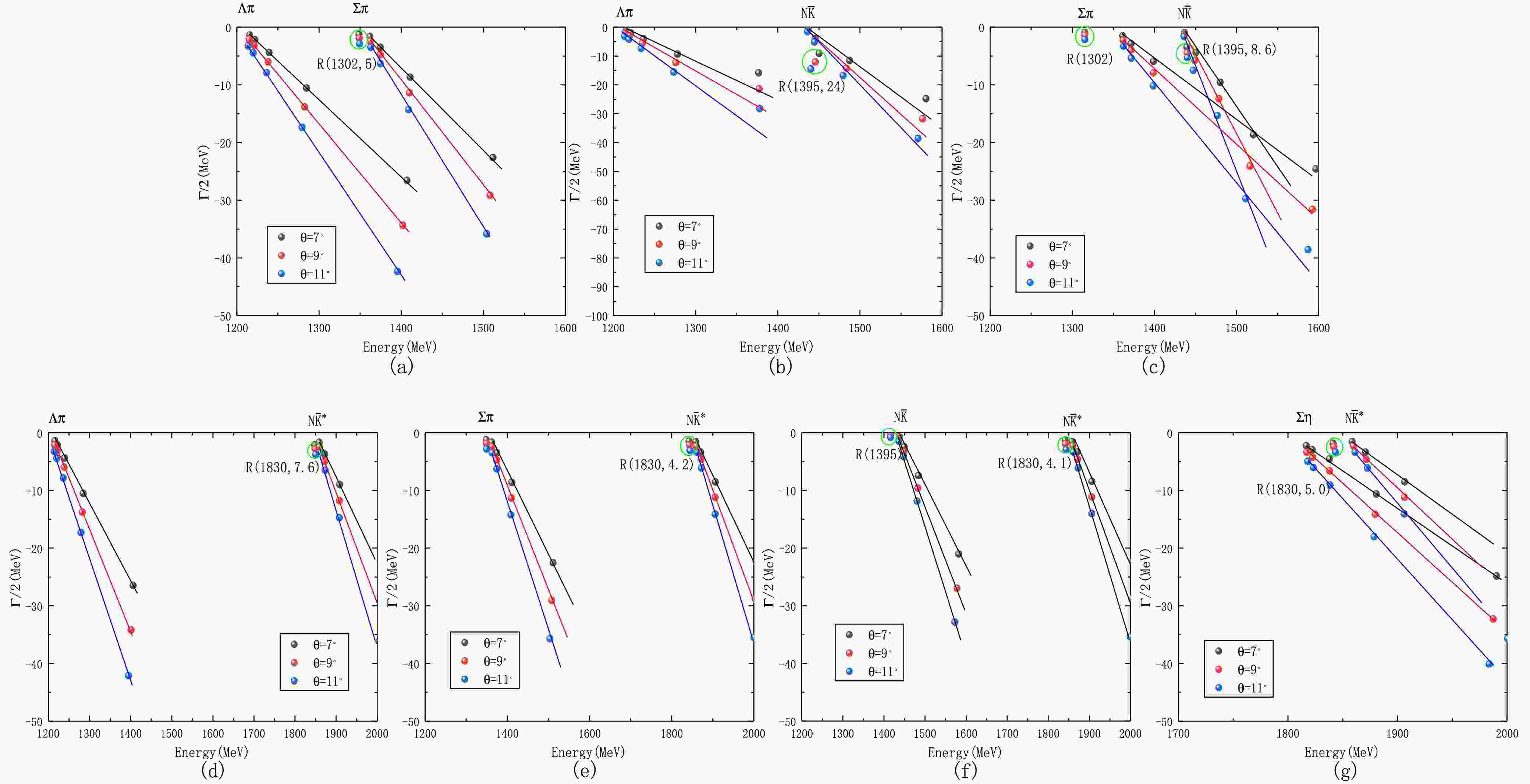 $ \Sigma(1/2^{-}) $ five-quark system.(a)$ \Sigma \pi \rightarrow \Lambda \pi $ . (b)$ N \bar{K} \rightarrow \Lambda \pi $ . (c)$ N \bar{K} \rightarrow \Sigma \pi $ . (d)$ N \bar{K}^{*} \rightarrow \Lambda \pi $ . (e)$ N \bar{K}^{*} \rightarrow \Sigma \pi $ . (f)$ N \bar{K}^{*} \rightarrow N \bar{K} $ . (g)$ N \bar{K}^{*} \rightarrow \Sigma \eta $ .Decay channels $ R(1302) $ P $ R(1395) $ P $ R(1830) $ P $ \Lambda \pi $ 5.0 100% 24.0 74% 7.6 37% $ \Sigma \pi $ … … 8.6 26% 4.2 20% $ N \bar{K} $ … … … … 4.1 19% $ \Sigma \eta $ … … … … 5.0 24% Total 5.0 32.6 20.9 Table 5. Various decay channels and corresponding decay widths of obtained resonances. (unit: MeV)