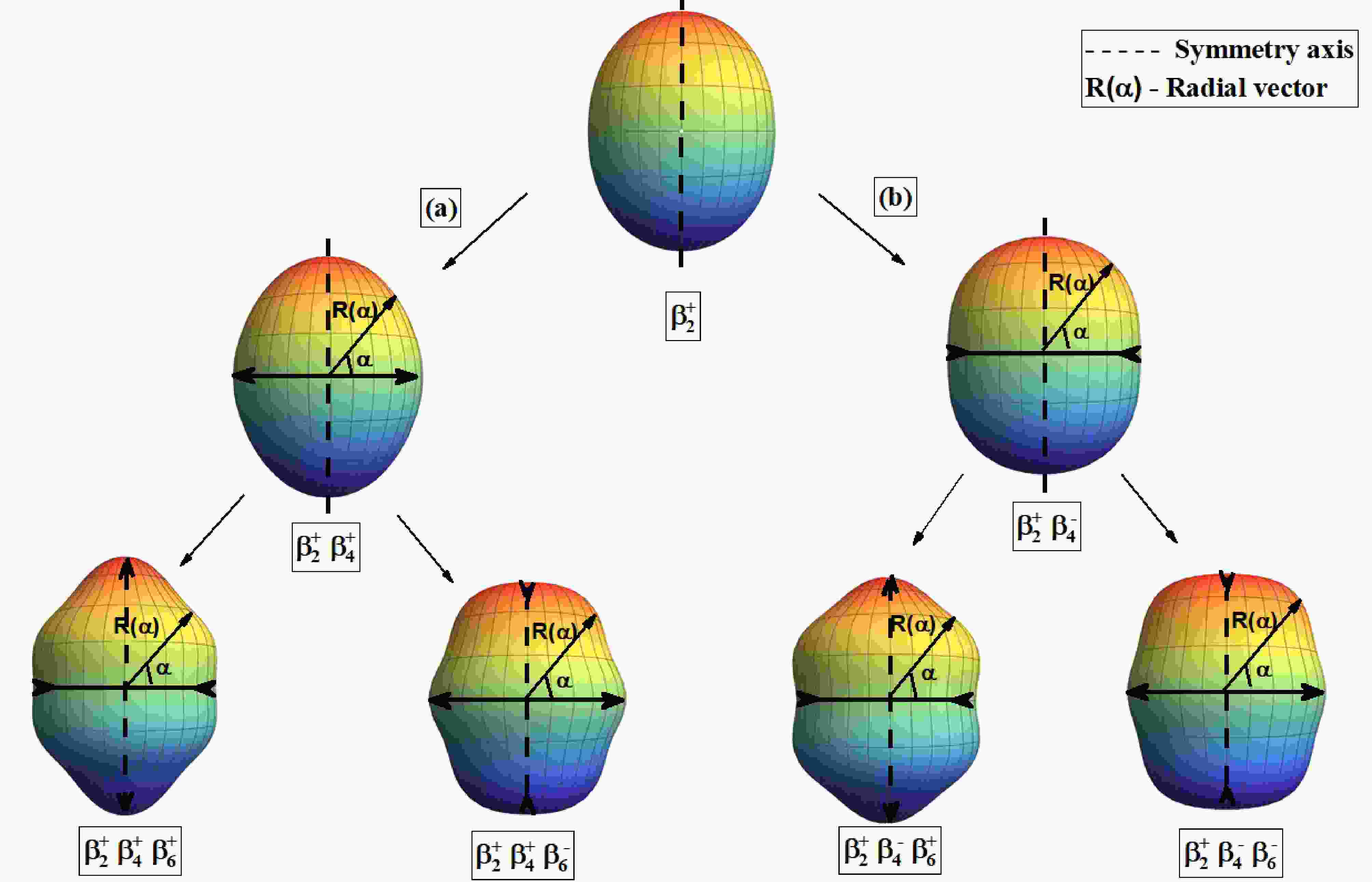 Figure 1.  (color online) Schematic diagram of shape evolution of the nucleus 246Es incorporating the quadrupole ($ \beta_2 $), hexadecapole ($ \beta_4^\pm $) and hexacontatetrapole ($ \beta_6^\pm $); with $ \beta_2 $=0.248, considering $ \beta_4 $ = $ \pm $0.05 and $ \beta_6 $ = $ \pm $0.1