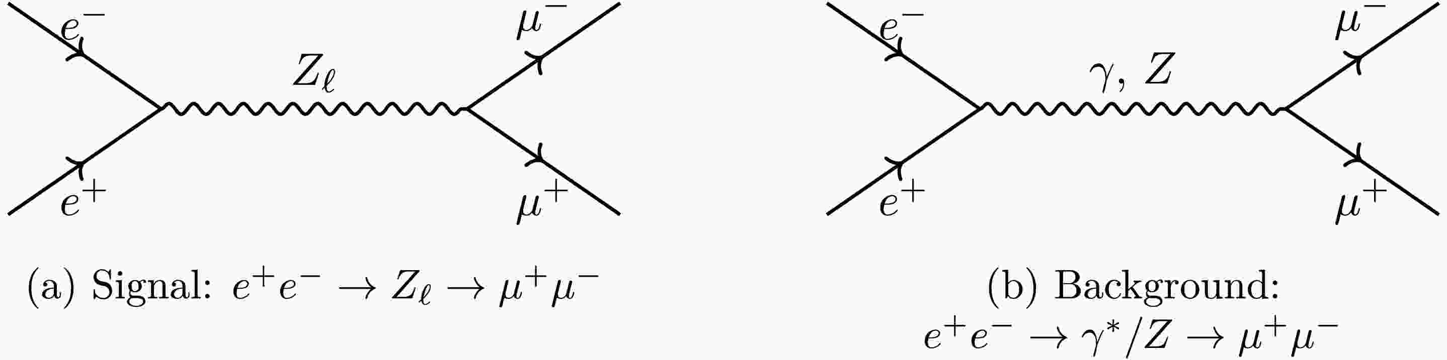 $ e^+e^- \to \gamma^*/Z \to \mu^+\mu^- $ . This background is theoretically well understood and experimentally clean, allowing deviations from the SM prediction to be directly attributed to the presence of a$ Z_\ell $ contribution [33]. Reducible backgrounds from processes such as$ e^+e^- \to \tau^+\tau^- $ or multihadronic final states are negligible once standard selection criteria are applied. For this reason, the di-muon channel provides a uniquely sensitive and robust avenue to search for a leptophilic photon at future lepton colliders. The signal and background processes are illustrated in Fig. 1.