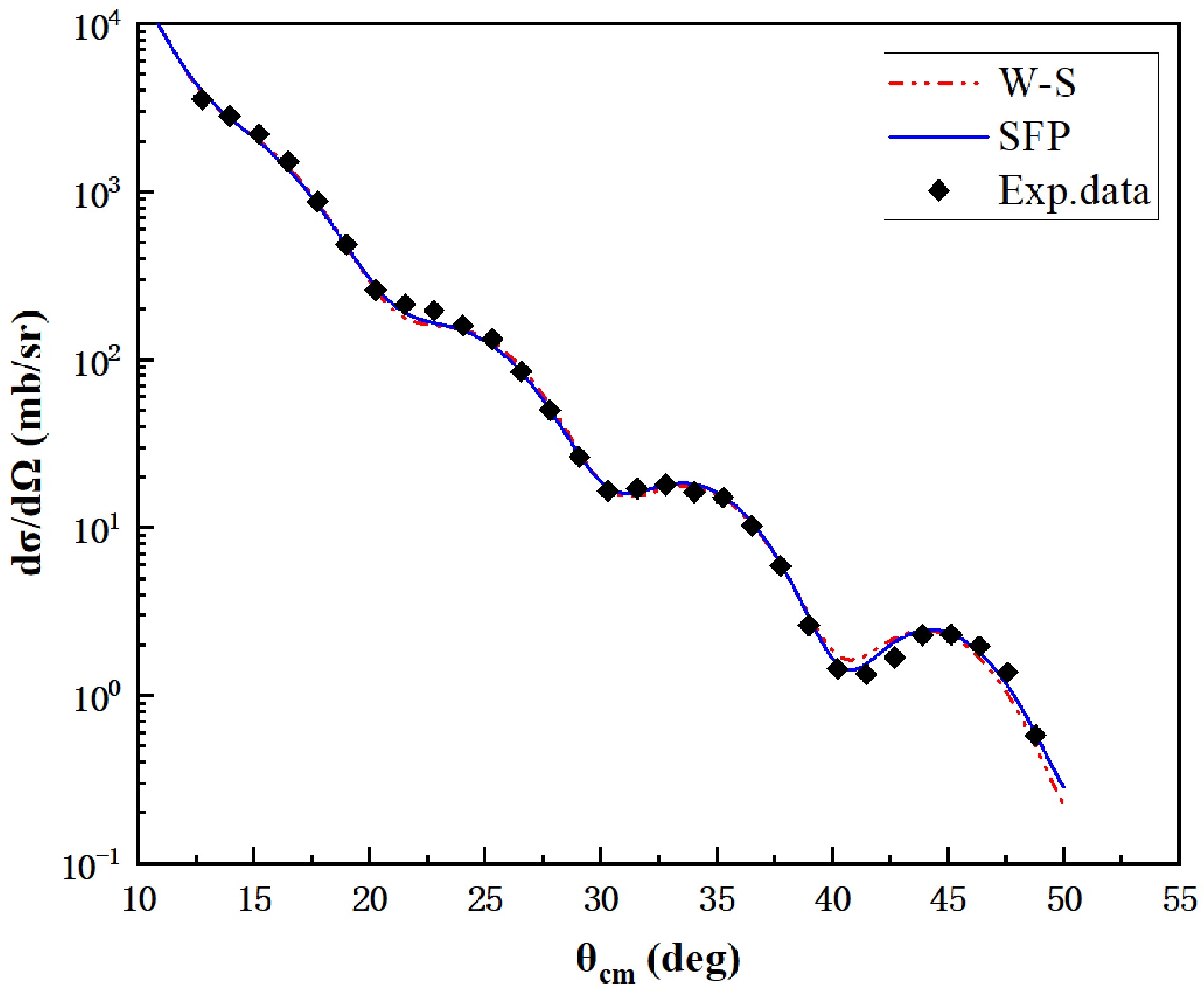 Figure 3. The fitting results of 26Mg(7Li,7Li) elastic scattering at 42 MeV. The black solid diamonds represent the experimentally measured elastic scattering angular distribution, and the blue solid line and red dashed line represent the results obtained using the SFP and the Woods-Saxon potential for fitting, respectively. The uncertainties are too minor to be discernible in the plot.