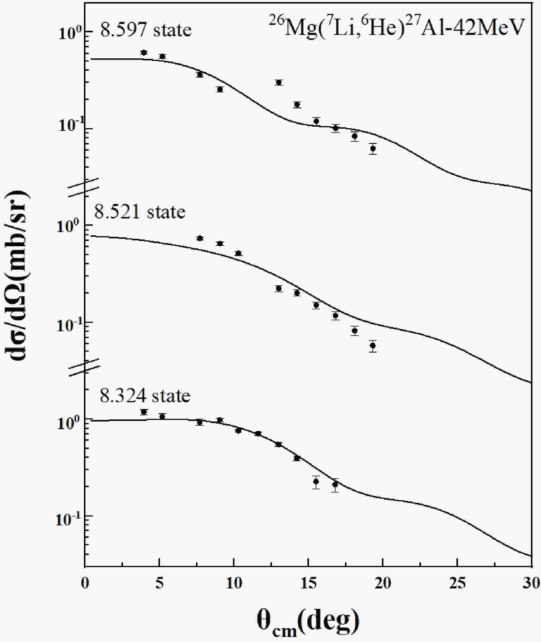 $ ^{17}{\rm{F}}_0 $ and kinematic calculations, the 8.324 MeV states in 27Al, which correspond to the 52.8 keV resonance of 26Mg+p, as well as the 7.858, 8.324, 8.521, 8.597, 8.753, and 9.080 MeV states, which are located near the threshold, were accurately identified. The angular distributions of three states are shown in Fig. 4. The above excitation energies are based on literature data[24−26].