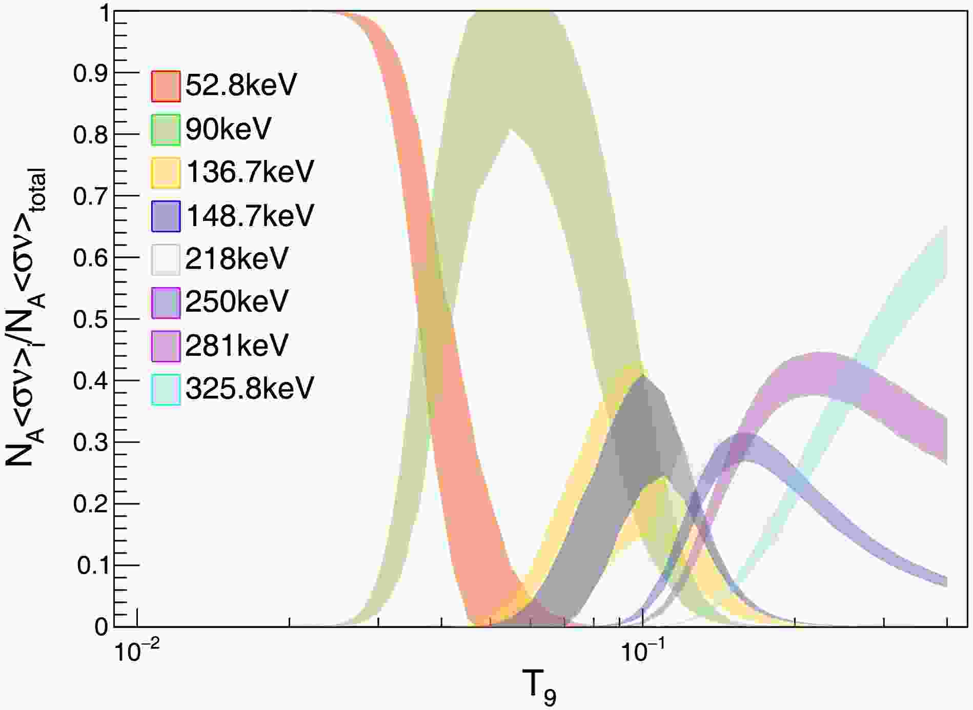 (5) $ N_A $ is Avogadro's constant, k is Boltzmann's constant,$ \mu $ is the reduced mass, T is the stellar temperature,$ E_R $ is the resonance energy, and$ \omega\gamma $ is the resonance strength. The resonance strength for narrow resonances is calculated as follows:$ \omega\gamma_i=\frac{2J_i+1}{(2J_p+1)(2J_t+1)}\frac{\Gamma_p\Gamma_{\gamma}}{\Gamma_{{\rm{total}}}}, $