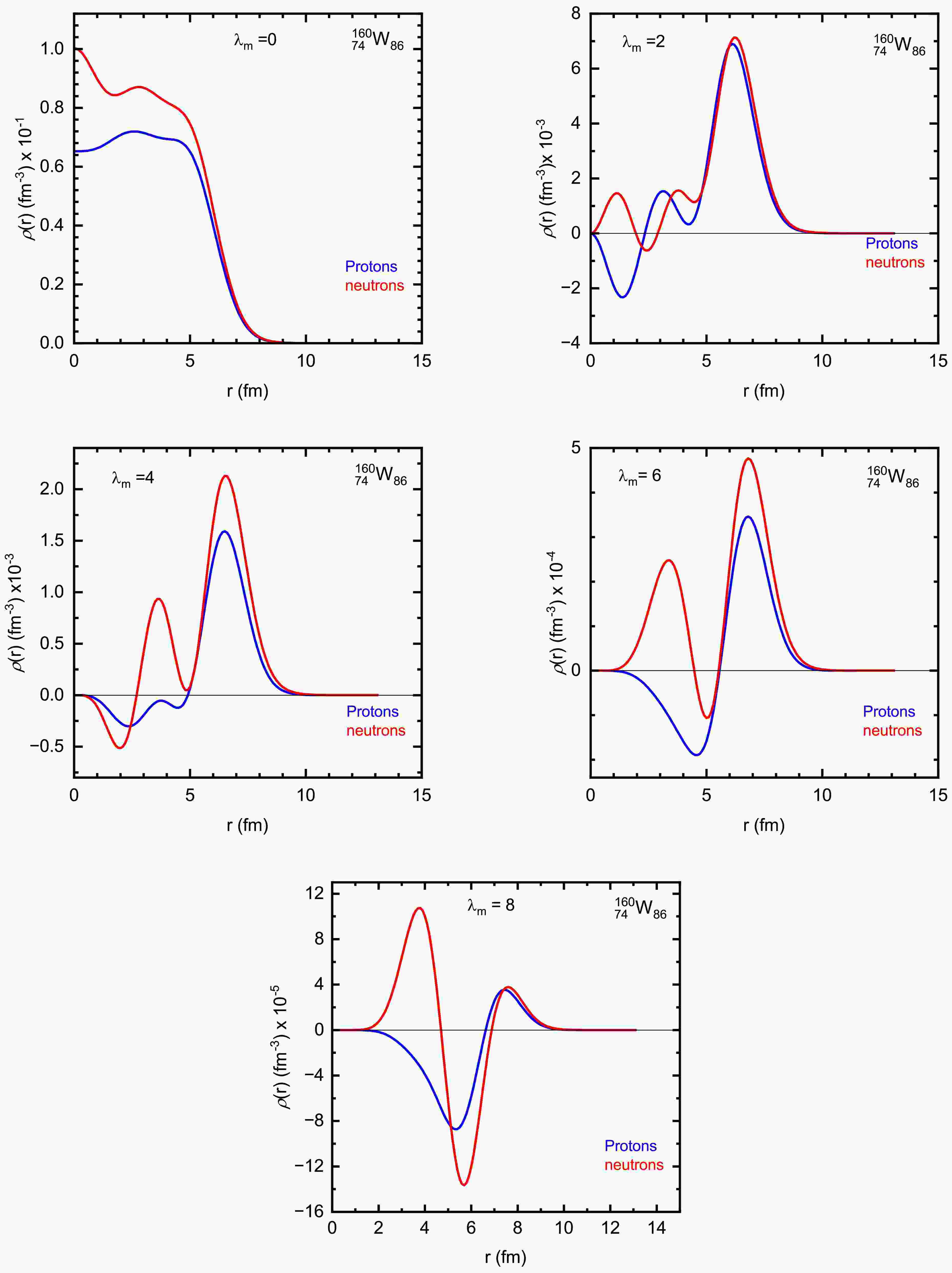 $ ^{160} $ W ($ Z = 74 $ ,$ N = 86 $ ), calculated using the Hartree-Fock-Bogoliubov (HFB) method with the Gogny D1S effective interaction. The total intrinsic densities are expanded in terms of spherical harmonics$ Y_{\lambda_m 0} $ up to the eighth multipole, allowing for the detailed examination of nuclear shape deformation. The first multipole ($ \lambda_m = 0 $ ), shown in Fig. 1(a), represents the spherical part of the density. It displays the expected saturation in the nuclear interior and a gradual fall-off near the surface, with the neutron density extending slightly further due to the neutron-rich nature of the nucleus. The second multipole component (Fig. 1(b)) captures the dominant deformation and reveals a clear prolate pattern in both proton and neutron densities. While their radial shapes are similar, slight amplitude differences are noticeable at larger radii. This component is largely responsible for the global deformation of the nucleus. The fourth, sixth, and eighth multipole components [Figs. 1(c)–1(e)] exhibit increasingly oscillatory structures, reflecting finer details in the density distribution and surface geometry. The fourth multipole introduces surface modulations, whereas the sixth and eighth multipoles show more pronounced oscillations and radial sign changes, particularly in the surface region ($ r \sim 5 $ –10 fm). These higher-order multipoles, though smaller in magnitude, are essential for accurately reproducing the detailed shape and structure of the nucleus. The observed differences between the neutron and proton components at each multipole order underscore the presence of isovector deformation effects. These findings highlight the importance of including both isoscalar and isovector contributions when modeling deformed nuclei, particularly in transitional regions of the nuclear chart such as tungsten isotopes.