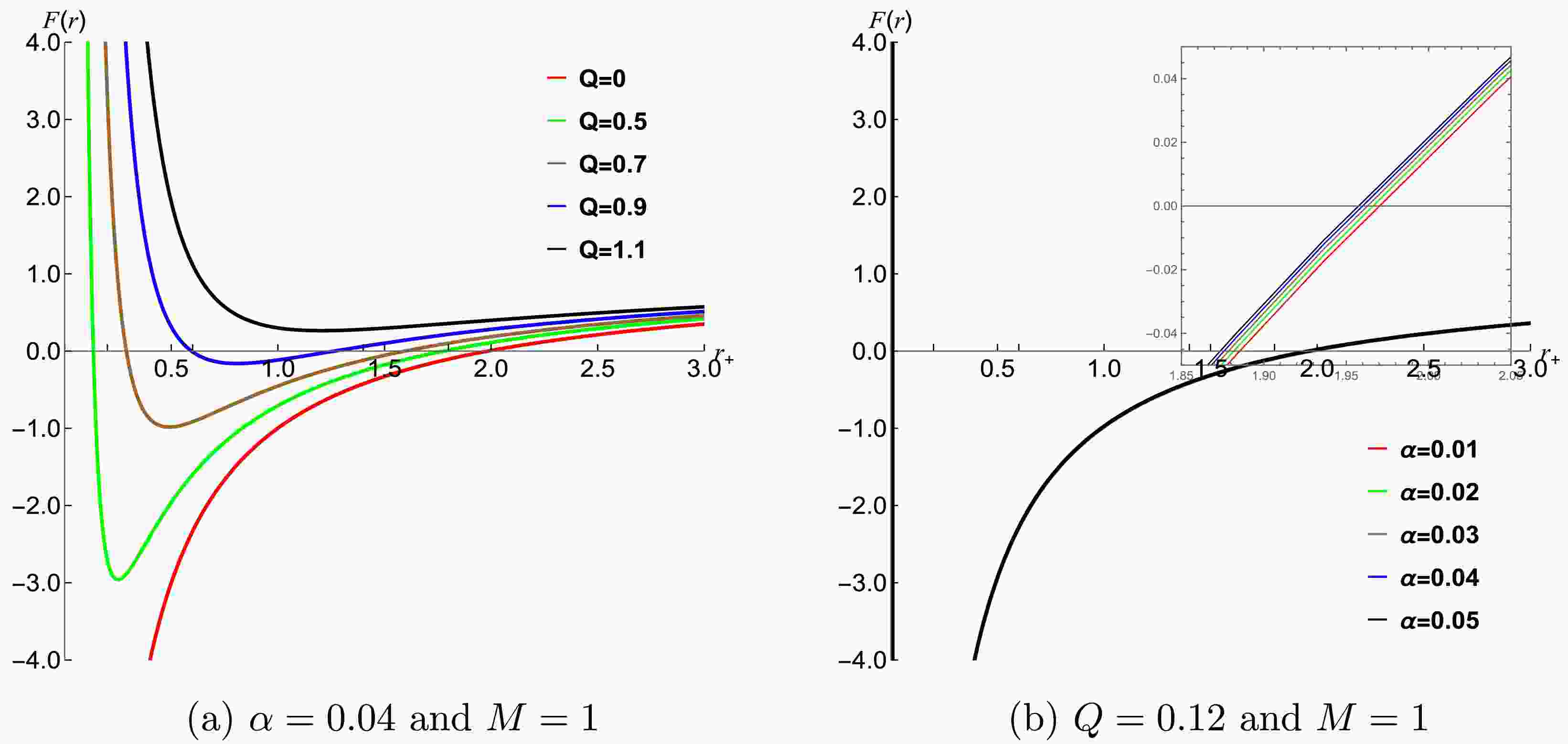 $ F(r)=0 $ , Figure (1) shows the behavior of the event horizon for different values of Q and α. From Figure 1(a), it is seen that the size of the black hole increases with the increase of the charge Q. When$ Q=1.1 $ , a naked singularity appears, which means that no black hole exists when Q exceeds the threshold. When Q is smaller than the threshold, two simple zeros appear, corresponding to two event horizons, as shown in Figure 1(a) for$ Q=0.5,0.7,0.9 $ . In Figure 1(b), it is clear that the size of the black hole is also affected by the coupling constant α, and and the size of the black hole increases as α increases.The event horizon is located at