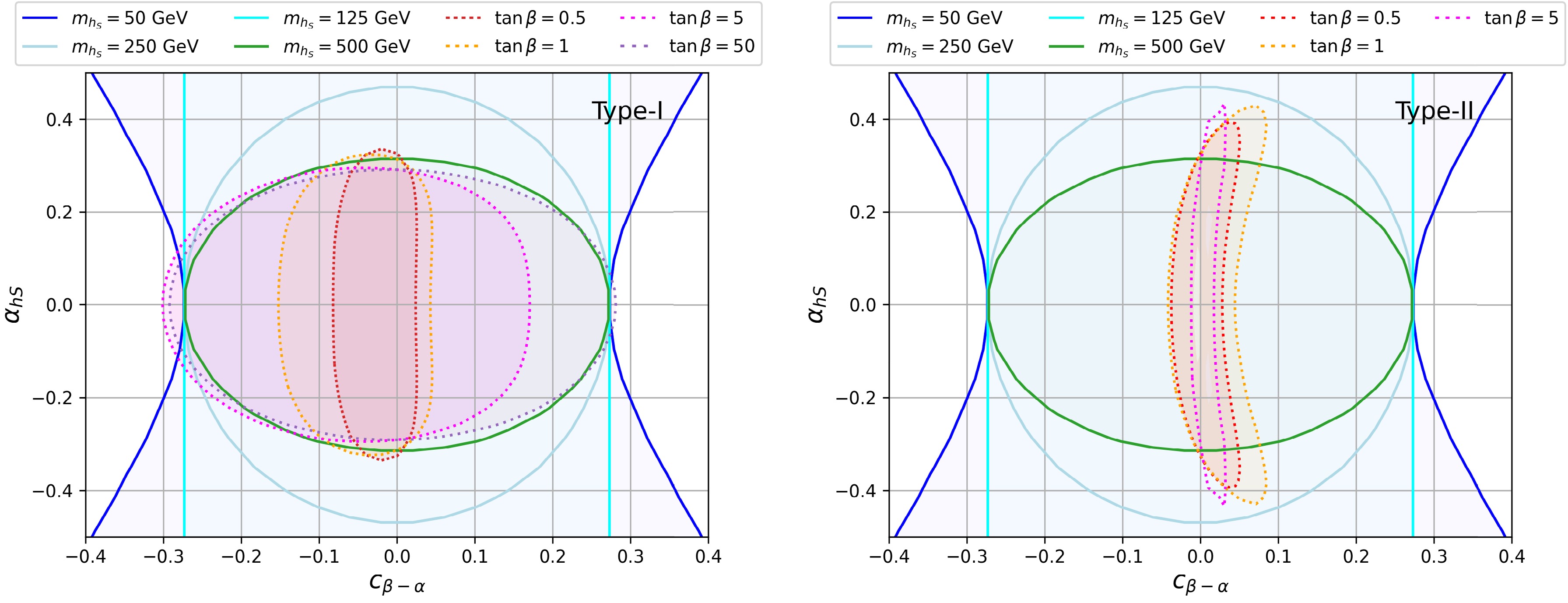 $ m_{h_S} $ vs.$ \alpha_{hS} $ plane for various$ c_{\beta-\alpha} $ . For increasing$ |c_{\beta-\alpha}| $ , the allowed region shifts to the left. For$ m_{h_S}>125 $ GeV, the allowed range of$ \alpha_{hS} $ reduces, whereas for$ m_{h_S}<125 $ GeV, larger values of$ \alpha_{hS} $ are allowed. For$ |c_{\beta-\alpha}| $ slightly above 0.275,$ \alpha_{hS}=0 $ is no longer allowed, and two branches appear.We explore the interplay between