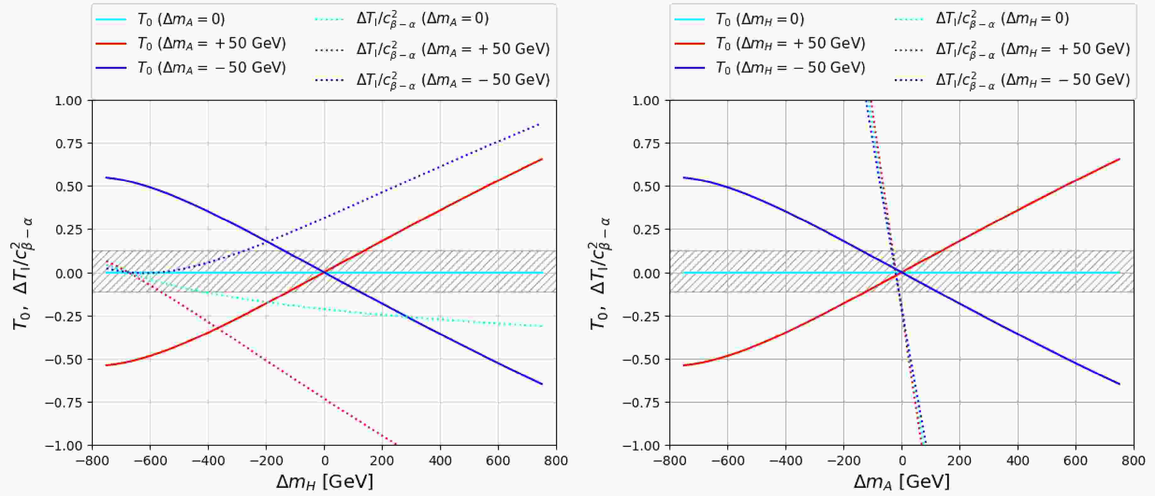 $ T_0 $ (solid lines) and$ \Delta T_{\rm{I}}/c^2_{\beta-\alpha} $ (dotted lines) with varying$ \Delta m_H $ (left) and$ \Delta m_A $ (right). The cyan, red, and blue lines indicate$ \Delta m_{A,H}= $ 0, + 50 GeV, and −50 GeV, respectively. The grey hatch area is the 1σ region of the T observable.$ m_{H^\pm} $ is chosen to be 800 GeV.However, the