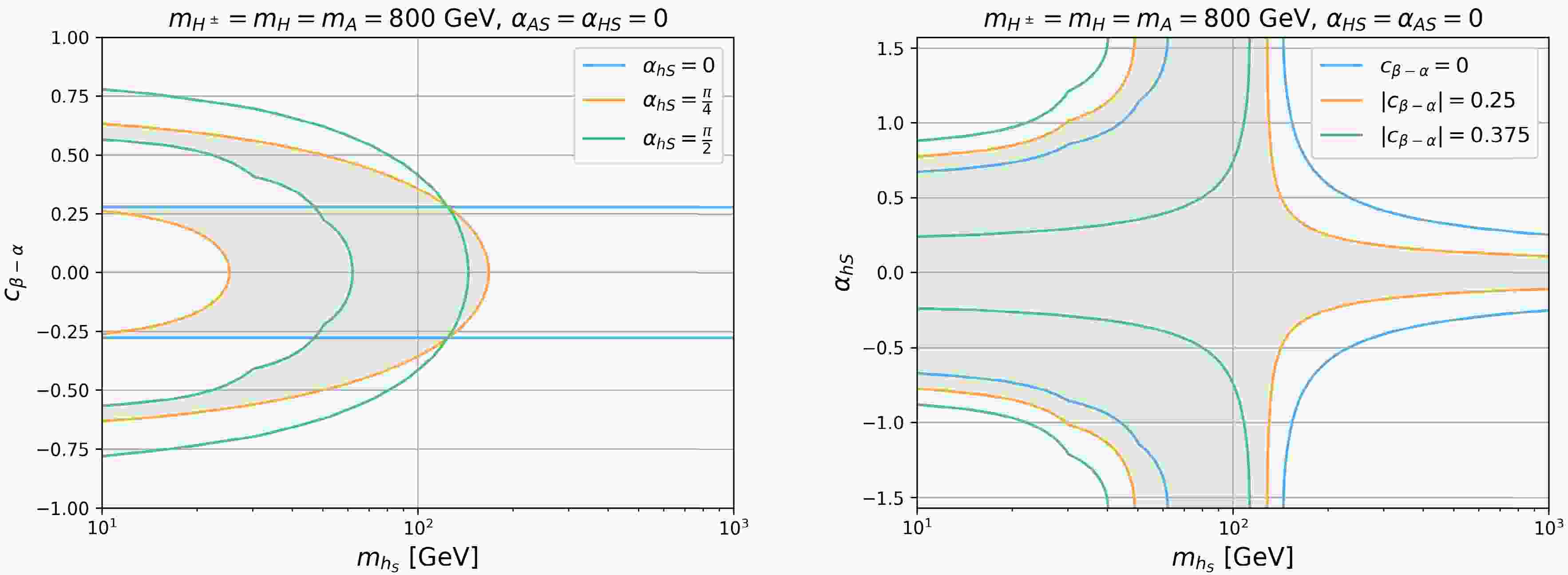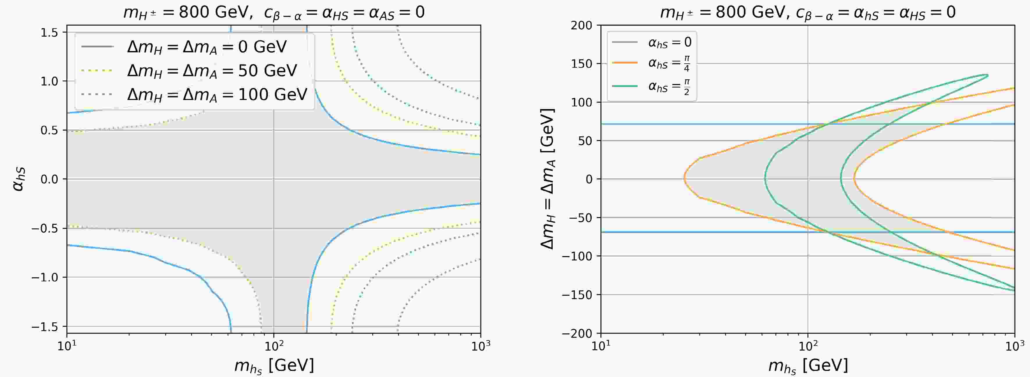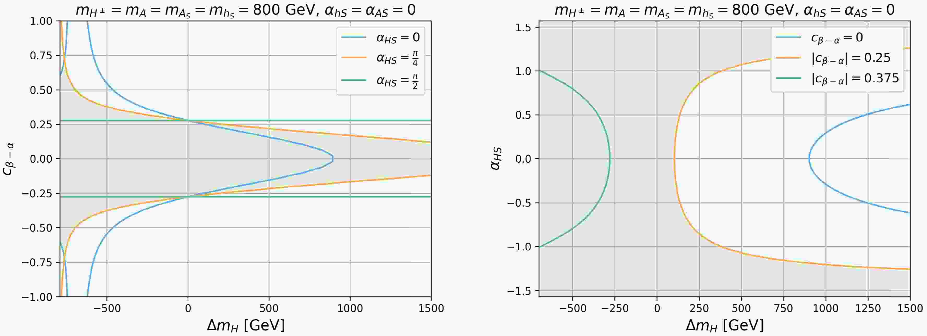 $ \Delta m_{H} $ vs.$ c_{\beta-\alpha} $ plane (left panel) for$ \alpha_{HS} $ =0 (blue),$ \pi/4 $ (orange), and$ \pi/2 $ (green) and the$ \Delta m_{H} $ vs.$ \alpha_{HS} $ plane (right panel) for$ |c_{\beta-\alpha}| $ =0 (blue), 0.25 (orange), and 0.375 (green). We set$ m_{H^\pm}=m_A= m_{h_S}= $ $ m_{A_S}=800 $ GeV and$ \alpha_{AS}=\alpha_{hS}=0 $ .The right panel of Fig. 9 presents the