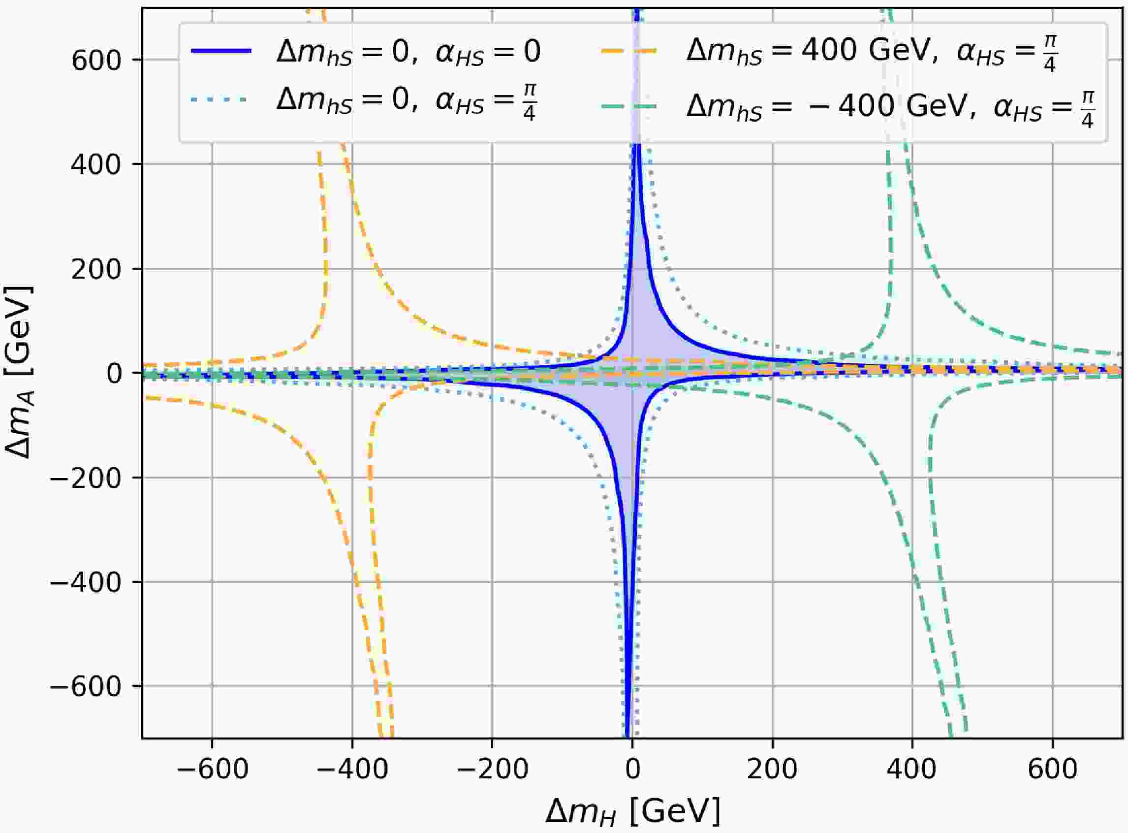 $ \Delta m_H $ vs.$ \Delta m_A $ in Case-III with$ c_{\beta-\alpha}=\alpha_{hS}=\alpha_{AS}=0 $ .$ m_{H^\pm} $ is set to be 800 GeV. The regions enclosed by the dark solid blue and light dashed blue curves indicate$ \Delta m_{hS}=0 $ and$ \alpha_{HS}=0 $ and$ \pi/4 $ , respectively. The orange and green regions indicate$ \Delta m_{hS}=\pm $ 400 GeV, respectively, and$ \alpha_{HS}=\pi/4 $ .When the singlet-like Higgs mass deviates from the charged Higgs mass, for instance,